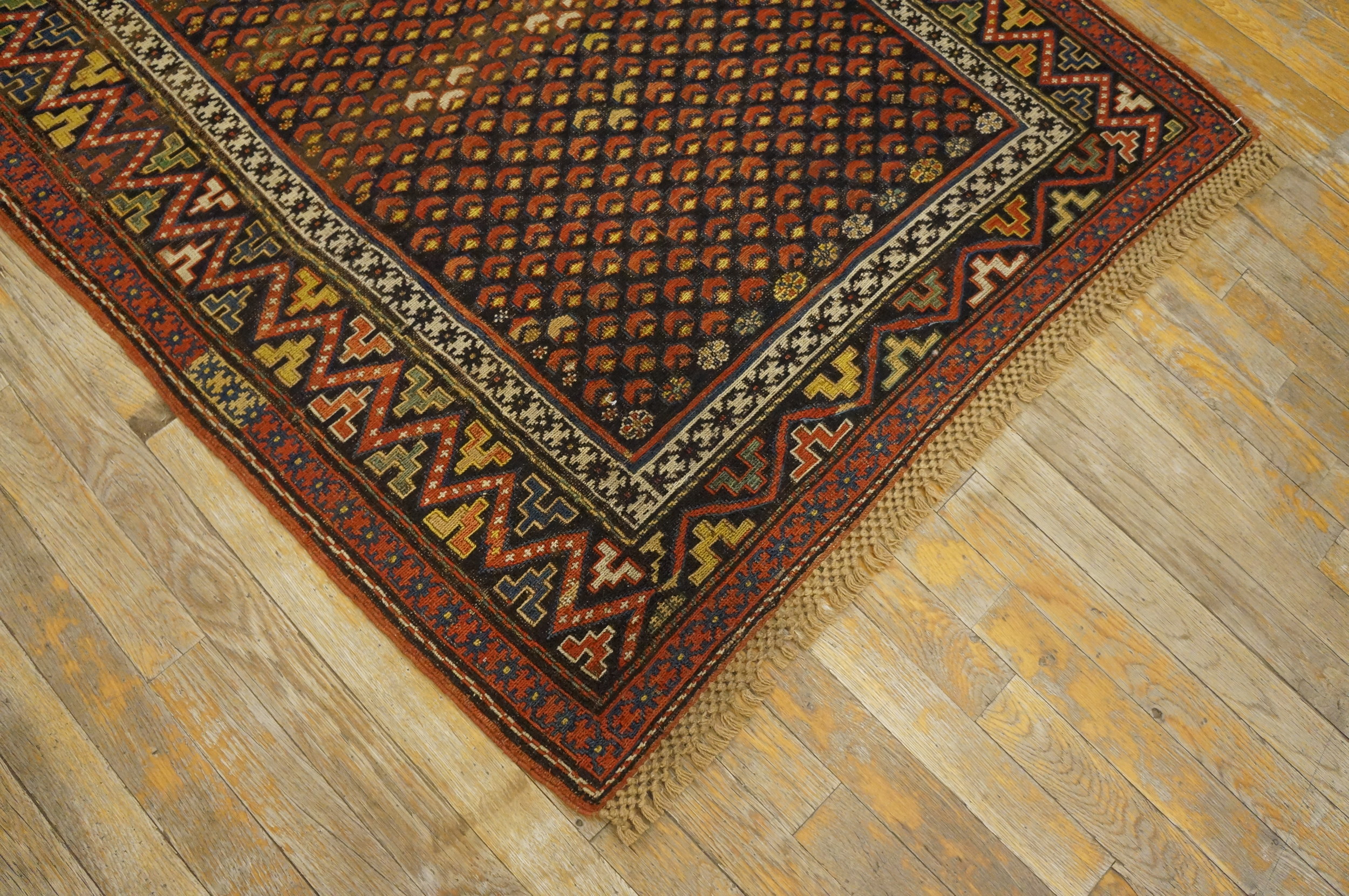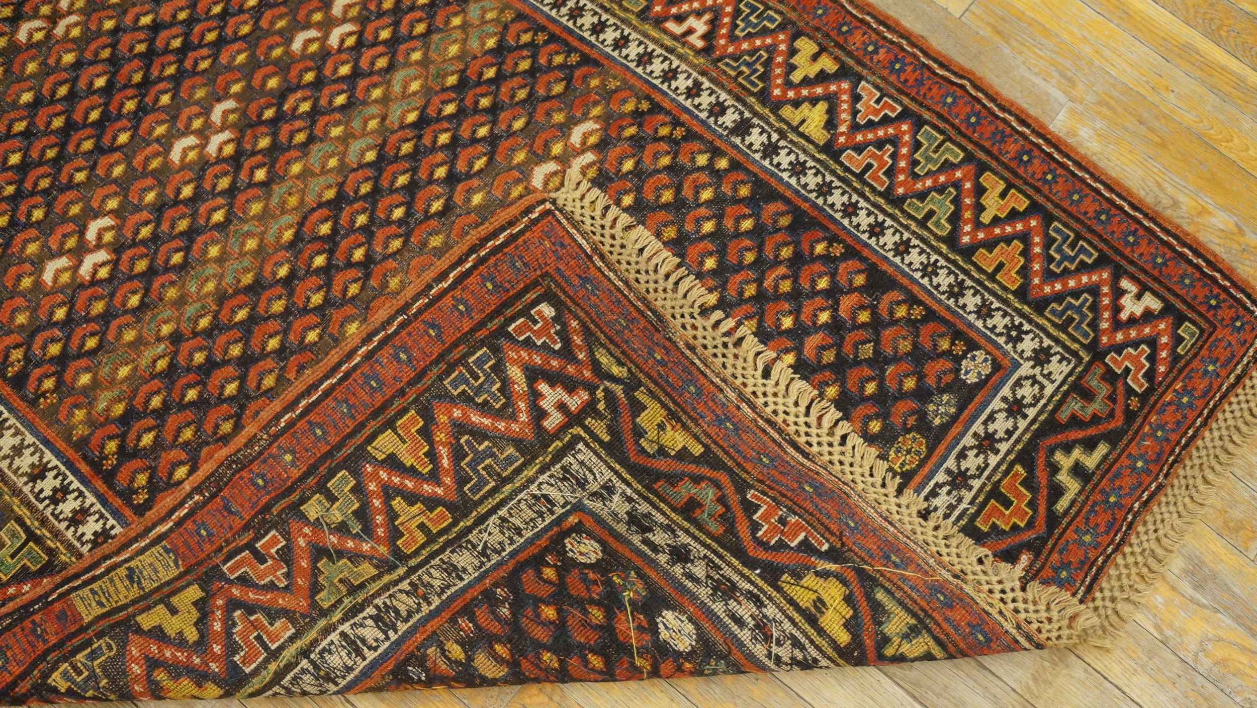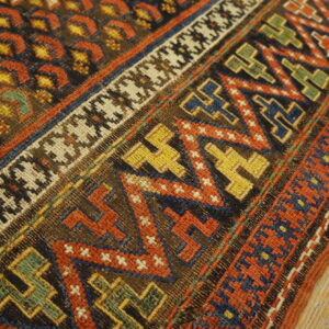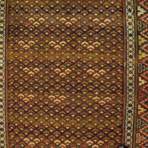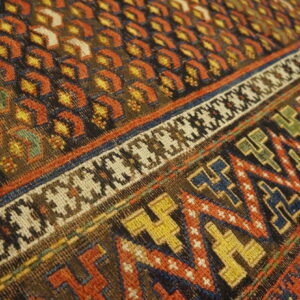 Antique Caucasian Hallway Runner Wool Rug, Country of Origin: Caucasus, Circa Date: 1890s. This exceptional late 19th-century textile represents the pinnacle of nomadic weaving traditions. Woven in the Sumak technique, which creates a durable, brocade-like surface, this piece showcases the bold, saturated palette characteristic of the region. The strong geometric vocabulary immediately identifies it as a product of the Caucasian rugs tradition, prized for its intensity and visual power.