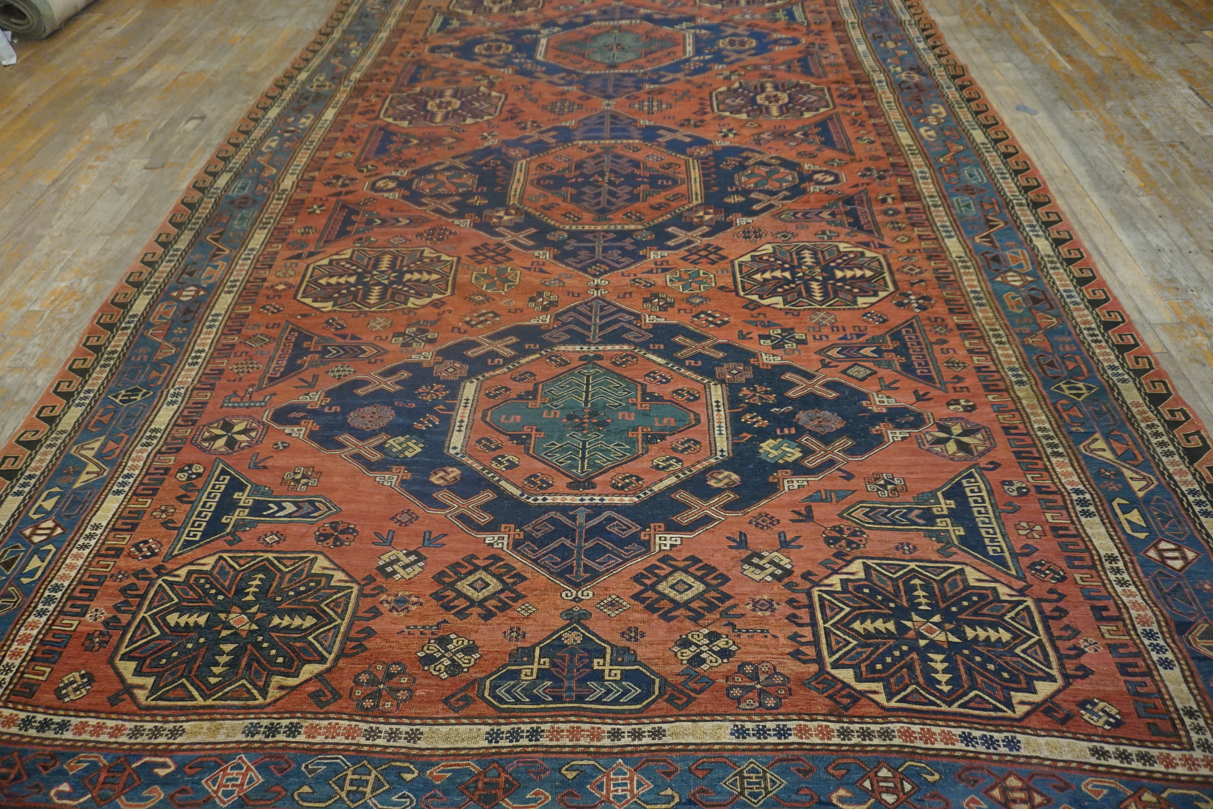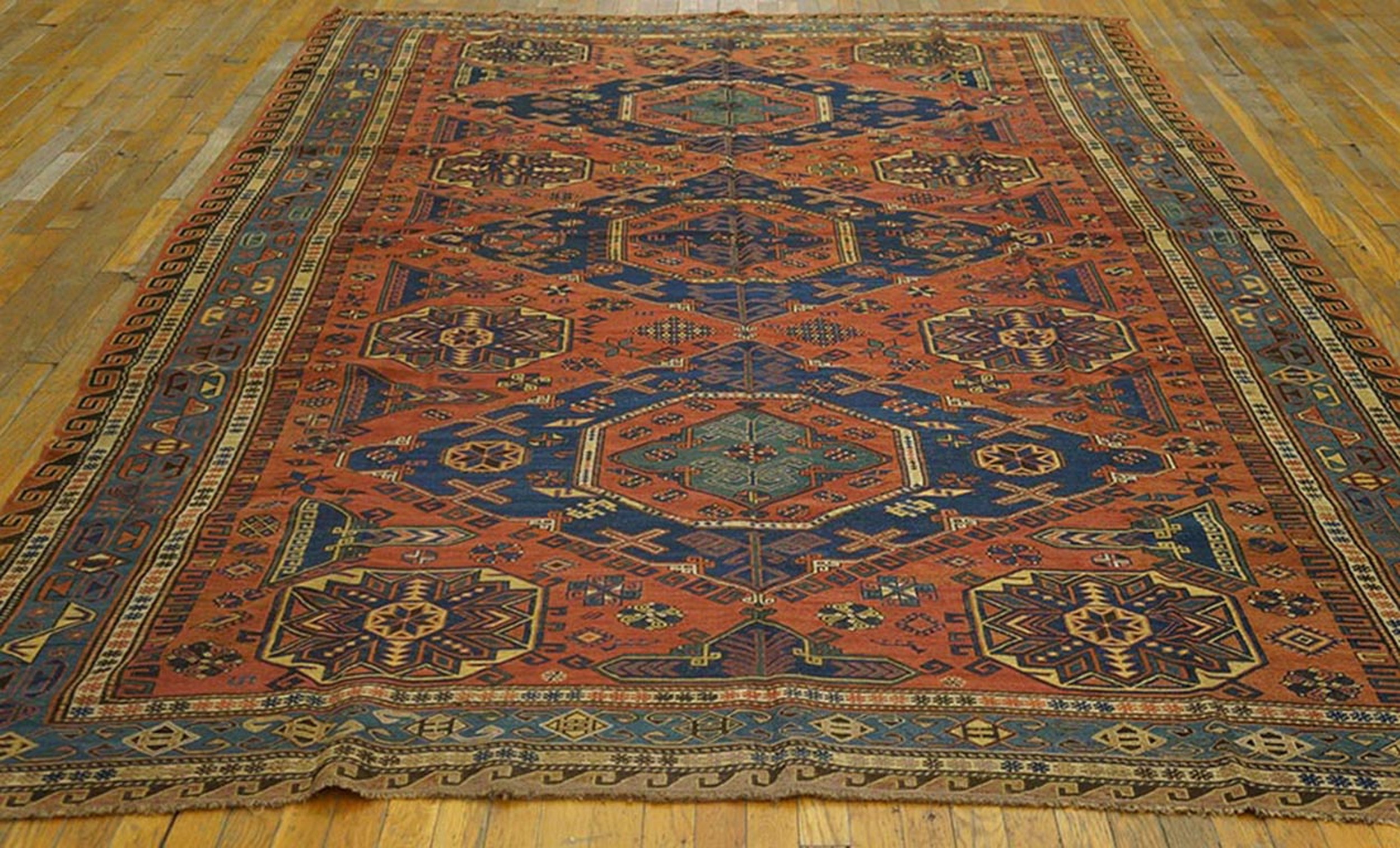 The palette is defined by a striking interplay of deep indigo and vibrant, earthy terracotta, characteristic of the best natural dyes of the era. The bold, angular medallions are anchored against the rust field, creating a dynamic visual rhythm suitable for substantial room size rugs and demanding attention in any sophisticated interior.