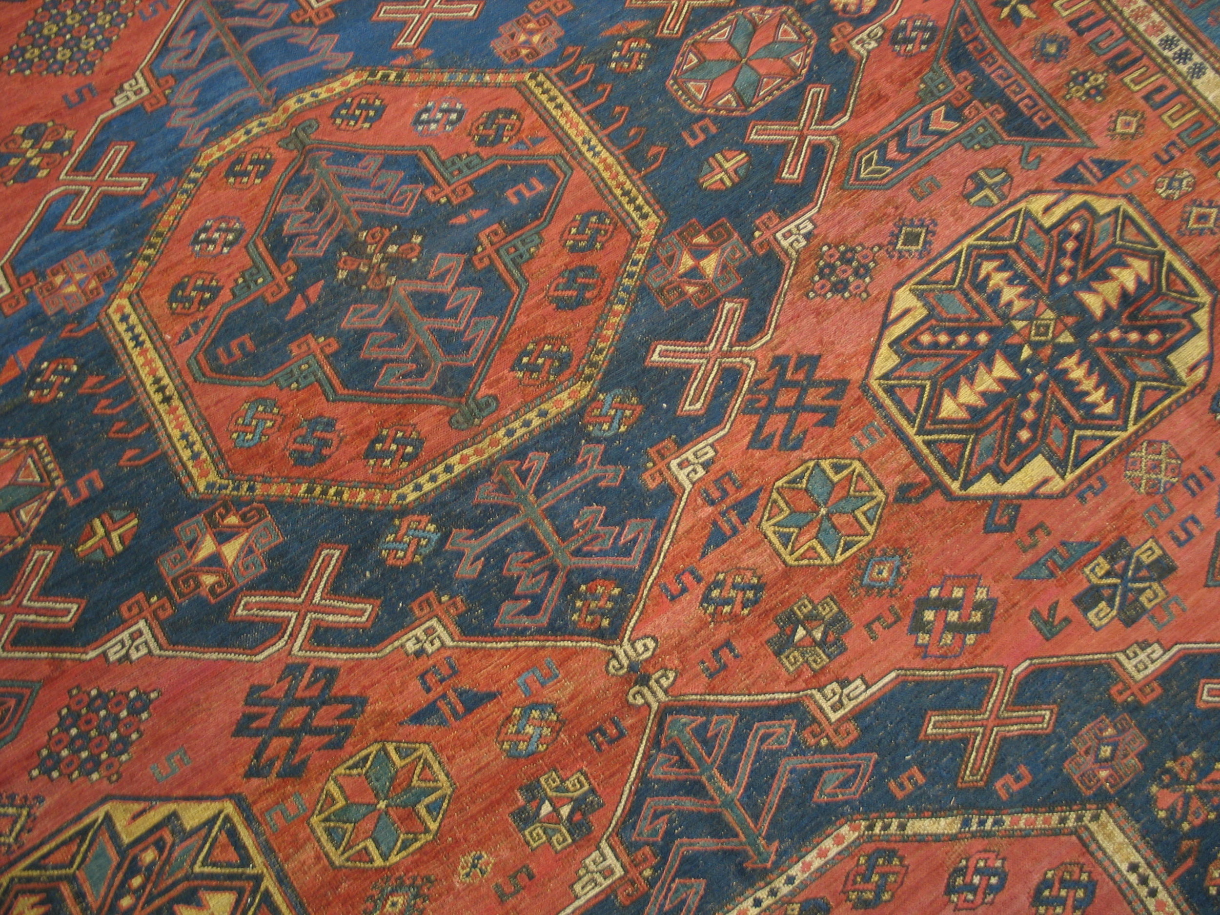 Executed in a highly stylized geometric vernacular, the design utilizes an allover rug composition, where repeating star and cruciform motifs fill the entire field without reliance on a single central medallion. The precision of the supplementary weft wrapping technique highlights the complex tribal iconography and the intricate borders that frame the main design.