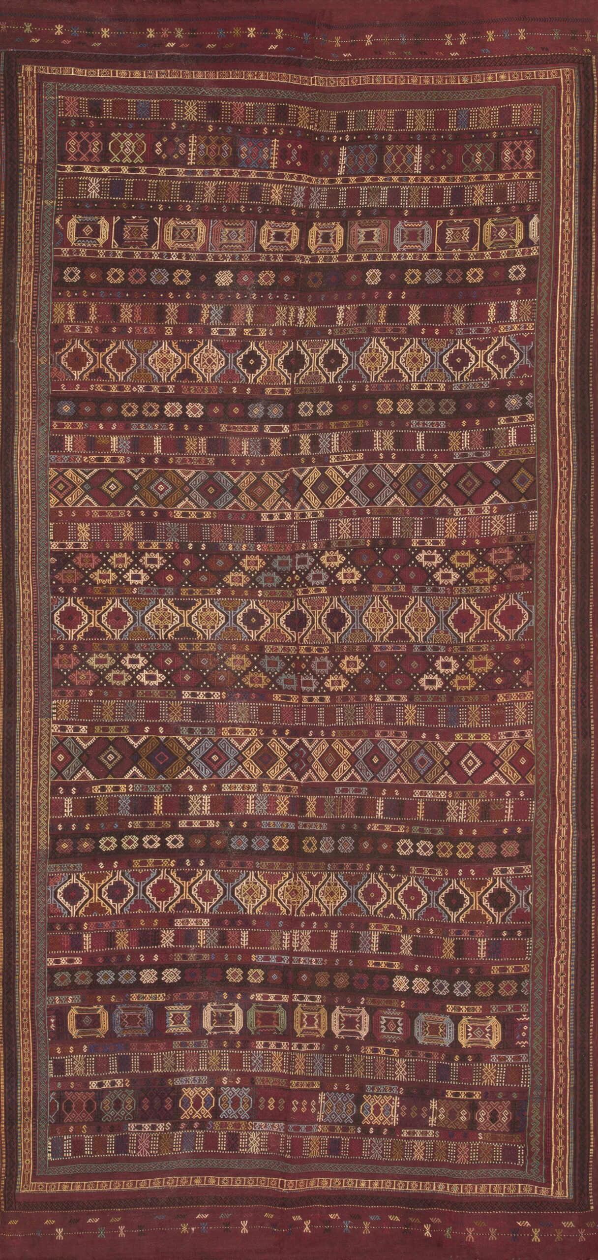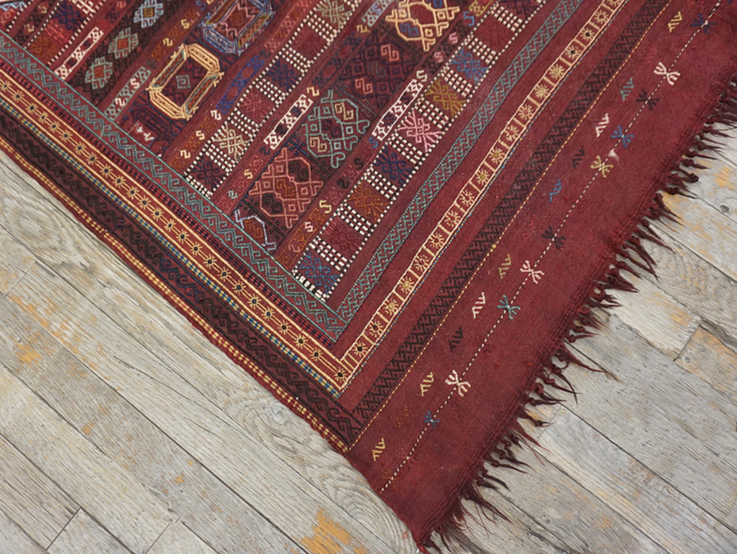 Given its elongated dimensions, this piece functions beautifully among hallway runner rugs, adding historical depth and texture to transitional areas. Such finely preserved examples of tribal flat weaves are increasingly rare in the market for antique rugs, representing a significant acquisition for the discerning collector of textile history.