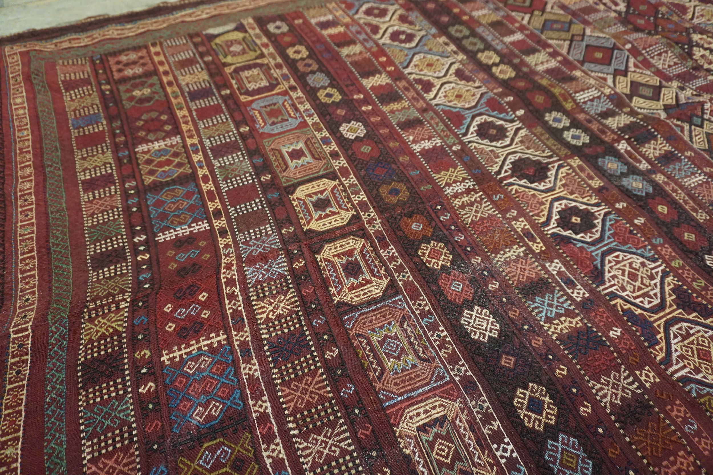 Antique Caucasian – Verneh Flat Weave Rug, Country of Origin: Caucasus, Circa Date: 1890s. This exceptional Verneh flat weave exemplifies the rich textile traditions of the Caucasian rugs region. Vernehs, known for their complex supplementary weft patterning, are highly prized examples of nomadic artistry, often serving as dowry pieces or ceremonial coverings.