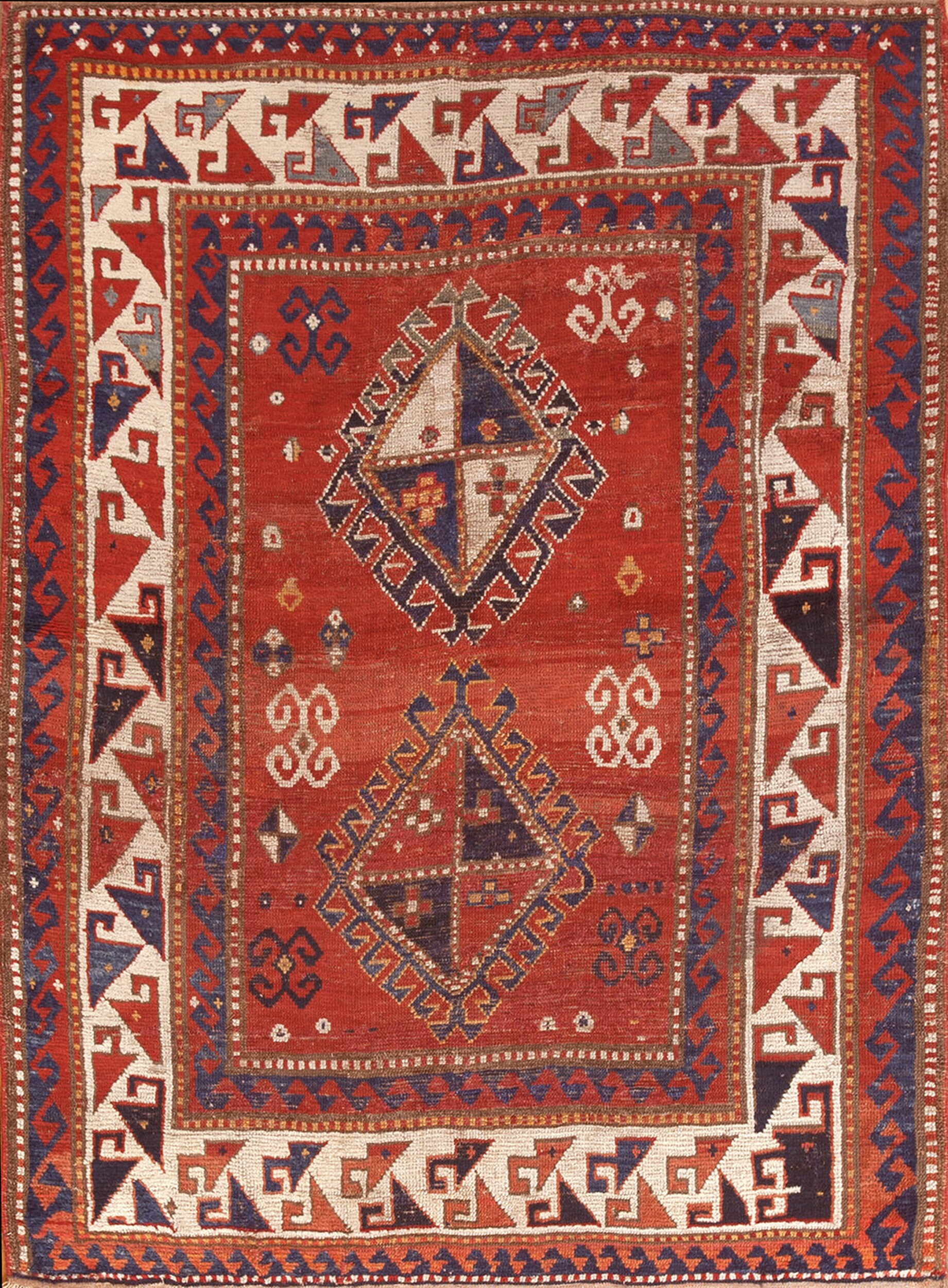 Woven in the high-mountain regions, this piece exemplifies the robust character of the Caucasian style. The design is defined by bold, rectilinear forms, characteristic of the region’s weaving traditions. The central field showcases two prominent, quartered diamond medallions surrounded by powerful, stylized hooks and latch-hook motifs, confirming its place among classic geometric rugs.