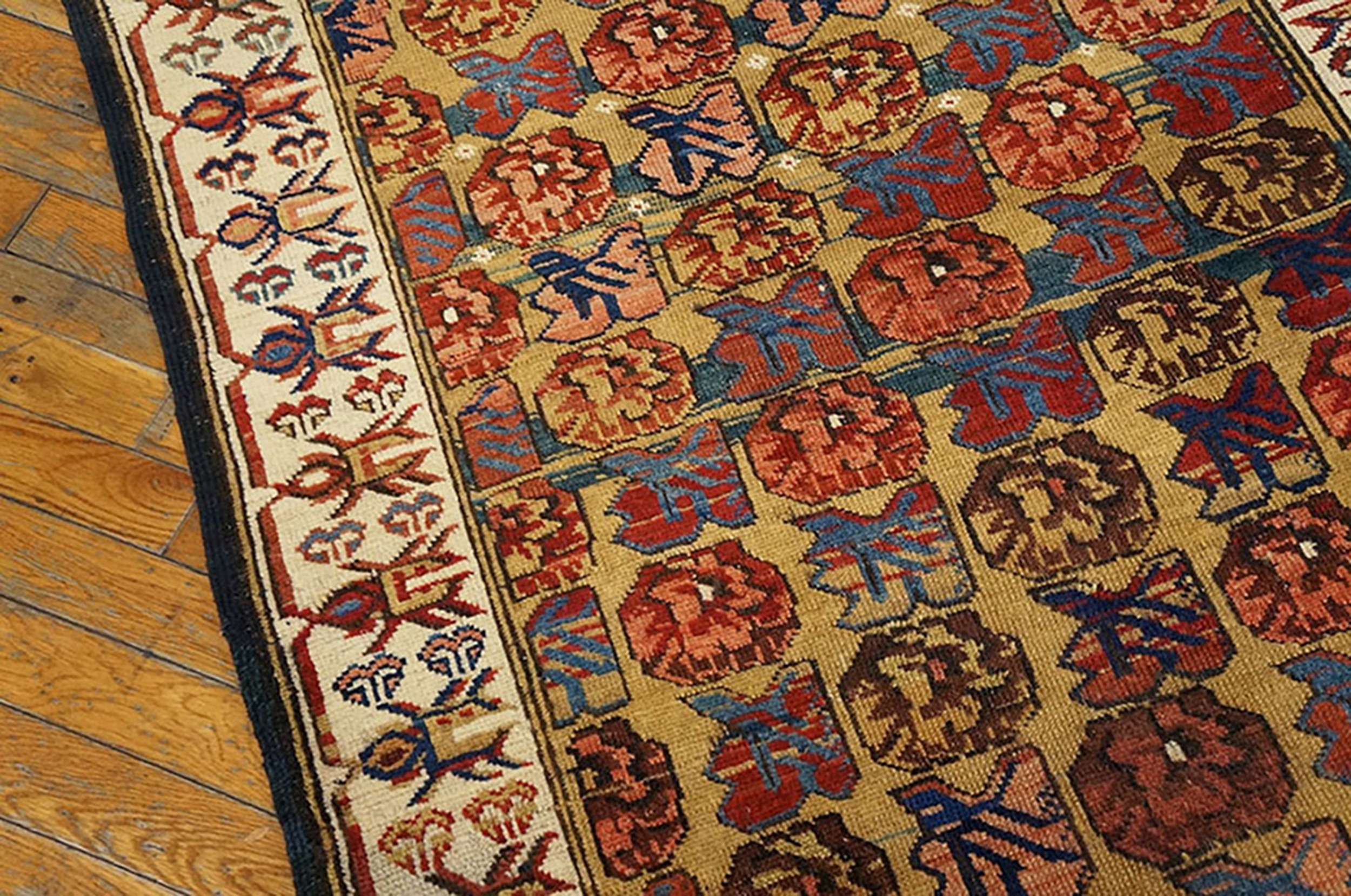 The palette is remarkably vibrant, showcasing the masterful use of natural dyes prevalent in the late 1800s. The central ground is defined by a luminous ochre tone, complemented by rich terracotta reds and contrasting sky blues, offering a superb example of gold, yellow, orange color rugs from the region.