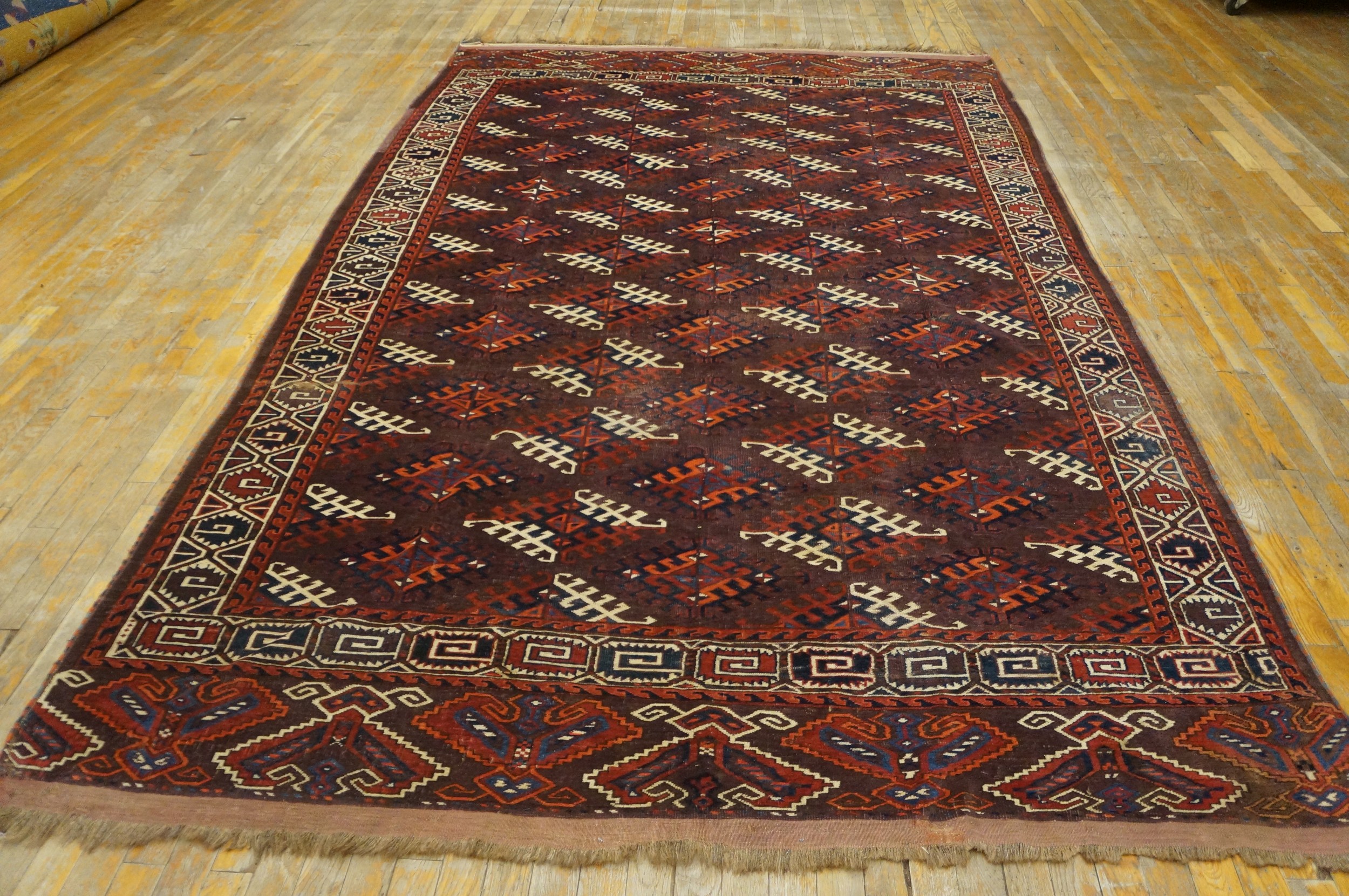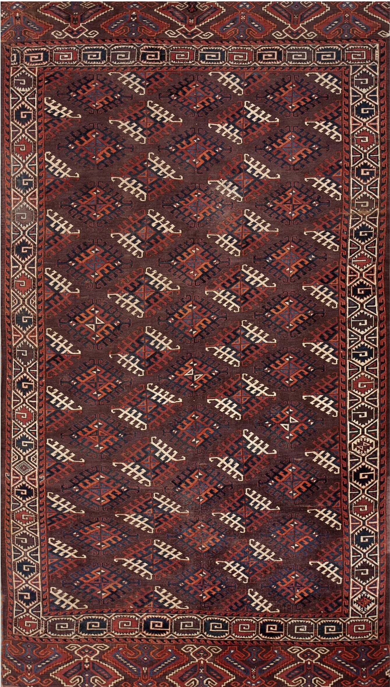 Antique Turkmen Yamoud Central Asian Allover Geometric Knotted Rug, Country of Origin: Central Asian, Circa Date: 1880s. This exceptional example of yamoud weaving showcases the deep, saturated palette characteristic of 19th-century Turkmen nomadic production. The field is dominated by a rich, earthy ground color, providing a dramatic backdrop for the intricate tribal motifs and powerful, repeating guls.