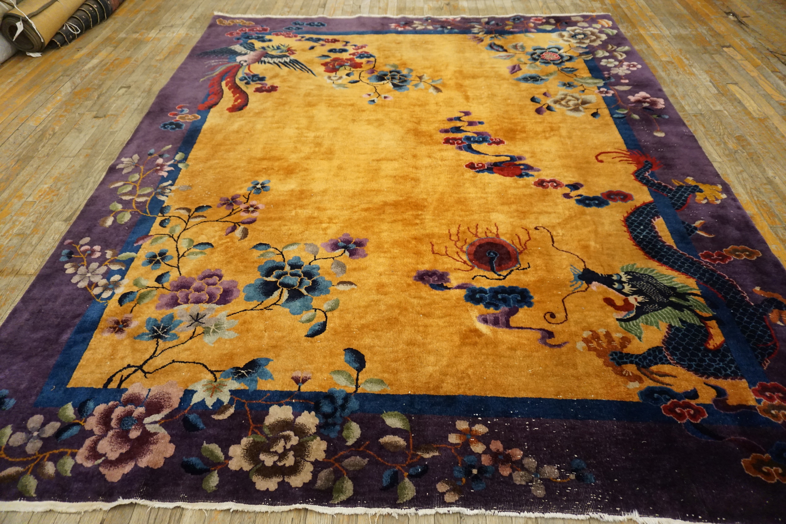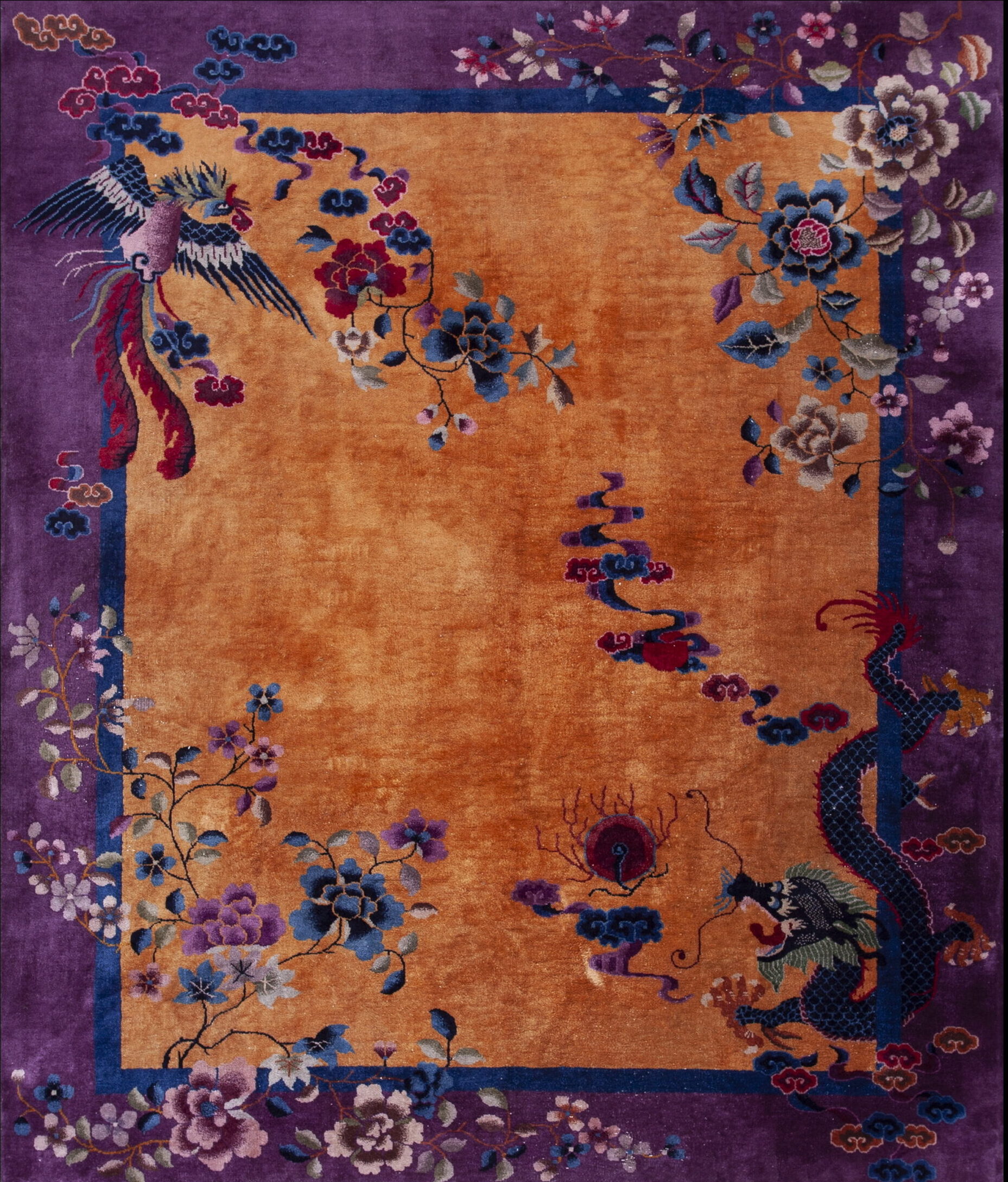 Executed in a substantial scale, this piece is ideally suited for grand interiors, functioning perfectly among room size rugs. The composition features iconic Chinese mythological figures, including a magnificent, sweeping dragon and a soaring phoenix, both rendered with dynamic movement and brilliant detail against the expansive field.