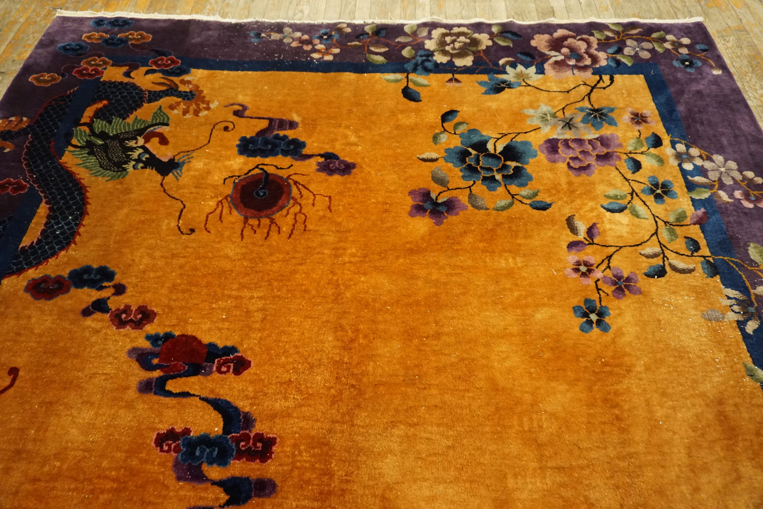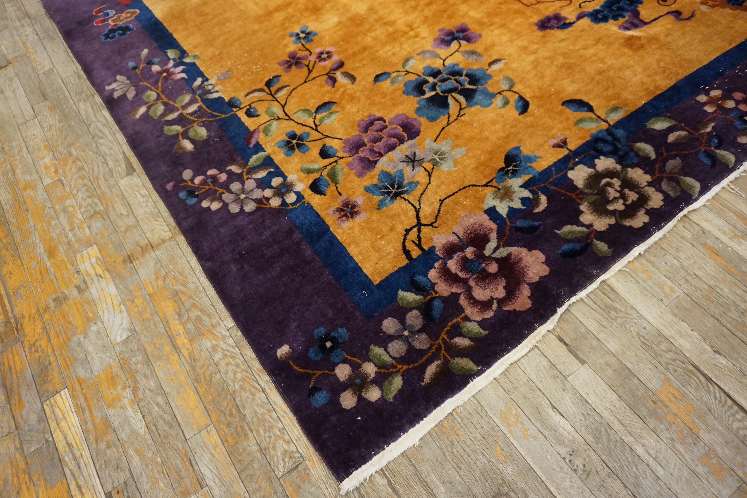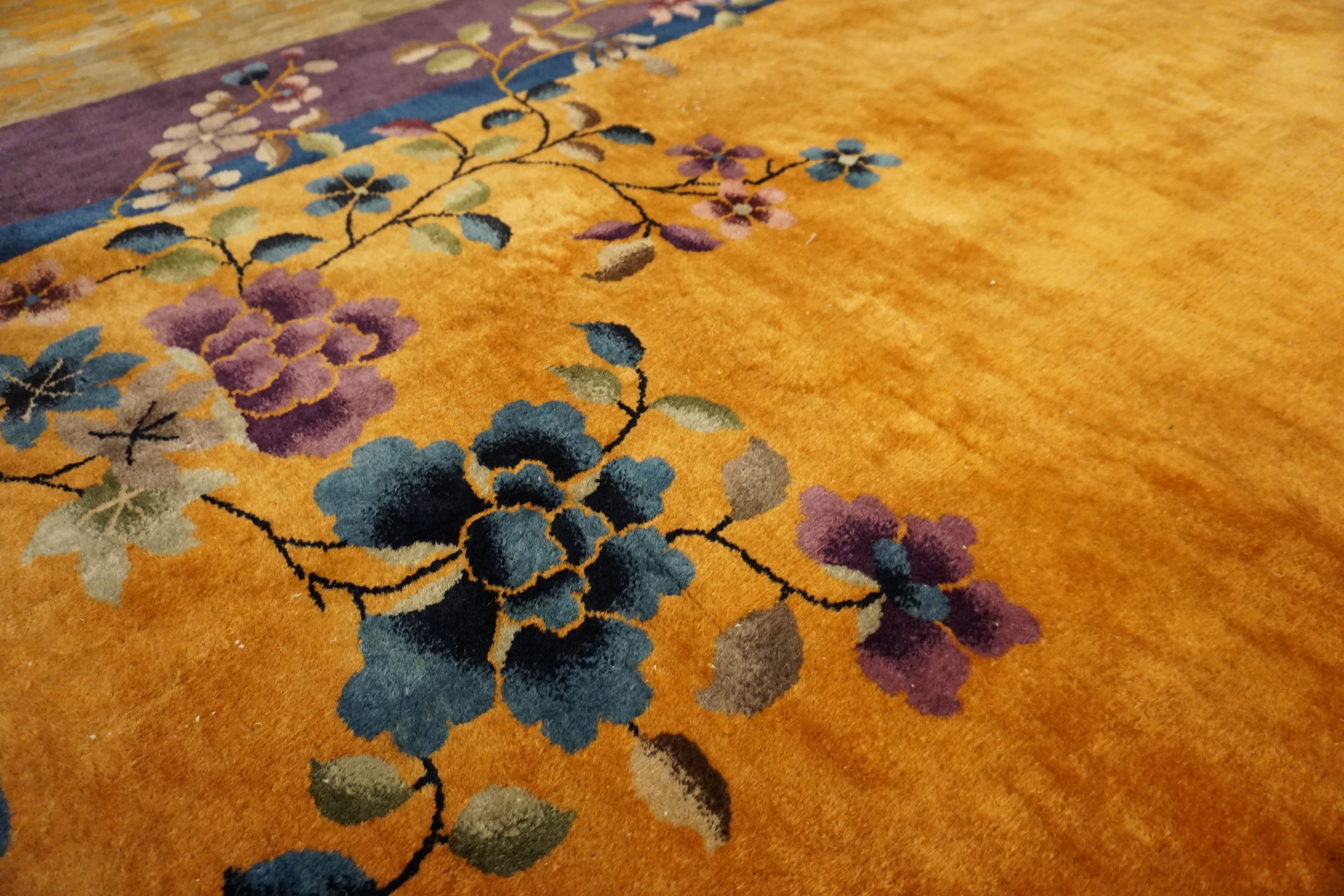 Yellow / Gold Orange Floral 1920s Hand Knotted Pile Wool Antique Rectangle Rug, Circa Date: 1920s. This exceptional example of early 20th-century weaving represents the pinnacle of the Chinese Art Deco movement, offering a dramatic visual statement rarely seen in traditional antique rugs.