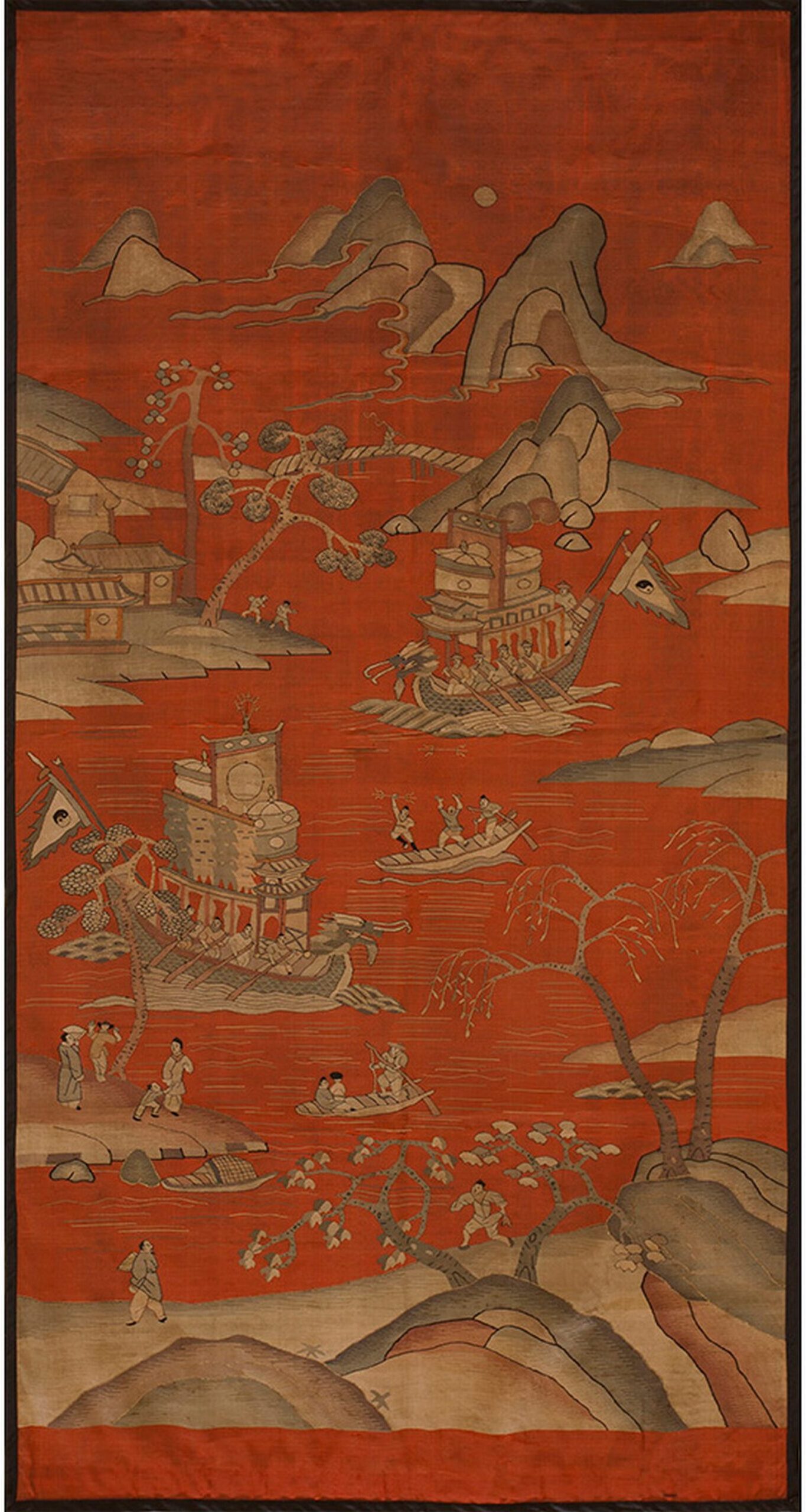 While many Chinese textiles of this era were grand in scale, this particular format, reminiscent of a hanging scroll, offers a more intimate display opportunity. Its slender profile and detailed execution make it an exceptional piece, perfectly suited for collectors seeking a small scatter size textile with monumental visual impact. This rare survival from the 1830s remains in remarkable condition, preserving its original vibrancy.