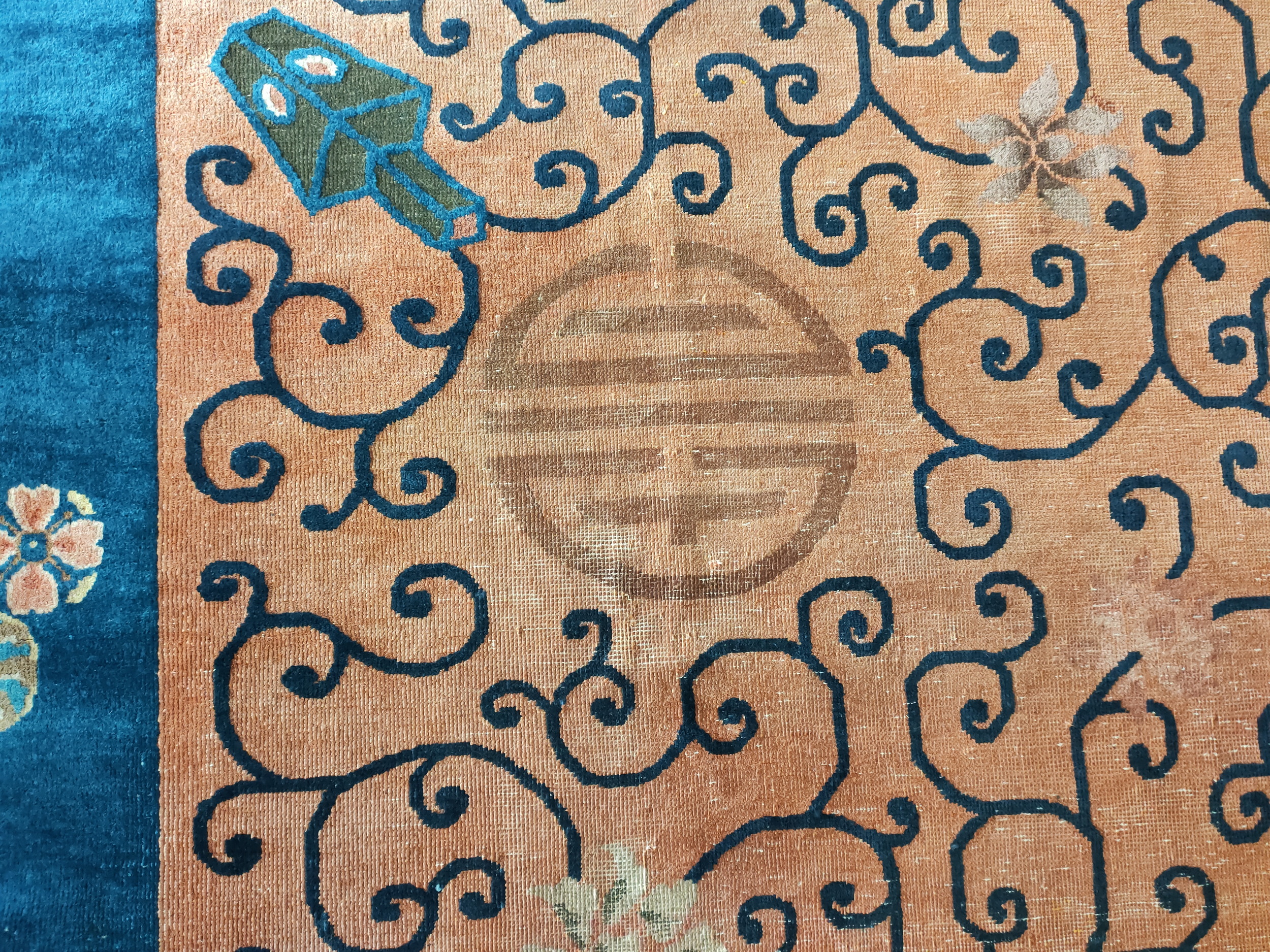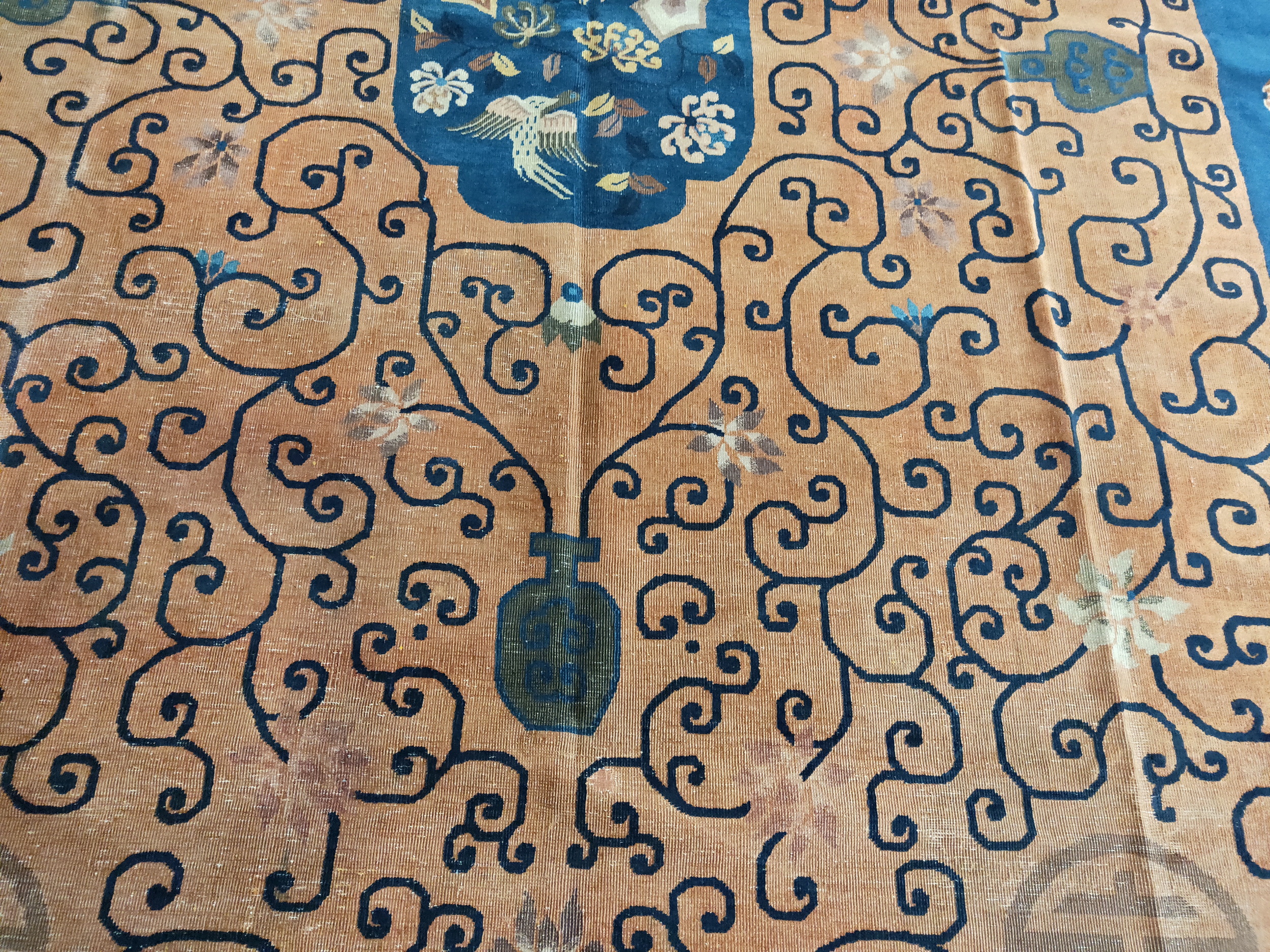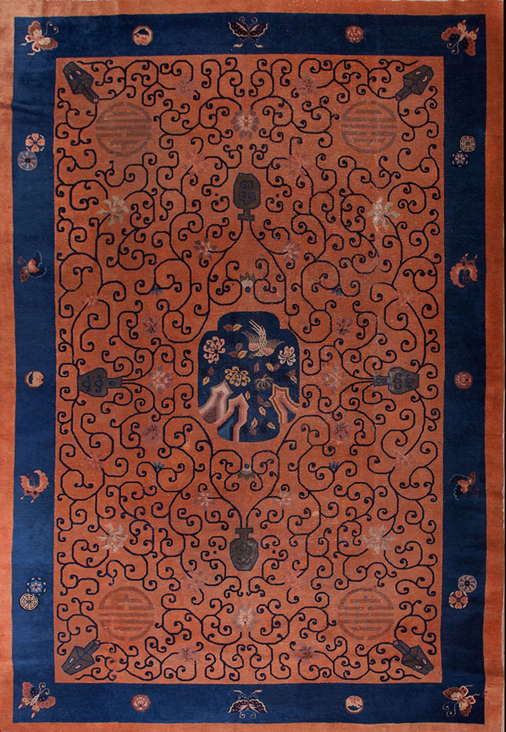 Woven in Chinese rugs workshops during a period of intense cultural exchange, this carpet is a prime example of the Chinese Art Deco rugs movement. Unlike earlier Ming or Qing dynasty pieces, the palette here is assertive, utilizing a rich, saturated terracotta field framed by a striking indigo border. This bold color contrast emphasizes the stylized, almost graphic quality of the overall design.