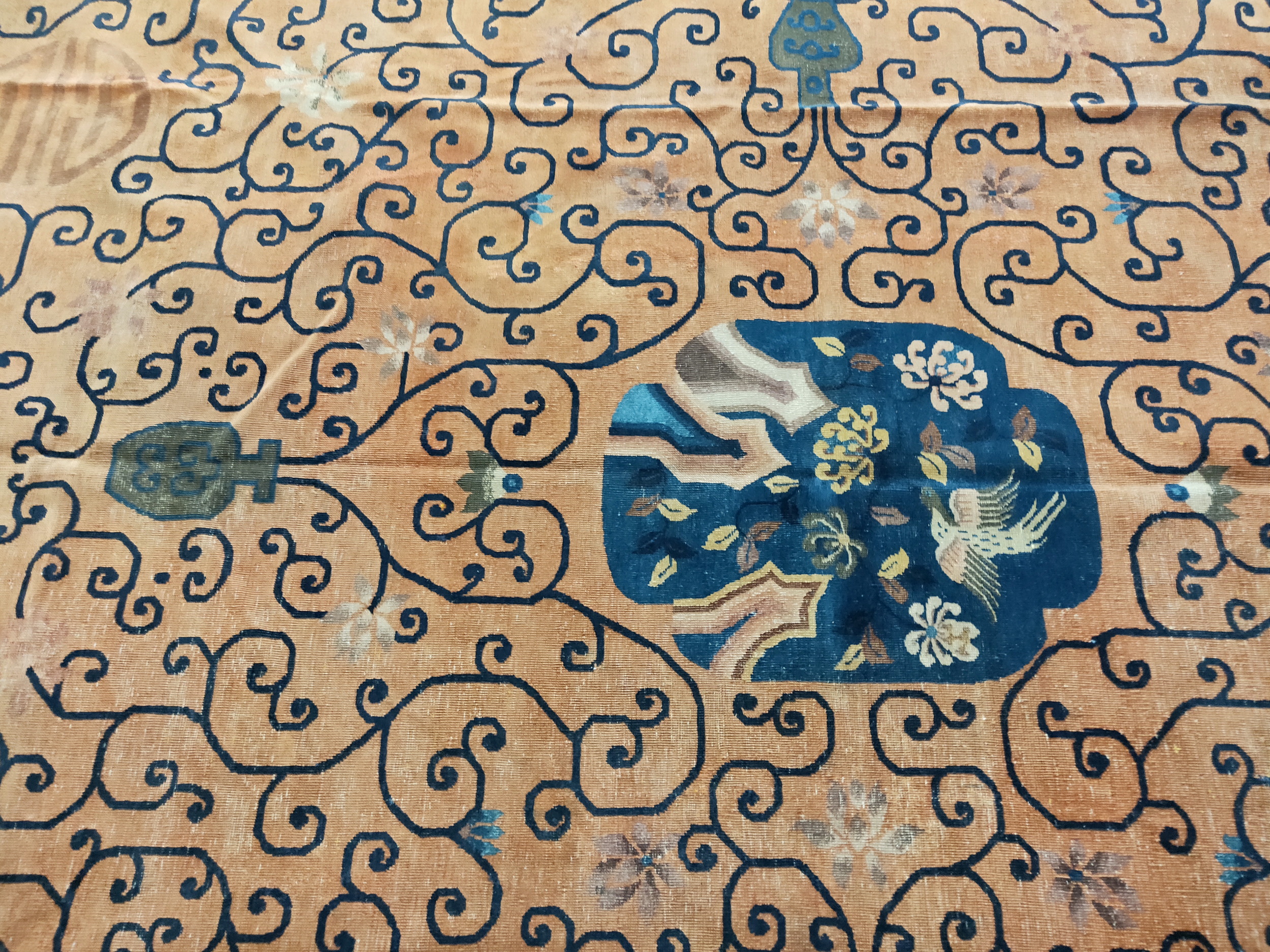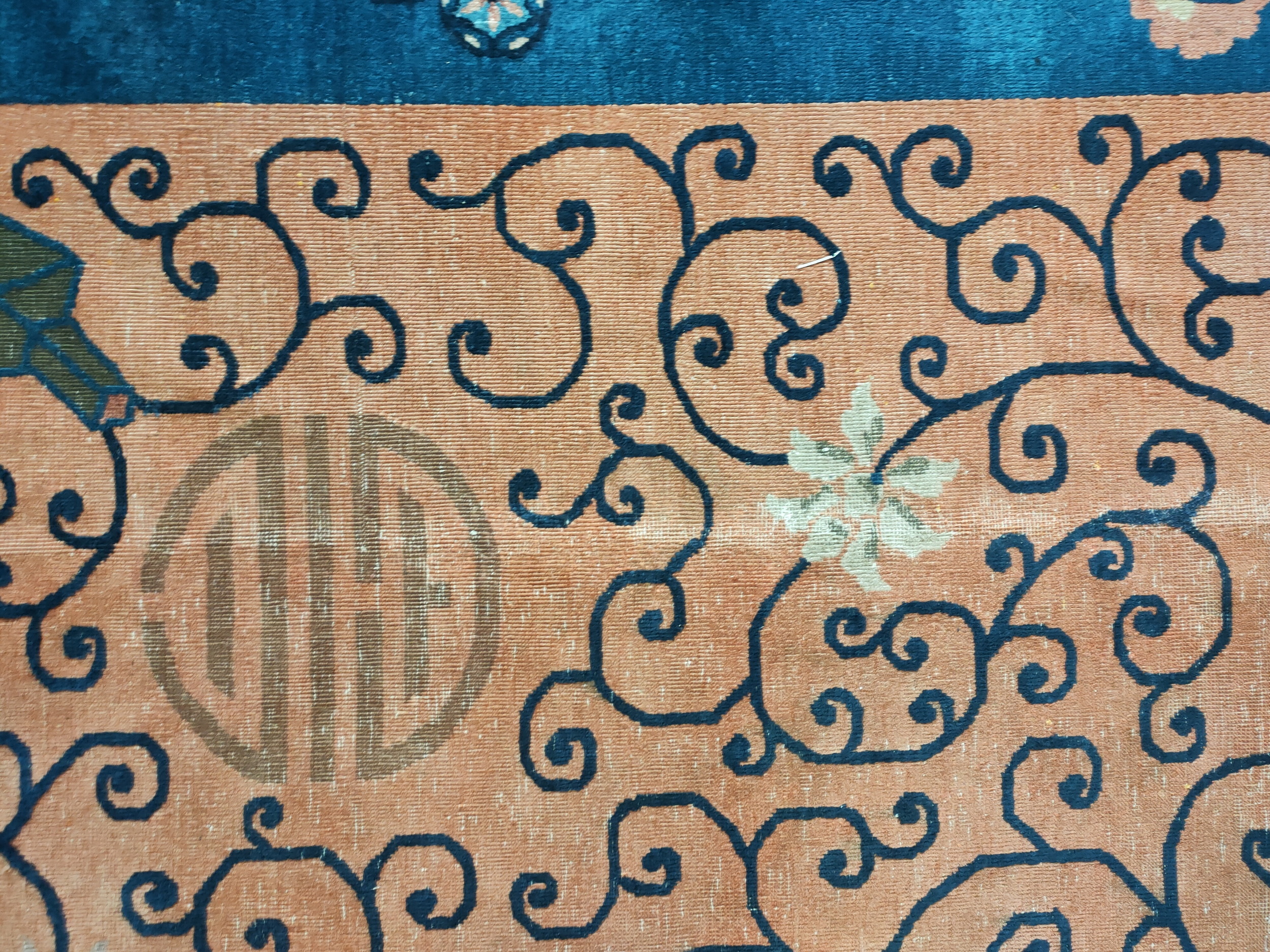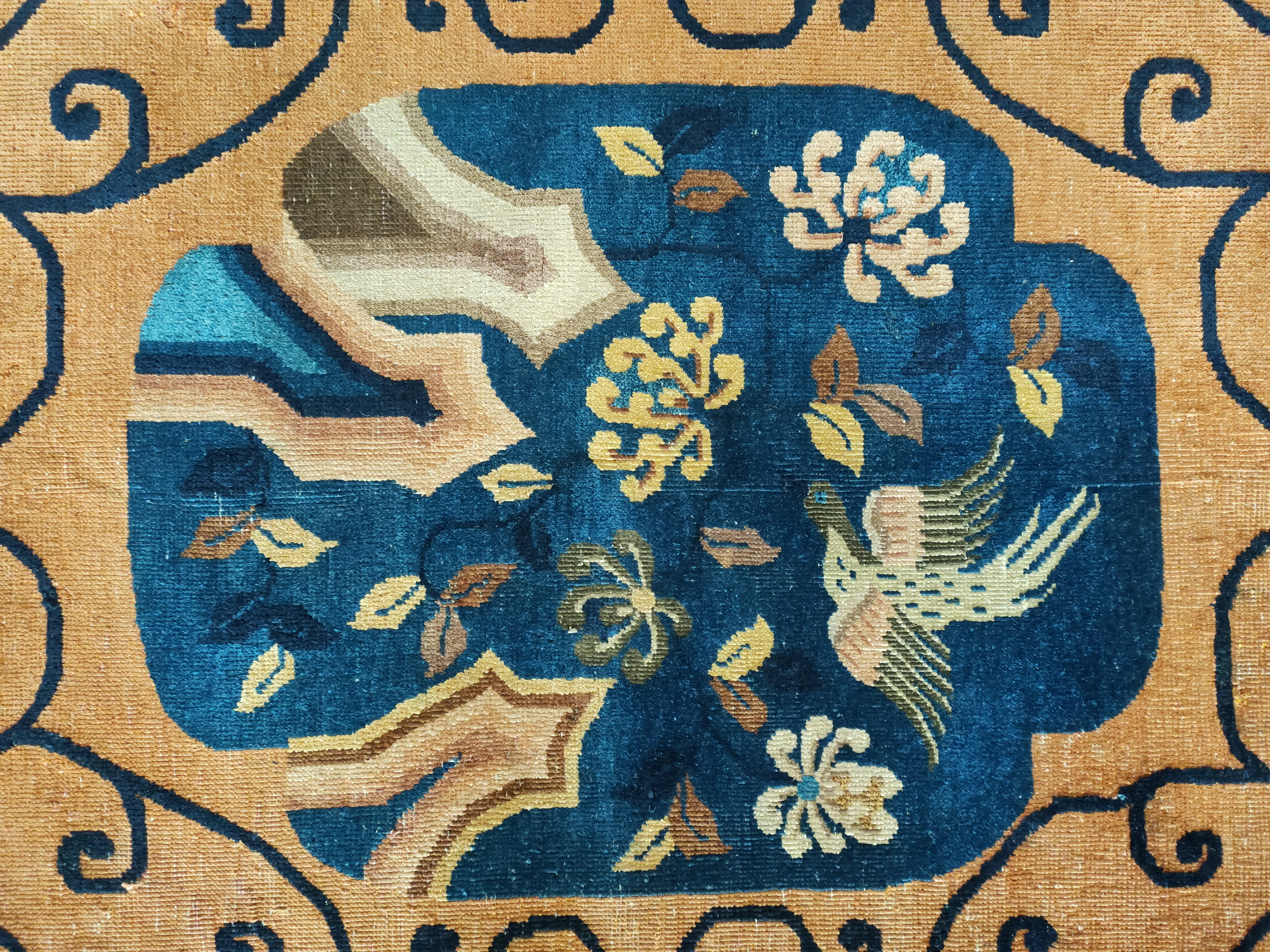 Woven in Chinese rugs workshops during a period of intense cultural exchange, this carpet is a prime example of the Chinese Art Deco rugs movement. Unlike earlier Ming or Qing dynasty pieces, the palette here is assertive, utilizing a rich, saturated terracotta field framed by a striking indigo border. This bold color contrast emphasizes the stylized, almost graphic quality of the overall design.