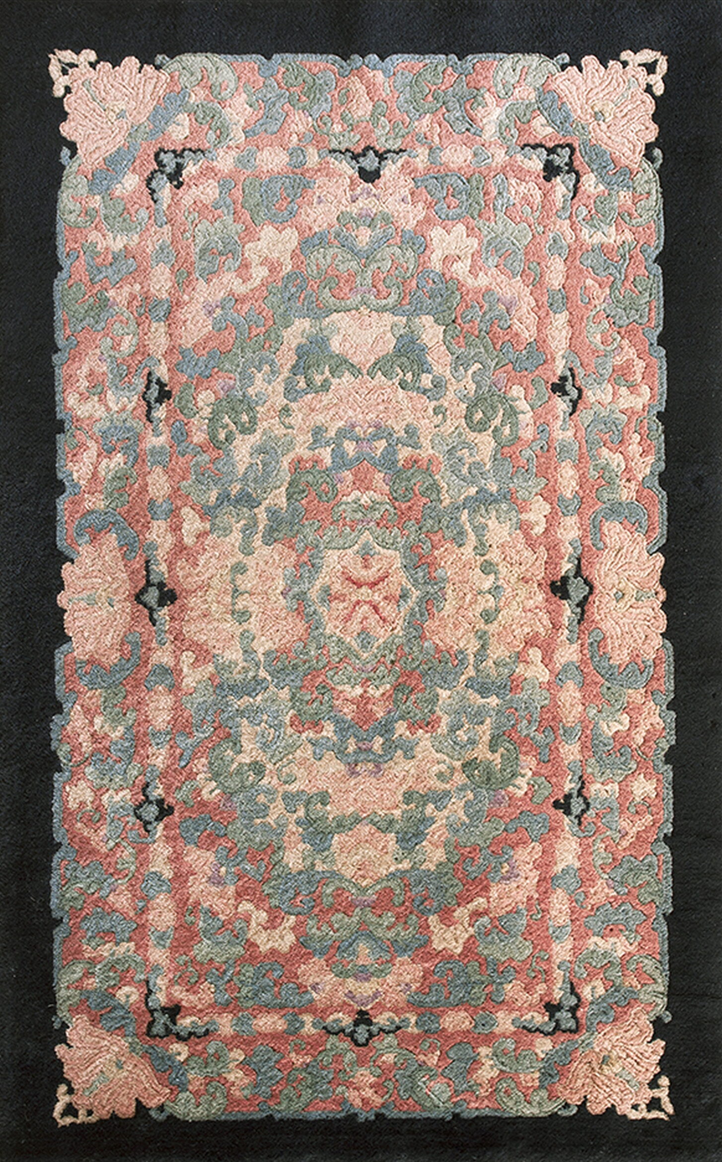 The palette is sophisticated and subtly complex, employing a range of faded rose, soft sage, and dusty blue tones. These hues are densely packed across the field, creating a tapestry effect that avoids the stark contrasts often associated with later Art Deco designs. The resulting depth of color gives the piece a rich, almost three-dimensional quality, classifying it among the finest multicolor jewel tone rugs.