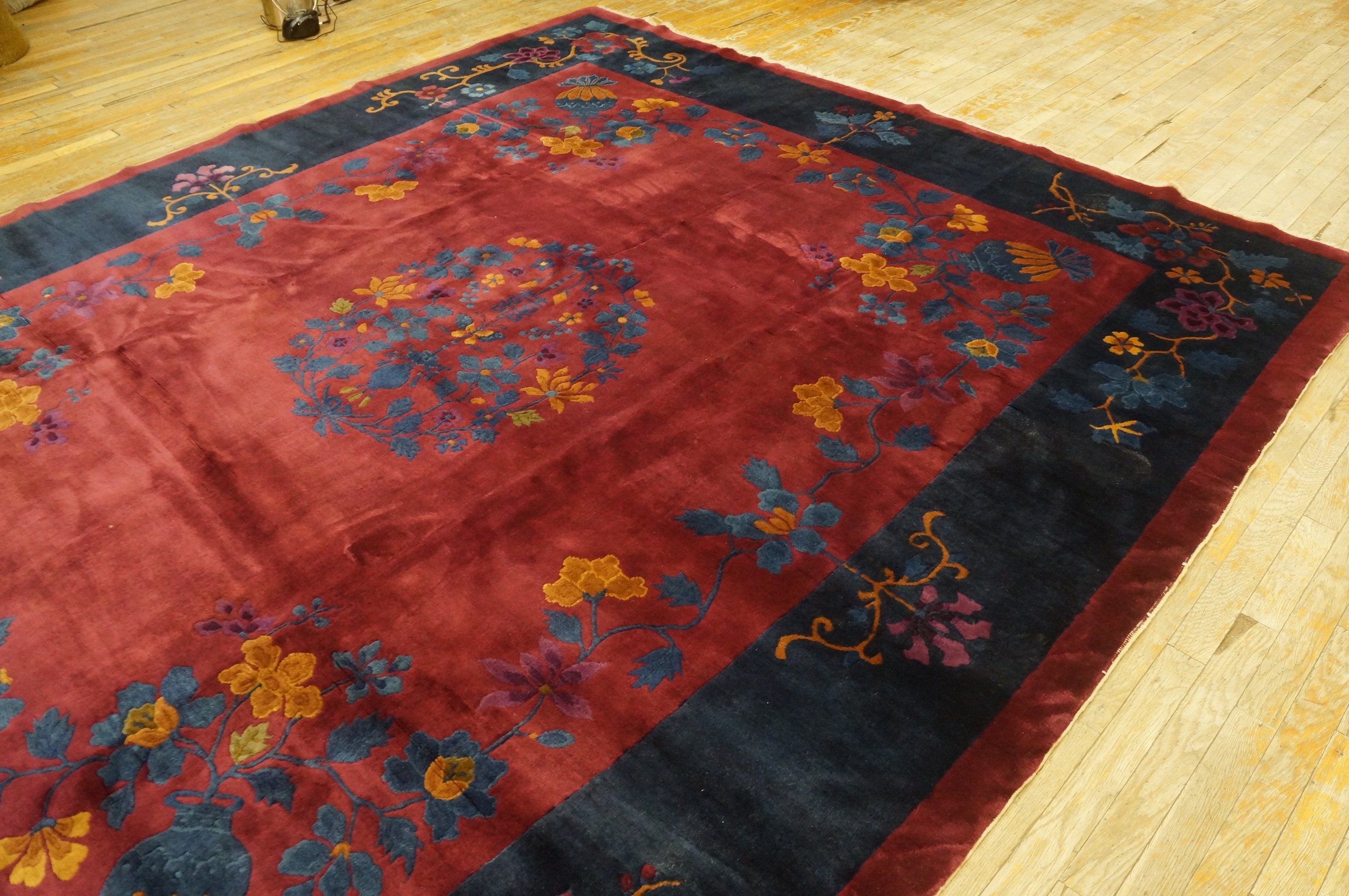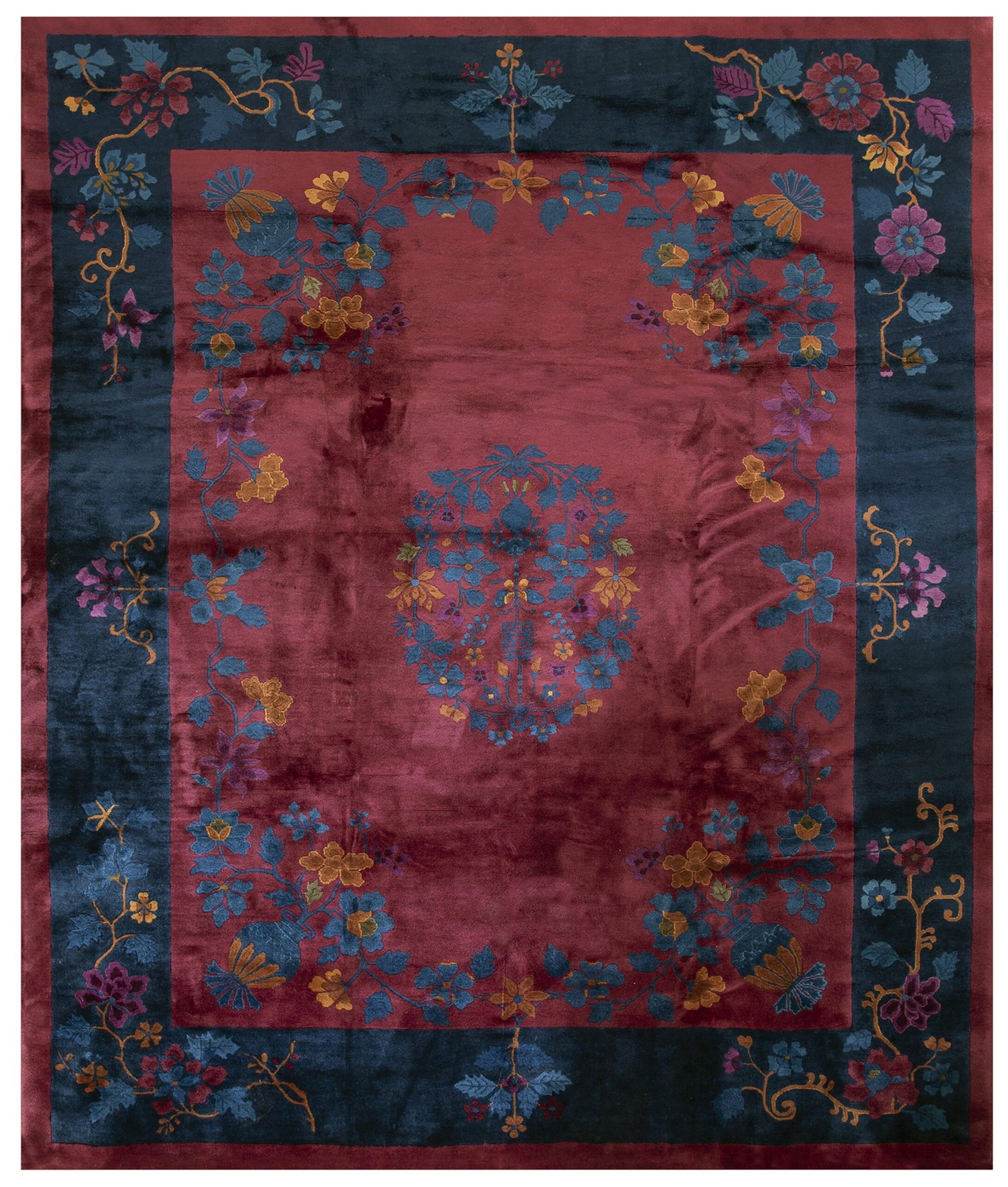 Antique Chinese – Art Deco Chinese Allover Floral Coral 1920s Rug, Circa Date: 1920s. This exceptional piece exemplifies the height of the Art Deco movement in East Asia, blending traditional Chinese botanical iconography with the bold, simplified aesthetic of the 1920s. It stands as a superb example among our collection of antique rugs.