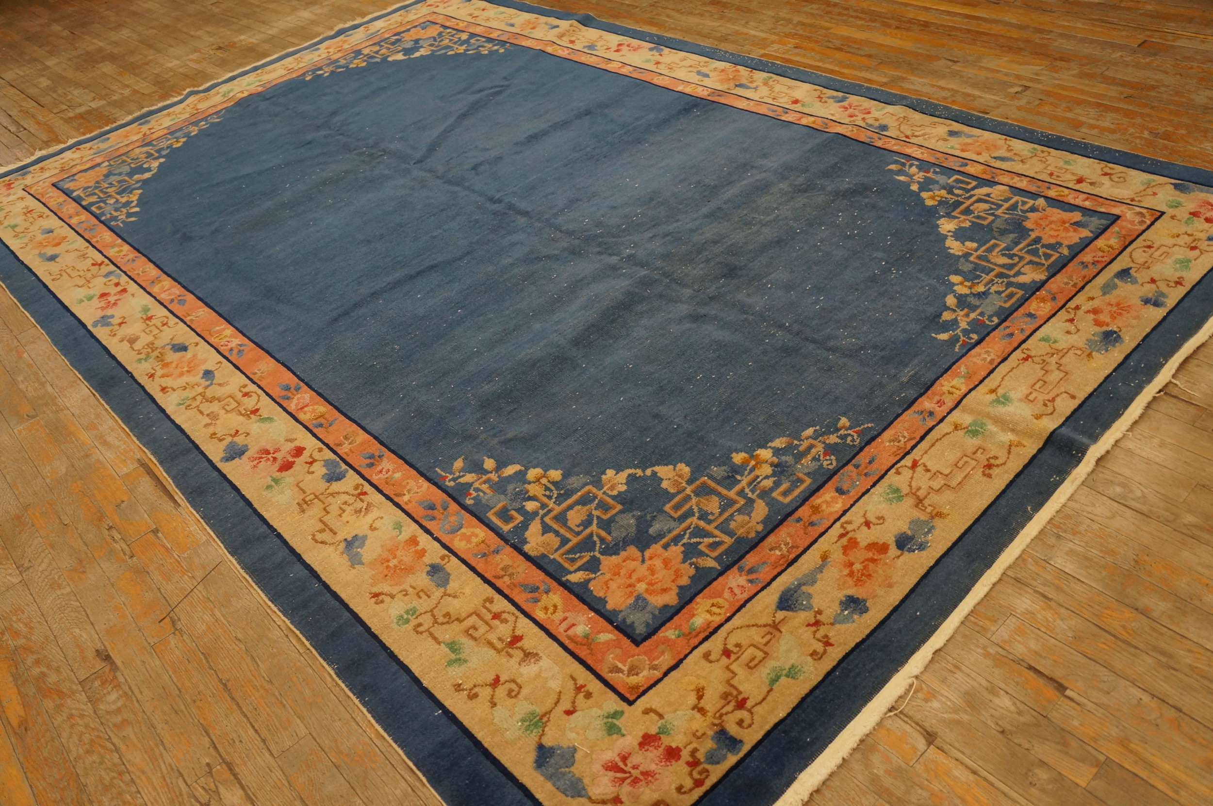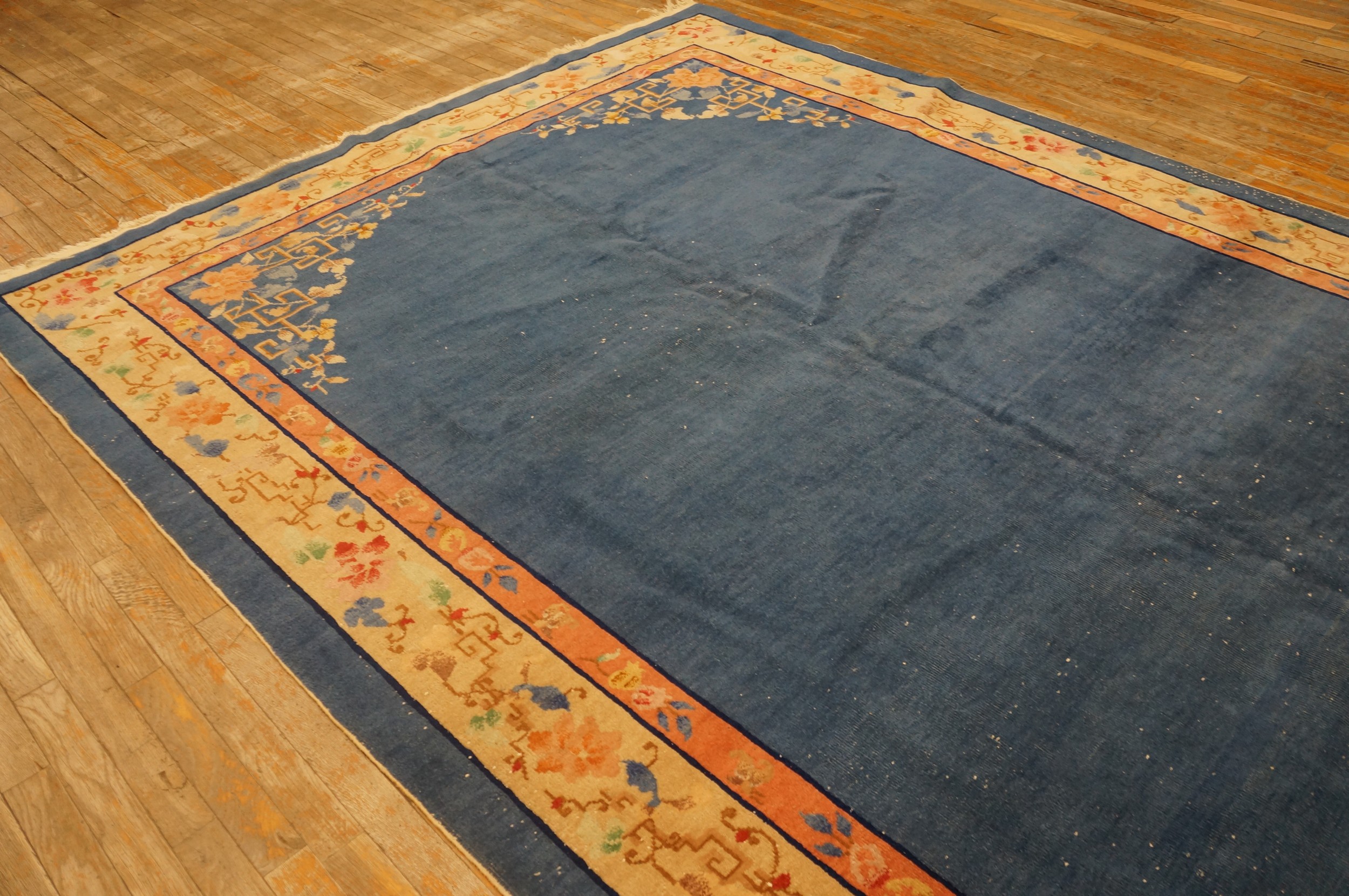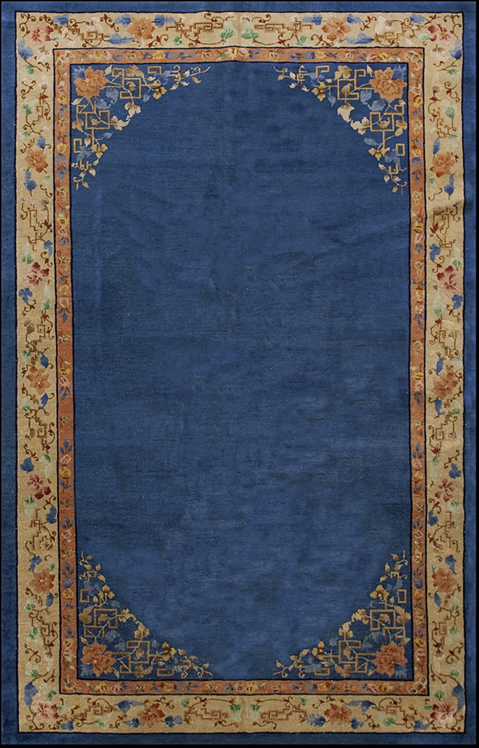The expansive field is rendered in a magnificent, saturated indigo, providing a dramatic contrast to the pale, sandy border. This deep hue anchors the design, allowing the stylized floral elements in the corners to truly pop. The use of such a bold, solid color field is characteristic of the period’s departure from densely patterned classical designs, emphasizing the strength of blue color rugs.