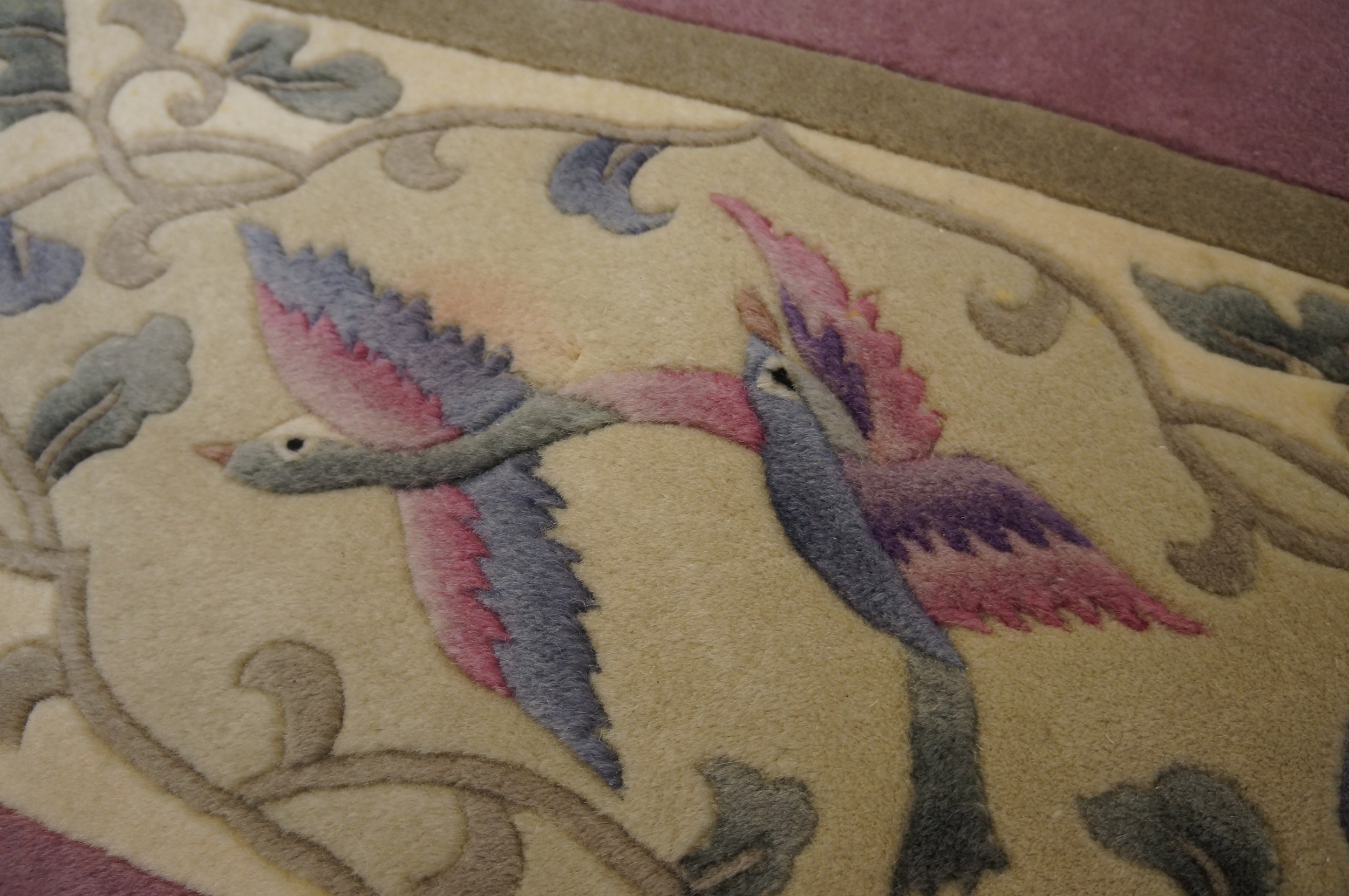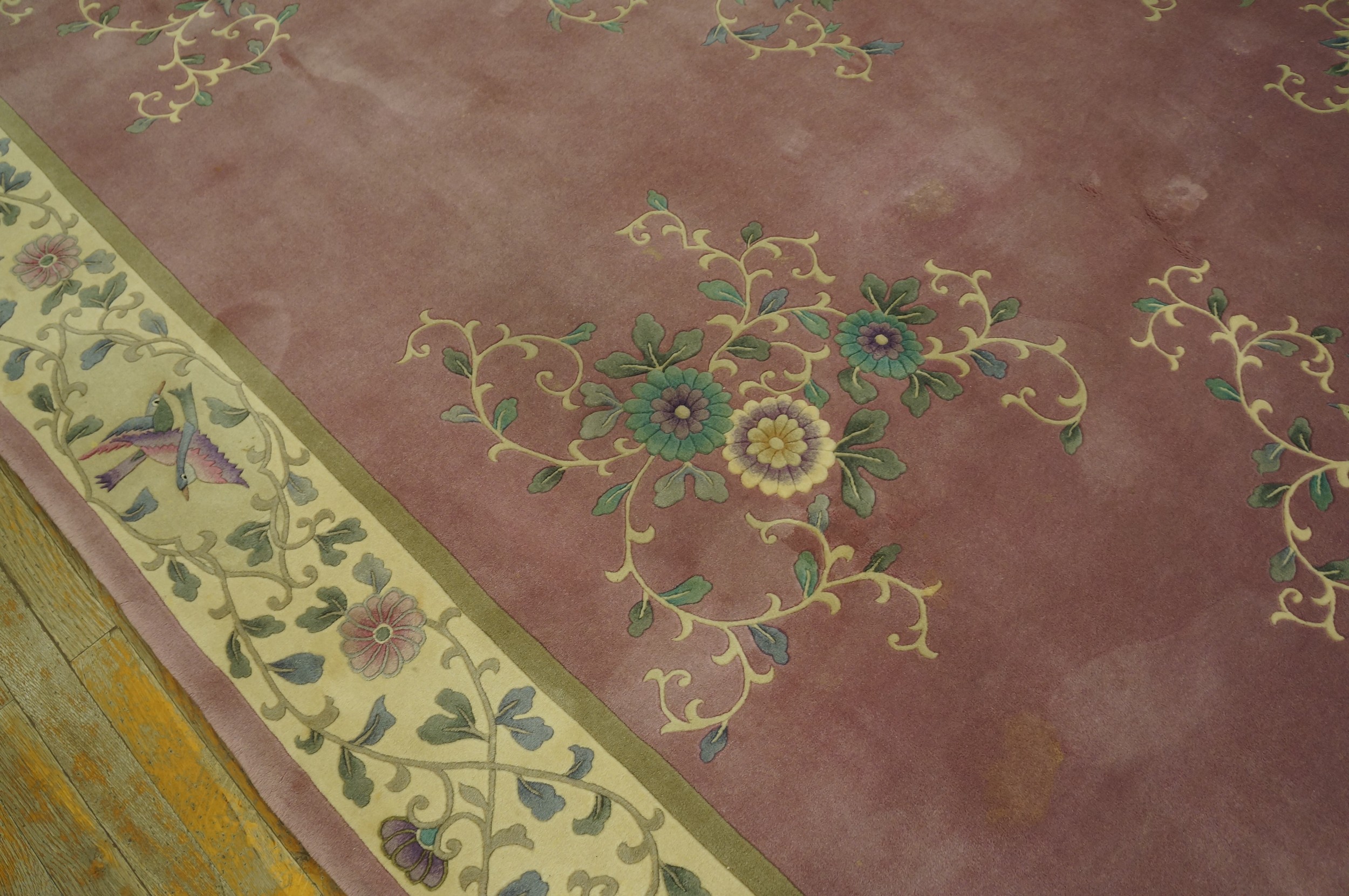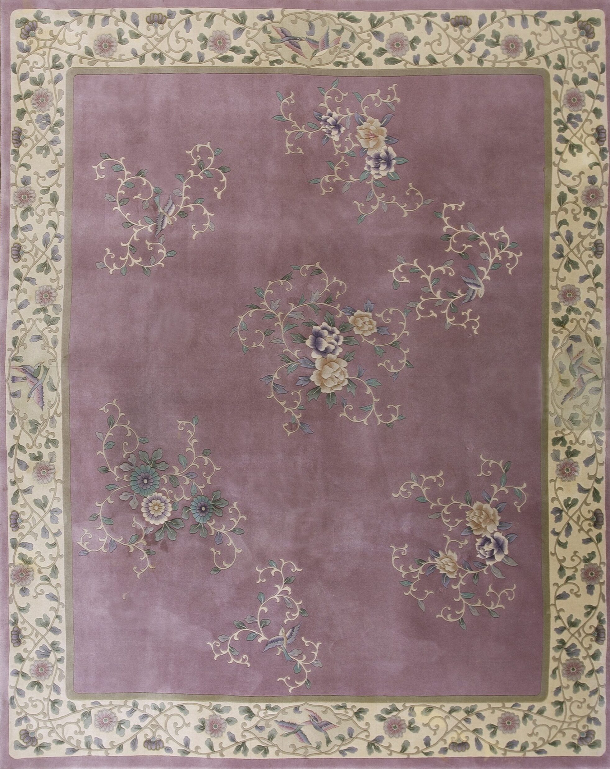 Vintage Chinese – Art Deco Chinese Allover Floral Purple 1980s Rug, Circa Date: 1980s. This exquisite example of Art Deco Chinese weaving presents a luxurious field saturated in a deep, dusty mauve. The style is characteristic of later vintage area rugs, offering a soft, plush pile and an aesthetic that bridges traditional Asian design with 20th-century Western sensibilities.
