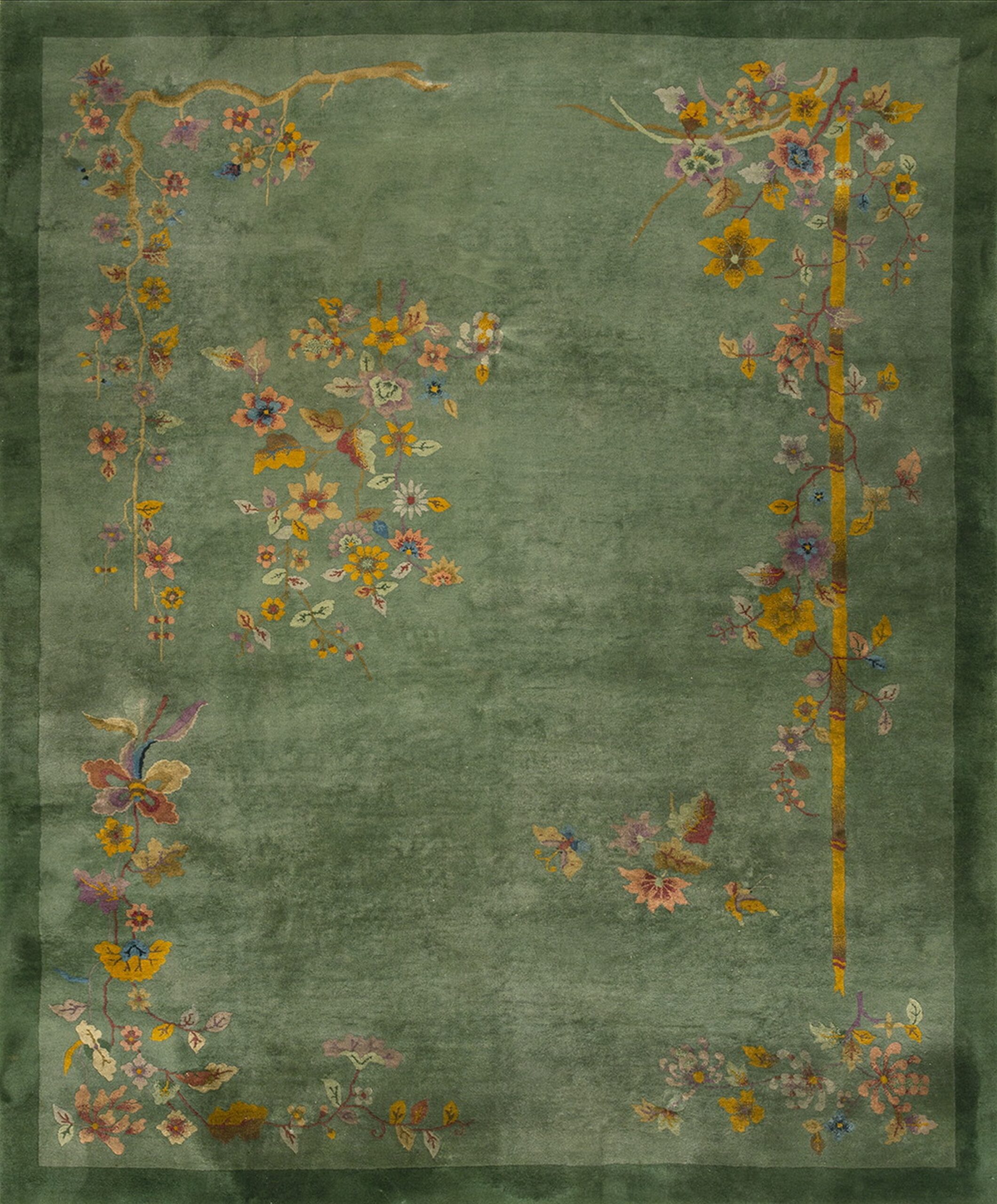 The expansive field is rendered in a sophisticated, muted sage, providing a tranquil backdrop for the delicate botanical imagery. This specific shade of green color rugs was immensely popular during the Jazz Age, reflecting a desire for natural, yet refined, interior palettes. The color choice emphasizes the rug’s luxurious wool pile and soft texture.