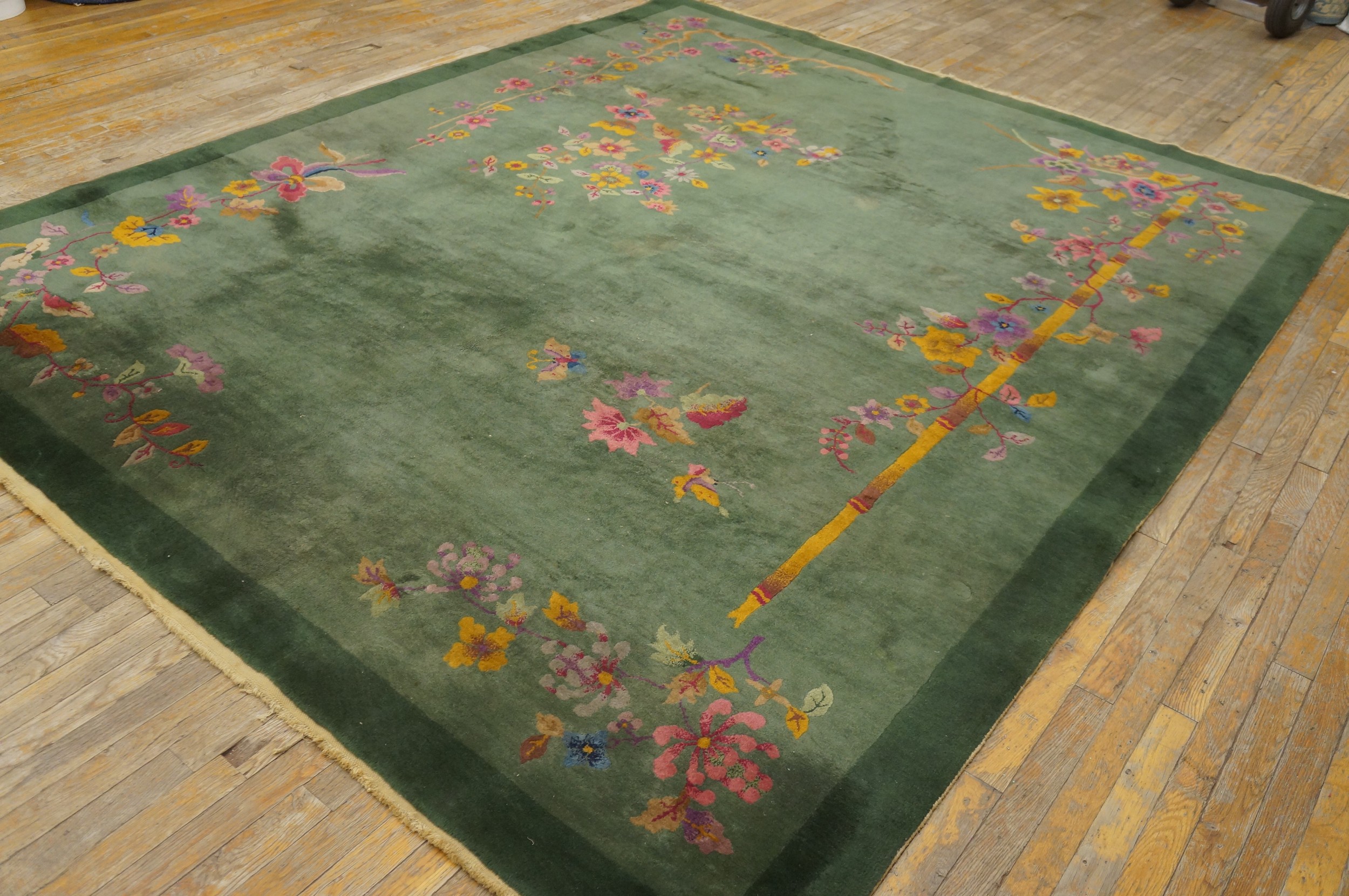 Antique Chinese Art Deco Floral Knotted Green Rug