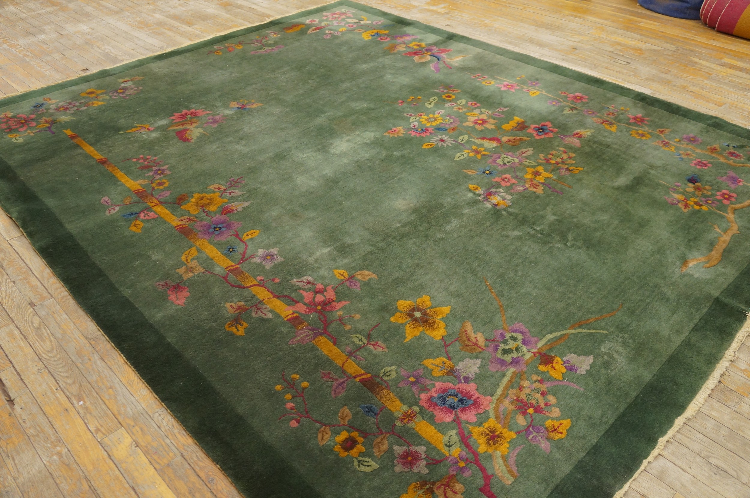 Antique Chinese – Art Deco Chinese Floral Knotted Rug, Circa Date: 1920s. This exquisite example of early 20th-century weaving captures the transitional aesthetic of the Art Deco period, merging traditional Chinese naturalism with the simplified, open fields favored by Western design. Such pieces are highly sought after among antique rugs collectors for their unique historical placement.