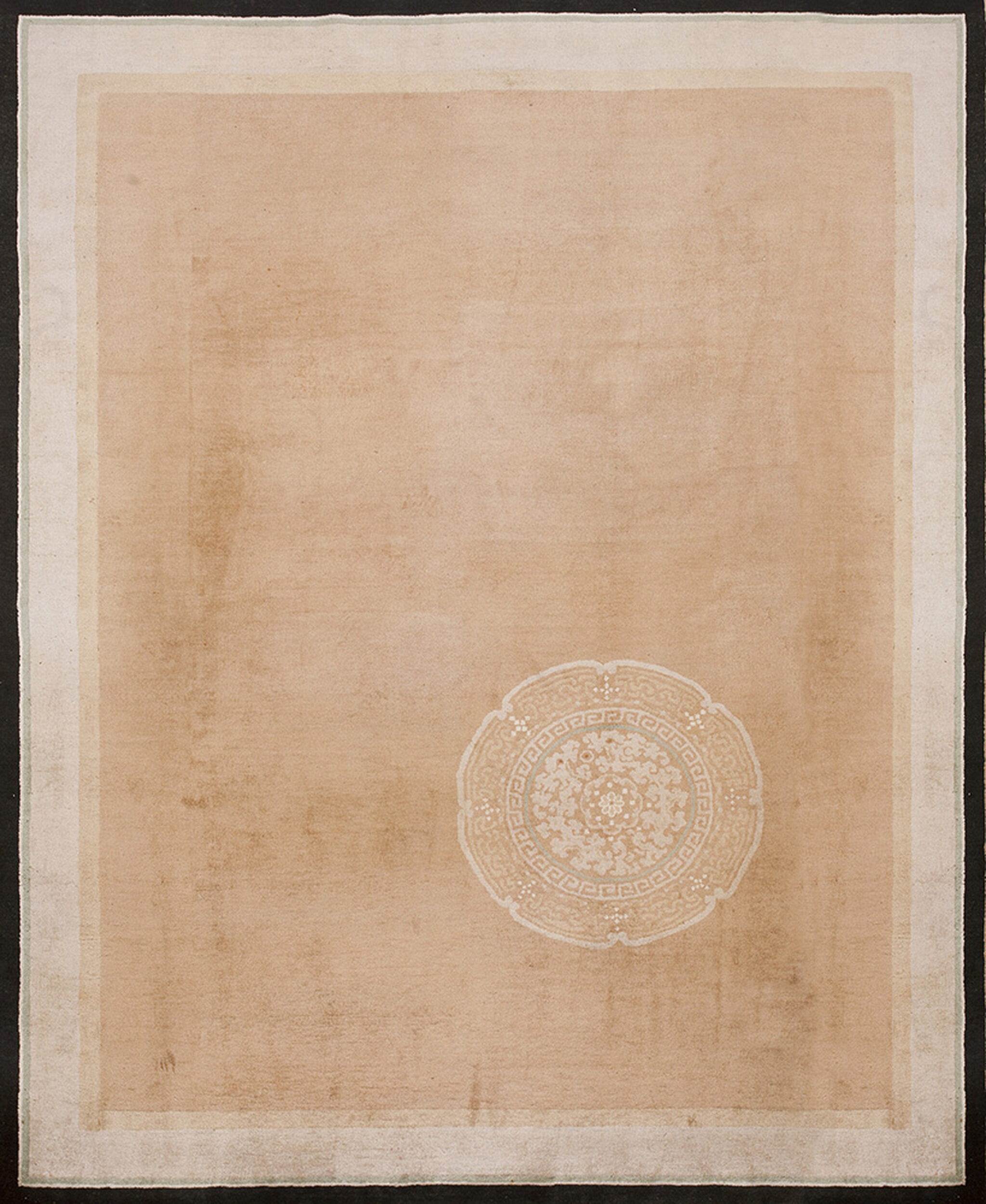The composition is highly restrained, featuring an expansive, subtly variegated field rendered in soft, neutral tones of beige and pale tan. This deliberate minimalism allows the single, asymmetrical medallion—a hallmark of the era—to command attention. The medallion itself utilizes delicate white and pale pale blue accents, showcasing intricate floral rugs patterns within its geometric border.