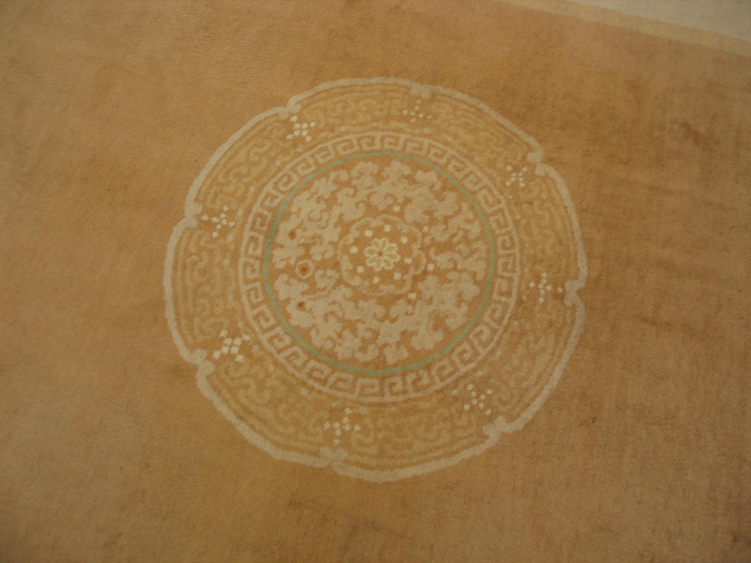 Antique Chinese Art Deco Floral Medallion Hand Knotted Pile Rug, Country of Origin: China, Circa Date: 1930s. This exceptional piece exemplifies the confluence of traditional Eastern weaving techniques and the streamlined aesthetic of the early 20th-century Art Deco movement, defining the unique character of Chinese Art Deco.