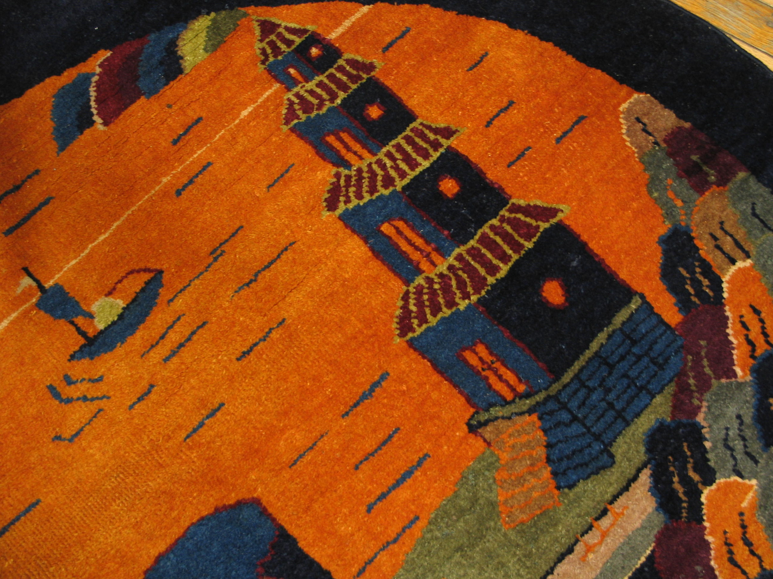 Executed in a rare circular format, the rug presents a stylized landscape scene featuring a towering pagoda, a small fishing boat upon the water, and rugged, colorful mountains. The dominant field color is a rich, saturated saffron, dramatically framed by a wide, solid navy border. This striking format, often used for accent pieces, classifies it perfectly within the Small Scatter Size Rugs (4.06ft x 4.1ft) category, ideal for intimate spaces.