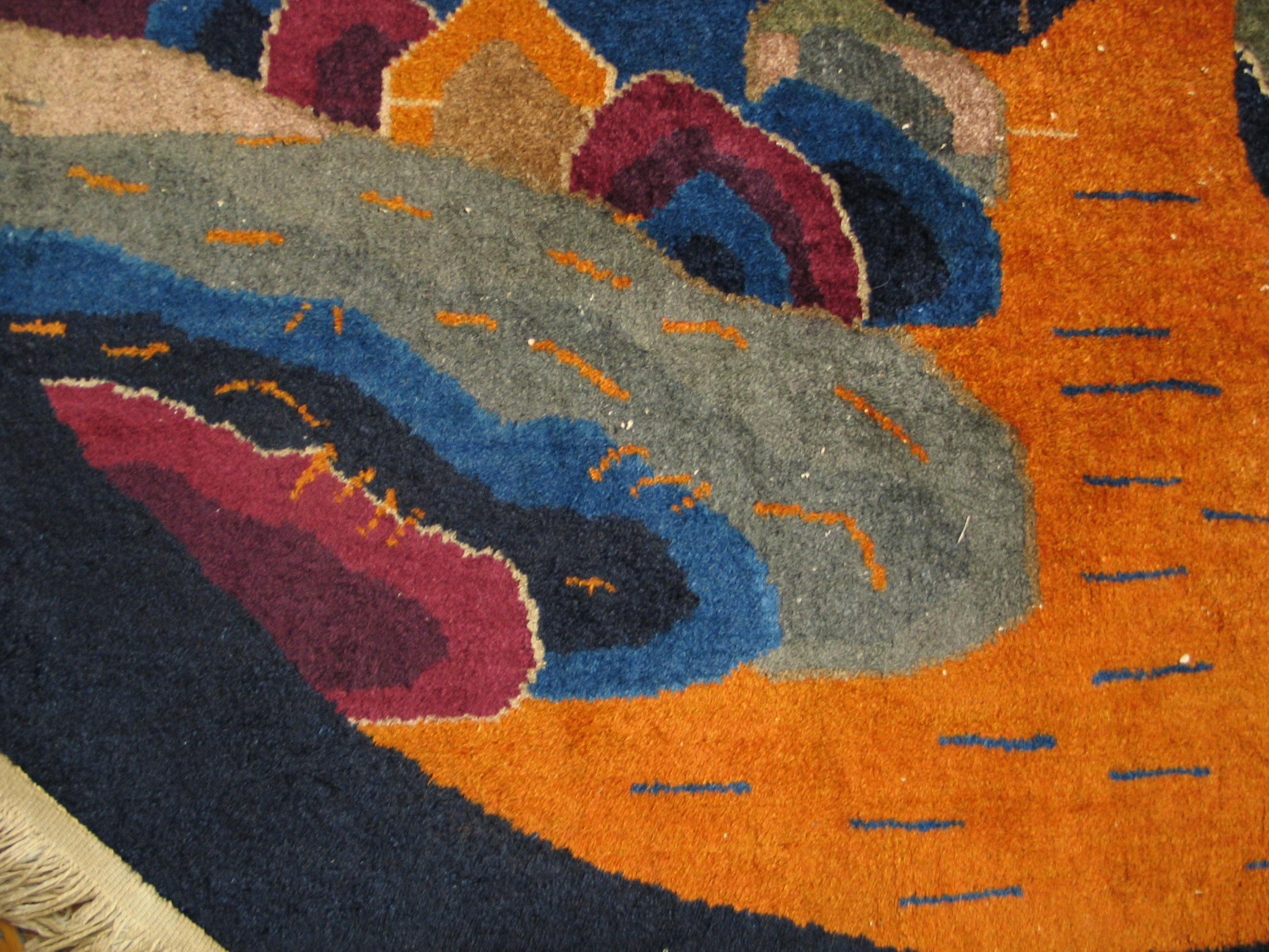 The design eschews naturalistic detail in favor of graphic simplification, a hallmark of the Art Deco movement that flourished internationally during the 1920s. The use of strong, contrasting color blocks—deep blues, maroons, and olives—against the intense orange field highlights the modern sensibility of the design. This specific aesthetic is definitive of Chinese Art Deco rugs, which revolutionized the global market.