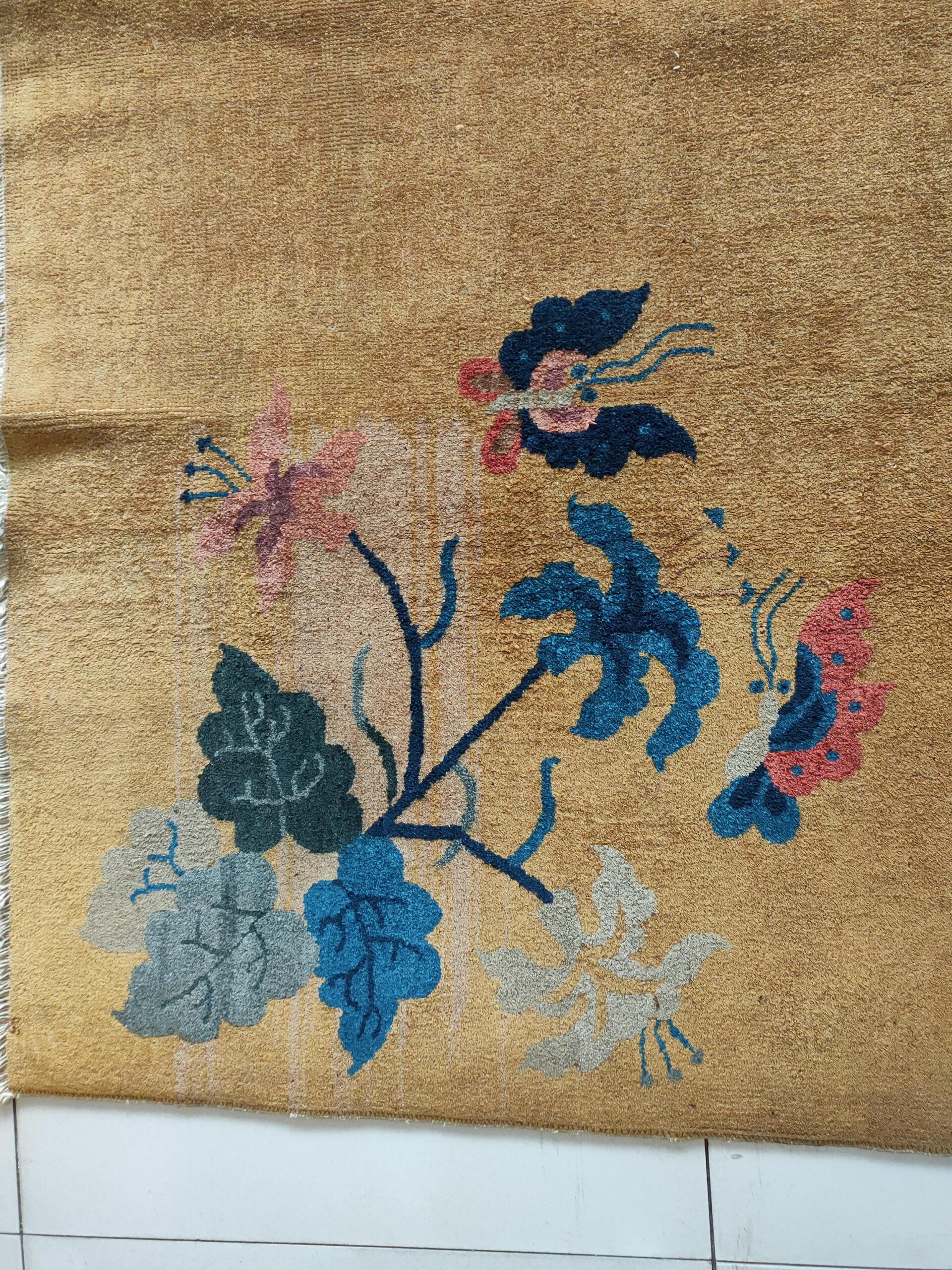 Antique Chinese – Art Deco Hallway Runner Wool Yellow Rug, Circa Date: 1920s. This exceptional piece represents the height of the Chinese Art Deco weaving tradition, blending traditional Far Eastern iconography with the bold, open compositions favored by Western designers. As a genuine example of antique rugs, its provenance and craftsmanship are impeccable.