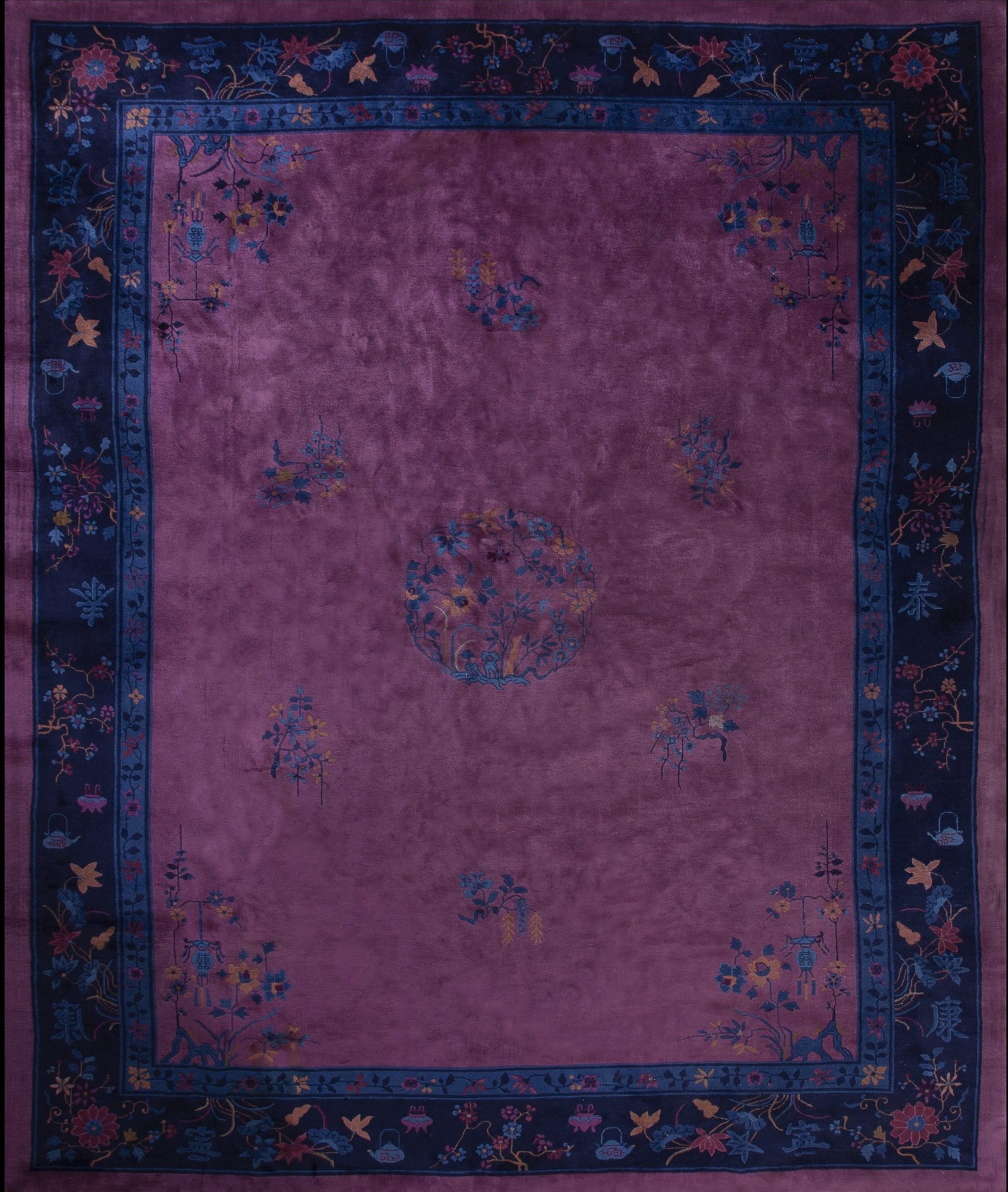 A wide, midnight-blue border frames the composition, densely populated with intricate floral vignettes and Chinese characters, offering a striking counterpoint to the expansive, quiet field. The interplay between the bold, solid colors and the fine detailing showcases the masterful weaving techniques employed in these fine antique rugs.