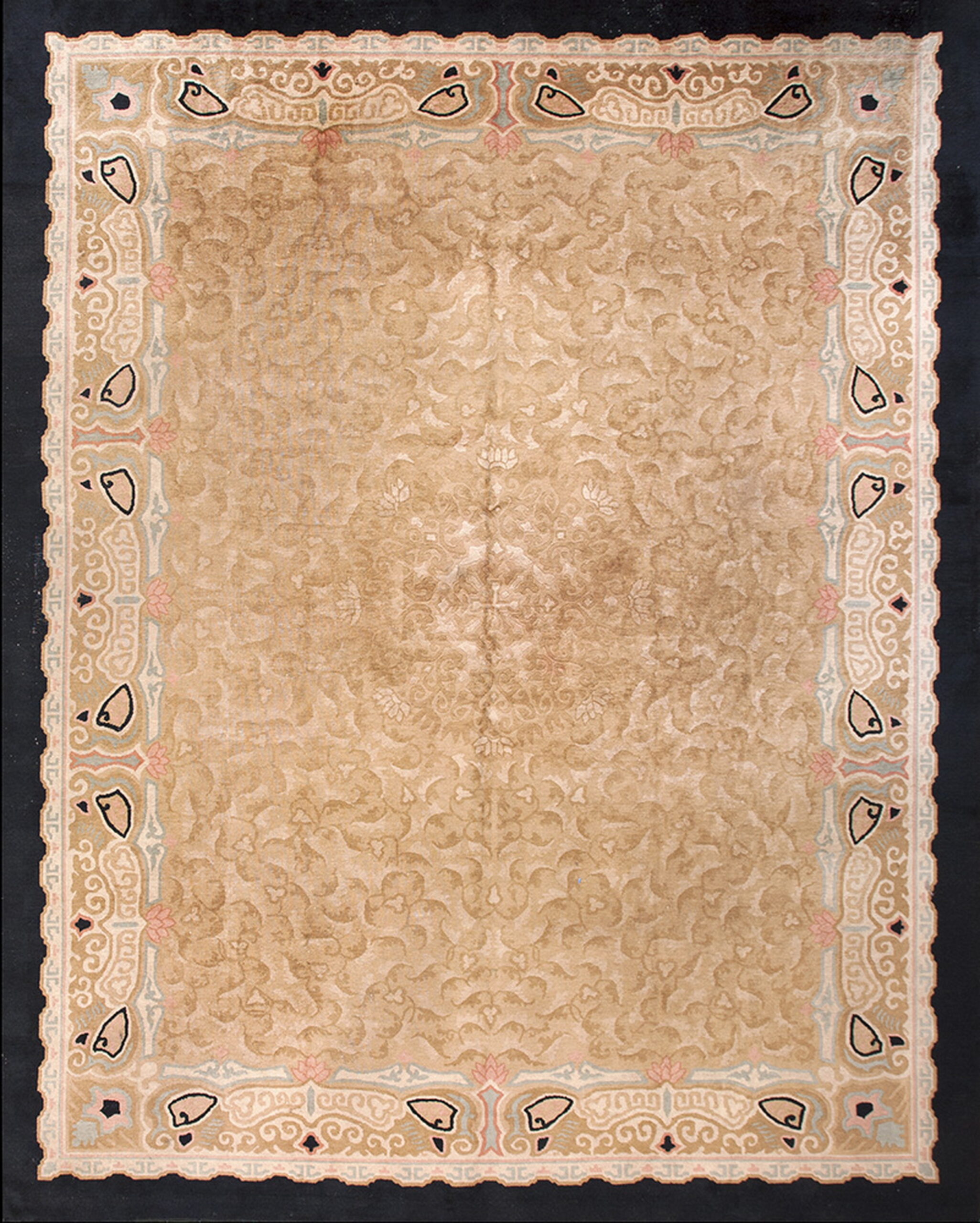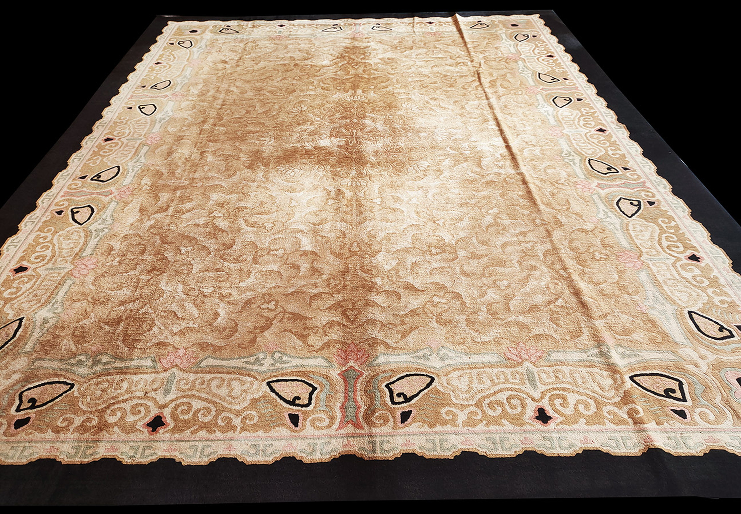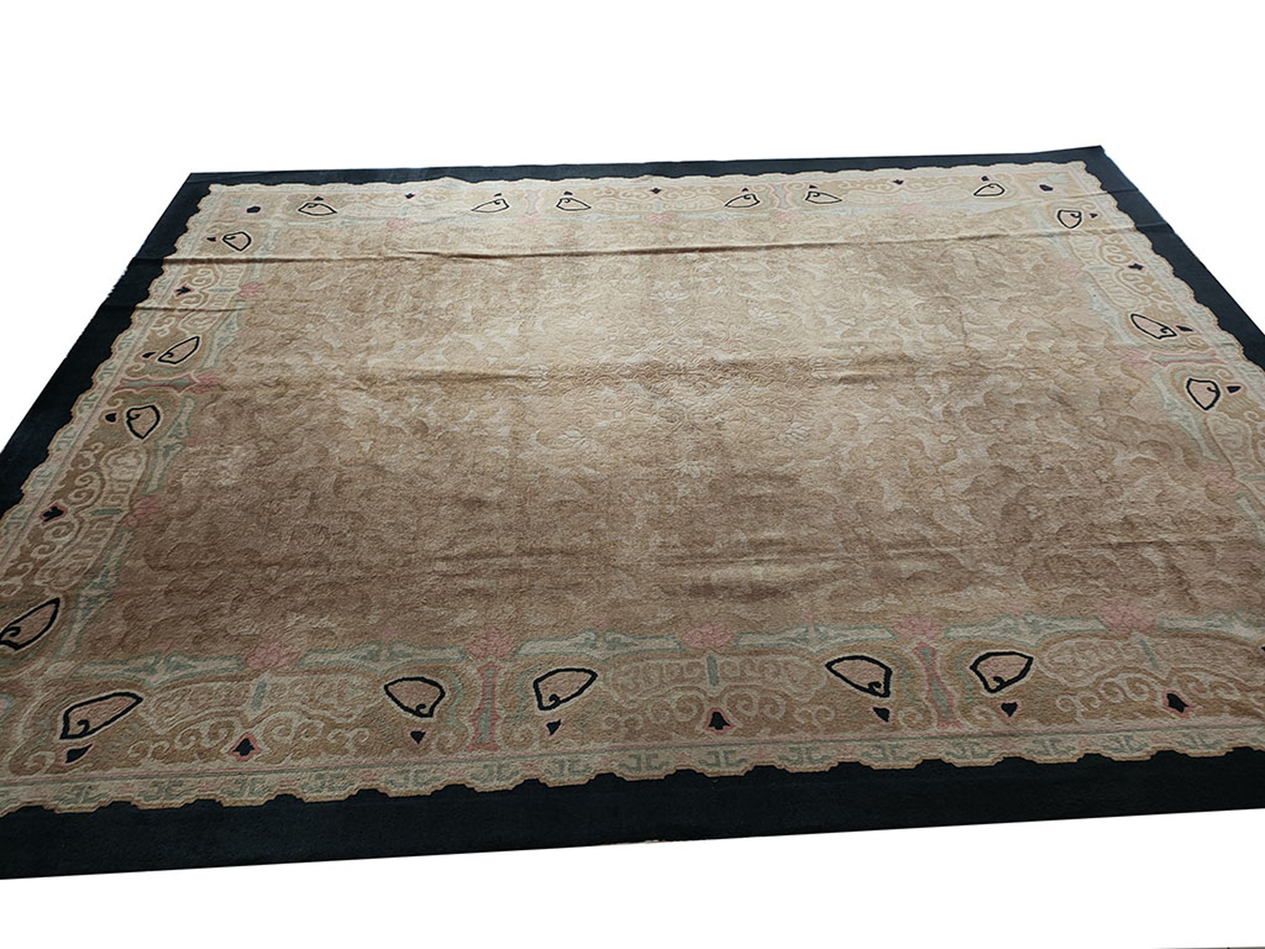 Framed by a striking dark border that provides necessary contrast, the rug’s dimensions are substantial, making it perfectly suited for use in grand living spaces or dining rooms. Its impressive scale and decorative appeal qualify it as one of the finest room size rugs available from this period, offering both historical value and immediate functional beauty.
