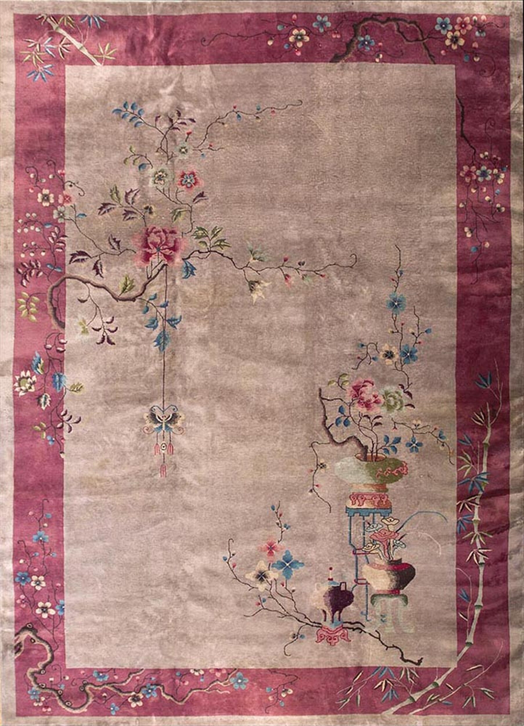 Wool Floral Hand Knotted Pile Antique Large 1920s Rectangle Ivory Beige Cream White Rug, Circa Date: 1920s. This exceptional piece is a hallmark of the Chinese Art Deco period, characterized by its open composition and sophisticated color palette. As one of our finest antique rugs, it represents the transition from classical Eastern design to modern Western aesthetics prevalent in the early 20th century.