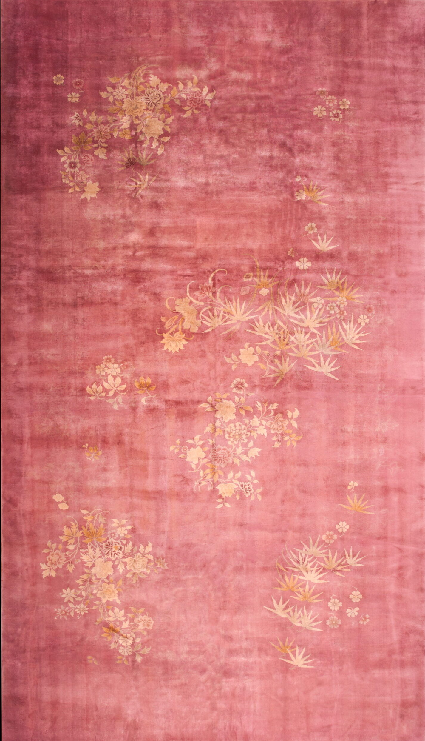 Woven entirely in luxurious wool, the rug features a deeply saturated, almost painterly field of rose and mauve tones. This vibrant ground provides a striking contrast to the delicate, sparsely placed floral and foliage sprays. As a true antique rug, the patina of the wool enhances the subtle abrash, giving the surface a rich, velvety depth that only age can achieve.