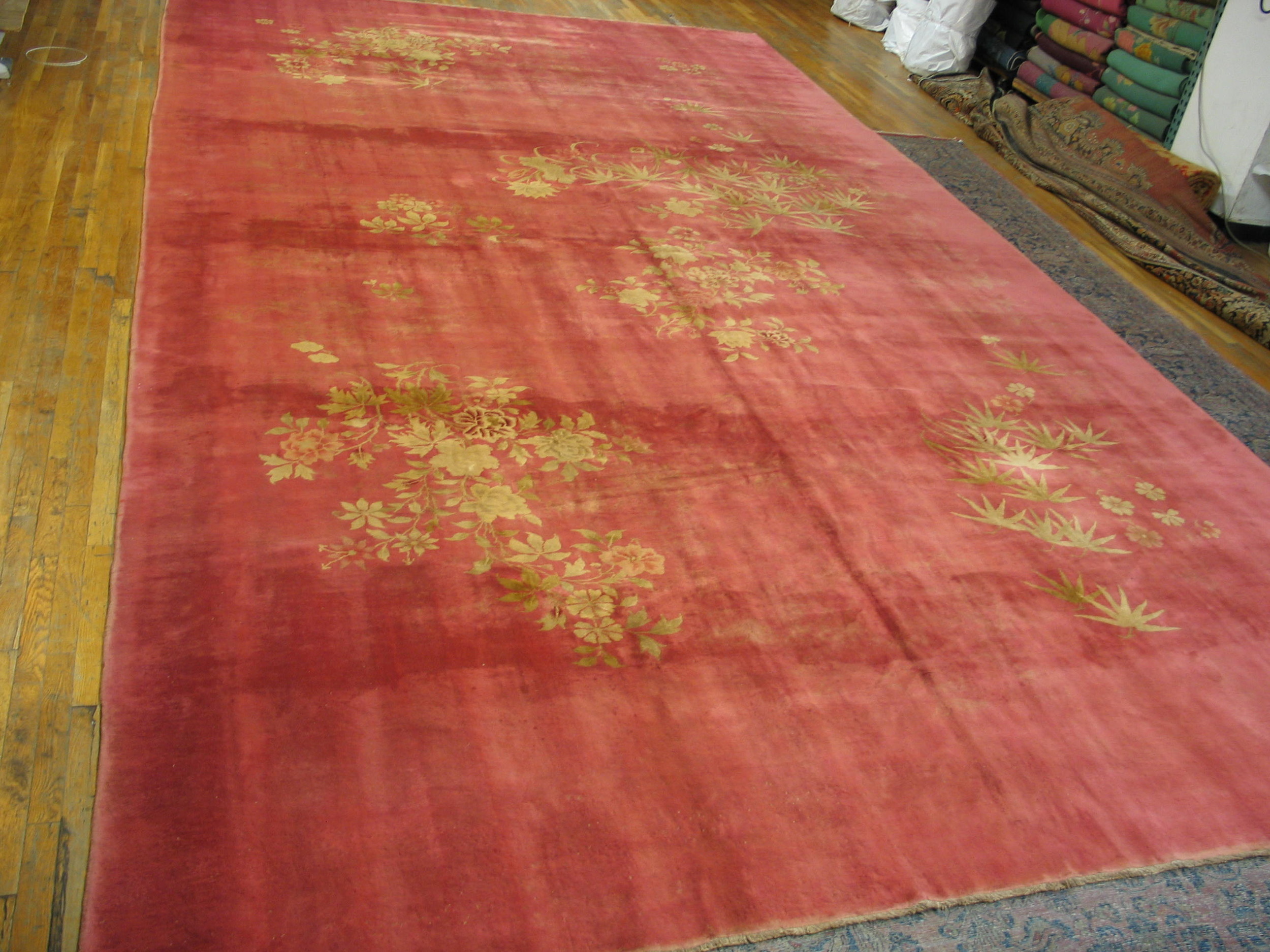 Antique Chinese – Art Deco Oversized Large Oversized Big Rug Wool, Country of Origin: China, Circa Date: 1930s. This exceptional example of Art Deco textile design originates from the renowned workshops of Chinese rugs during the period of Western influence. The piece captures the transitional aesthetic of the 1930s, blending traditional Eastern motifs with the streamlined simplicity demanded by modern interiors.