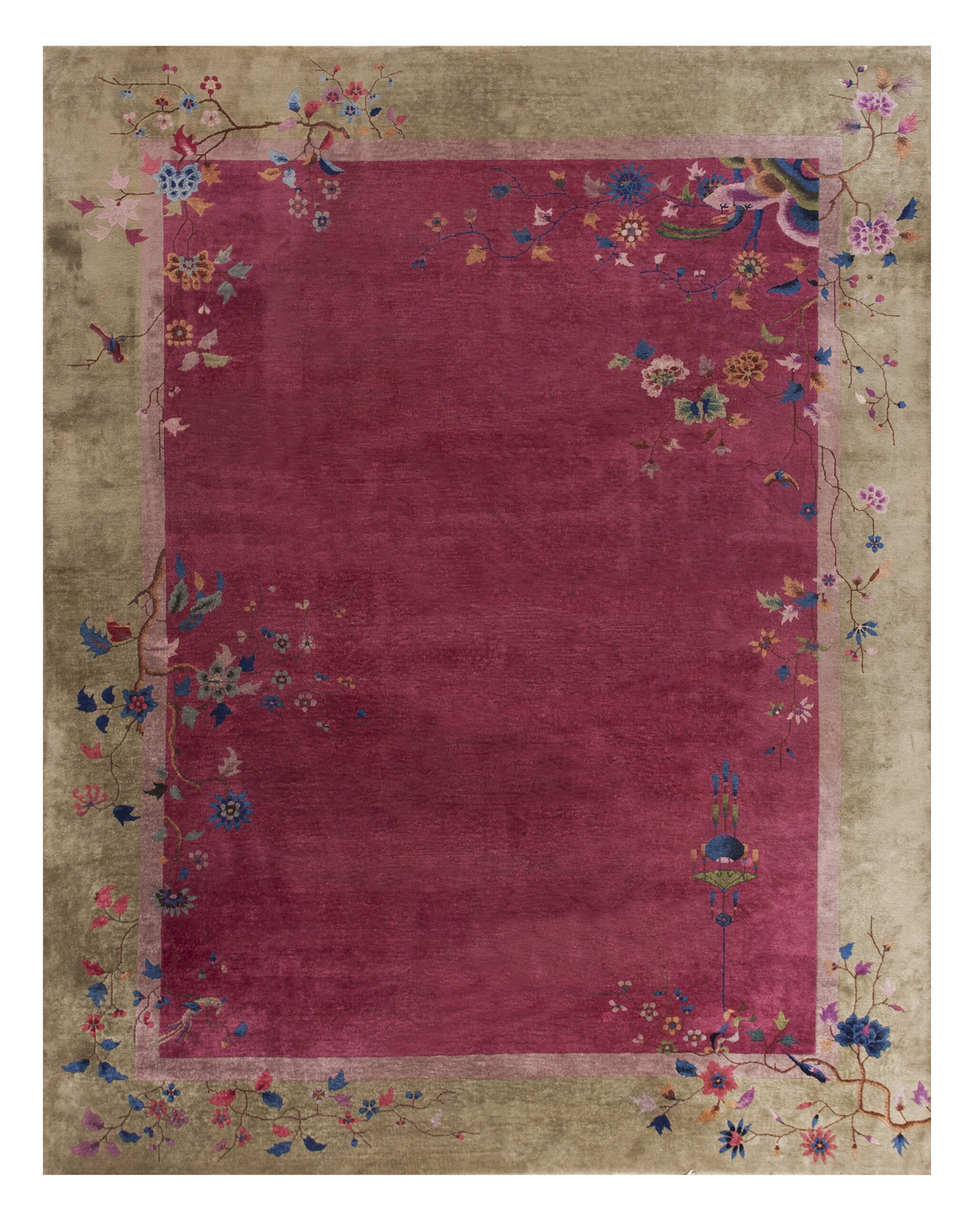Dating to the height of the Art Deco period, this hand-knotted textile is a testament to the technical skill and artistic innovation of early 20th-century Chinese workshops. It remains a superb acquisition for collectors seeking exceptional antique rugs that blend Eastern tradition with Western modernity.