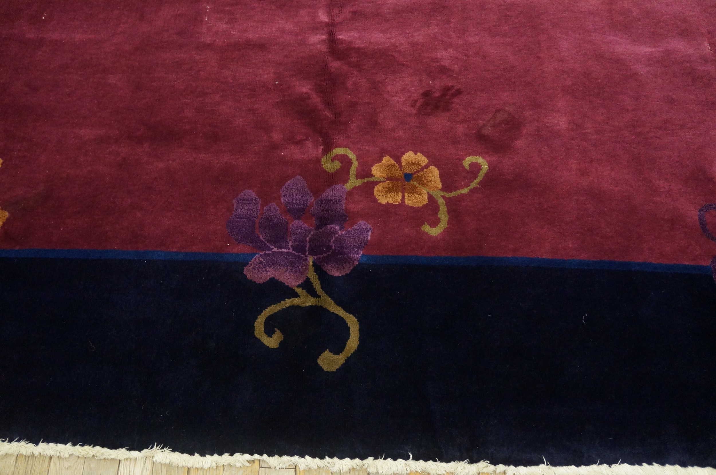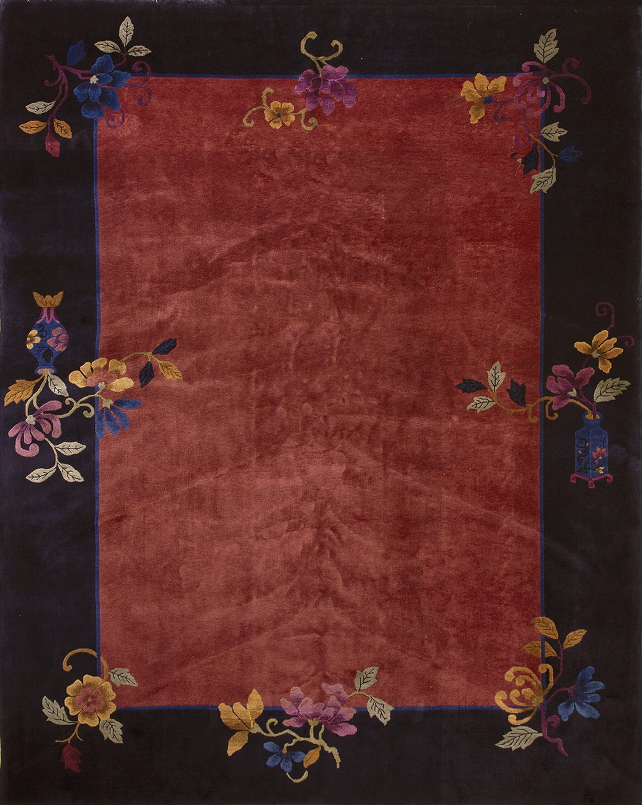 Elegant floral sprays—rendered in vibrant shades of blue, gold, and magenta—adorn the corners and edges, breaking the uniformity of the dark border. These stylized blossoms, sometimes emerging from decorative vases, exemplify the transitional period between classical Chinese iconography and the streamlined, modern sensibility of the 1920s. This fusion defines the highly collectible category of Chinese Art Deco rugs.
