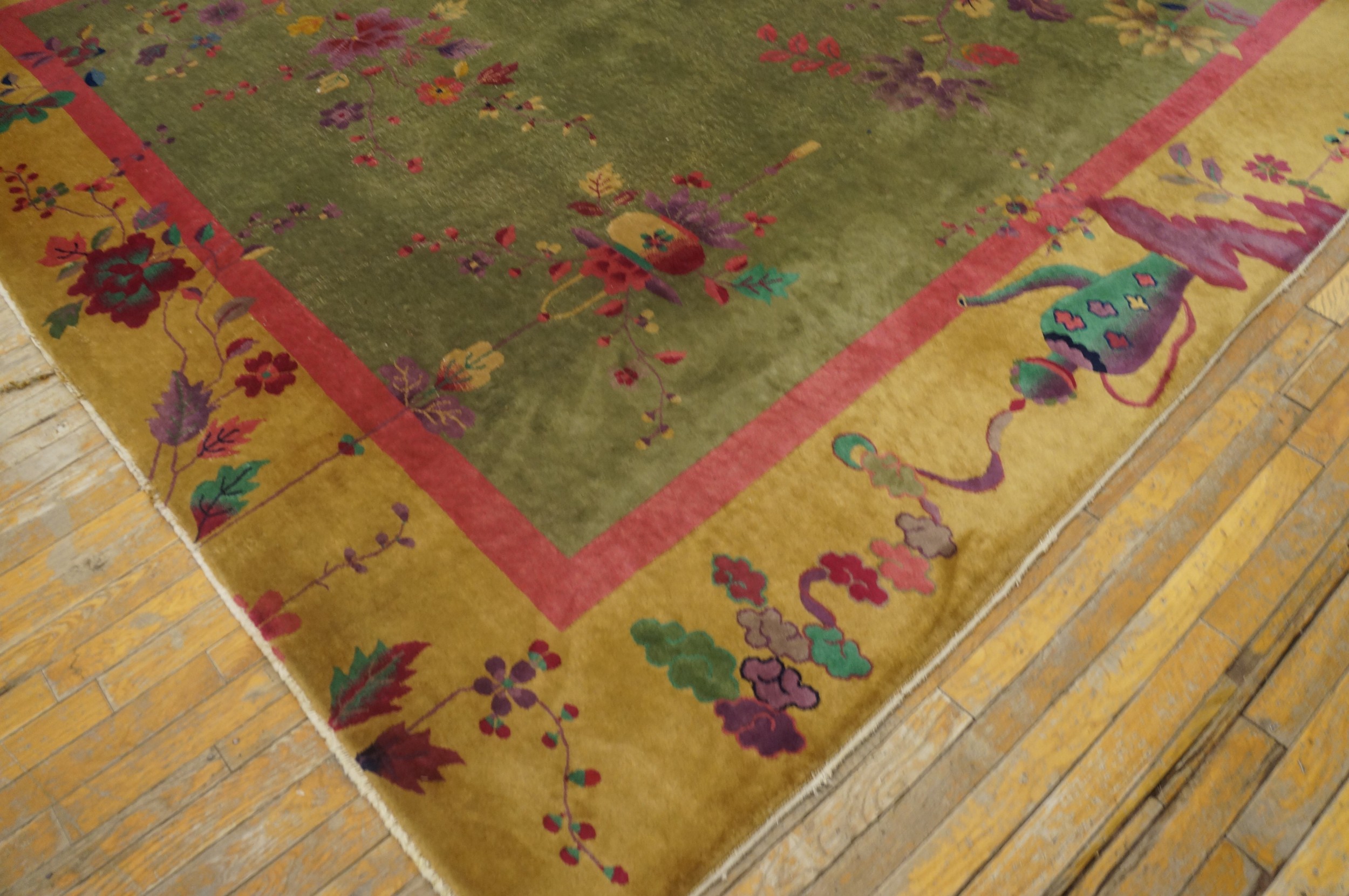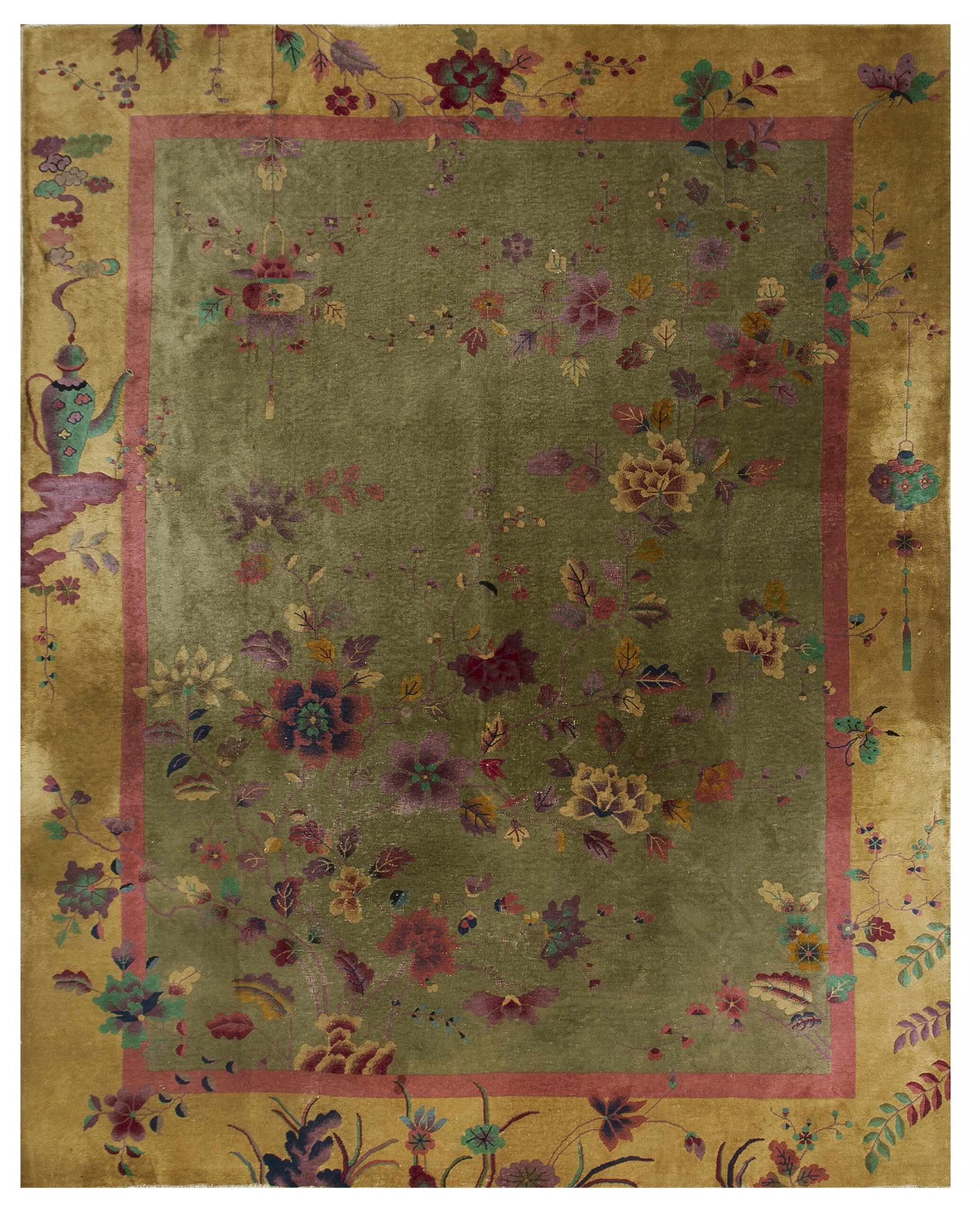 Antique Chinese – Art Deco Room Size Wool Green Rug, Circa Date: 1920s. This exceptional example of early 20th-century weaving represents the height of the Chinese Art Deco movement, blending traditional Eastern motifs with the bold, simplified aesthetic popular in the West. As one of our finest antique rugs, it showcases the innovative color palettes adopted during this period.