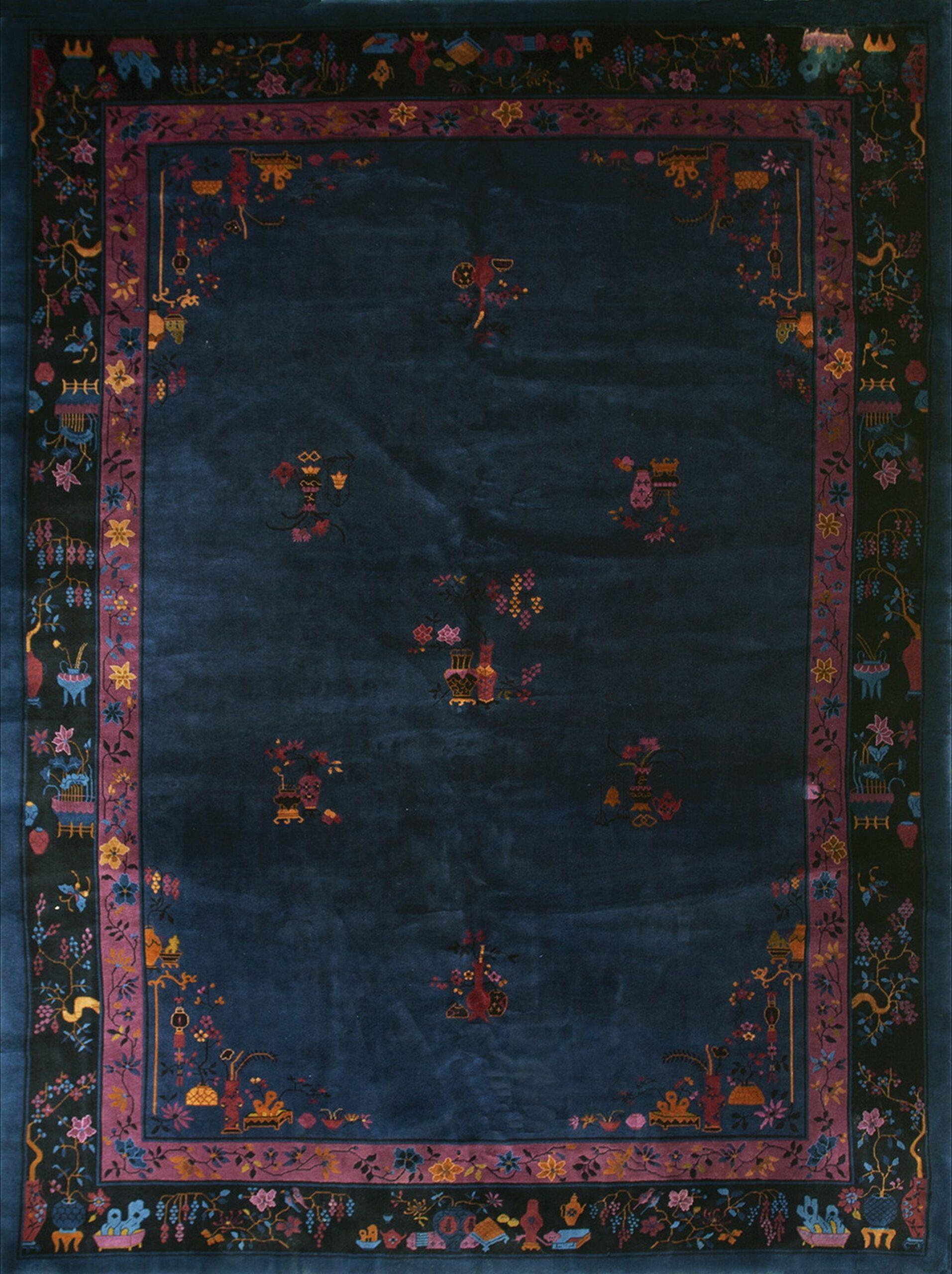 The luxurious, deep pile wool is dominated by a rich, saturated Manchester Blue field, a striking example of blue color rugs from this era. This intense hue provides a dramatic backdrop for the scattered, stylized motifs. The field’s minimalist composition is punctuated by small, finely detailed groupings of vases, scholarly objects, and flowering branches, characteristic of the period’s emphasis on negative space.