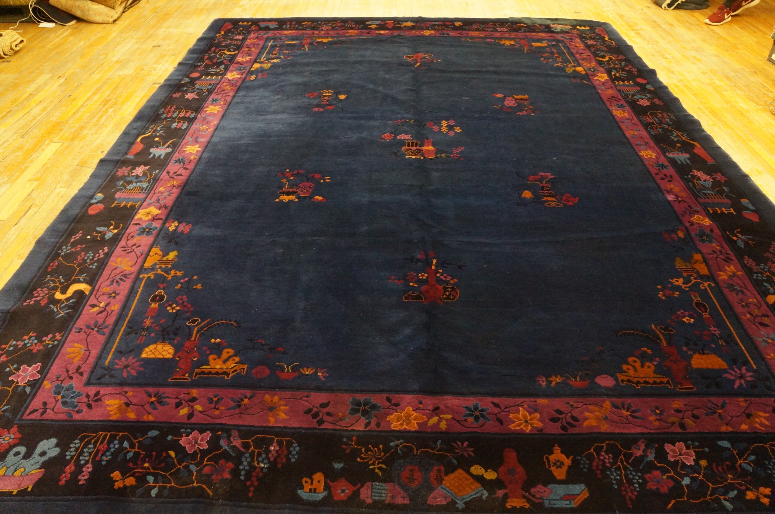Antique Chinese – Art Deco Room Size Wool – Manchester Blue Rug, Circa Date: 1920s. This exceptional piece exemplifies the dynamic cultural exchange of the early 20th century, where traditional Chinese iconography was reinterpreted through the lens of Western Art Deco modernism, making it a highly desirable example among antique rugs.