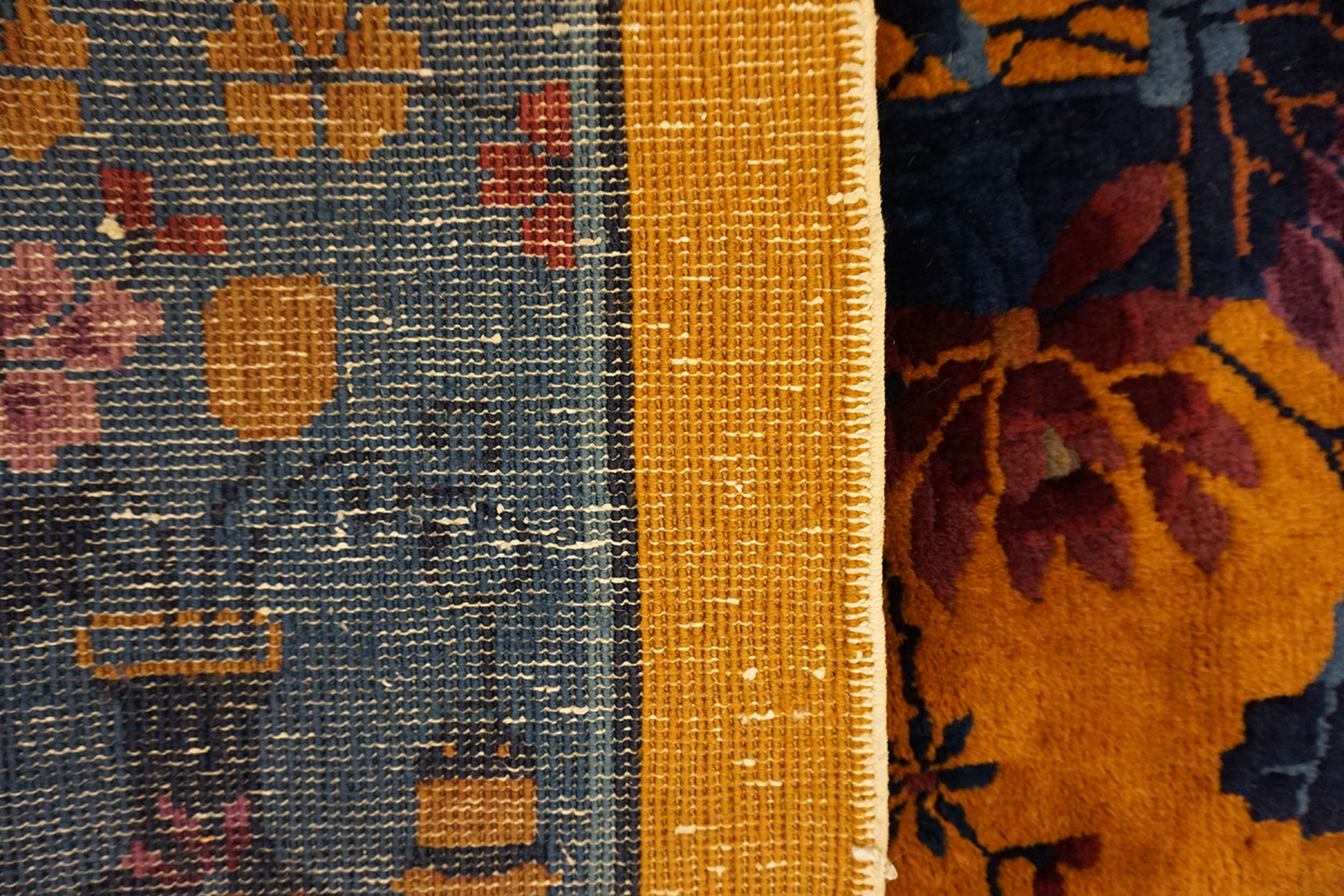 Woven from high-quality wool, typical of the finest antique rugs produced during this period of cultural synthesis, this piece represents the pinnacle of Chinese export weaving. The use of simplified forms and strong color blocking reflects the Western influence of the 1920s, yet retains traditional Chinese iconography within its borders.