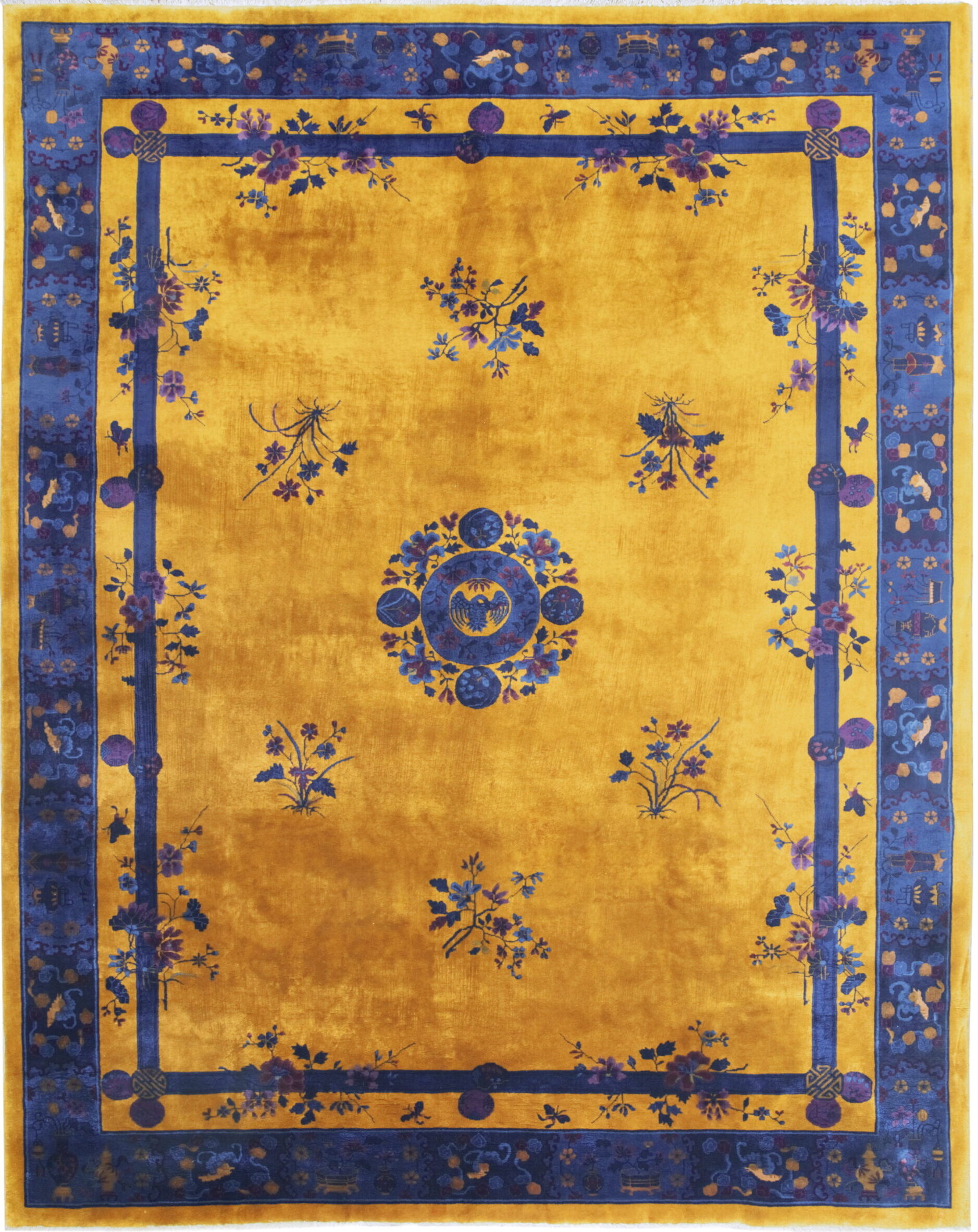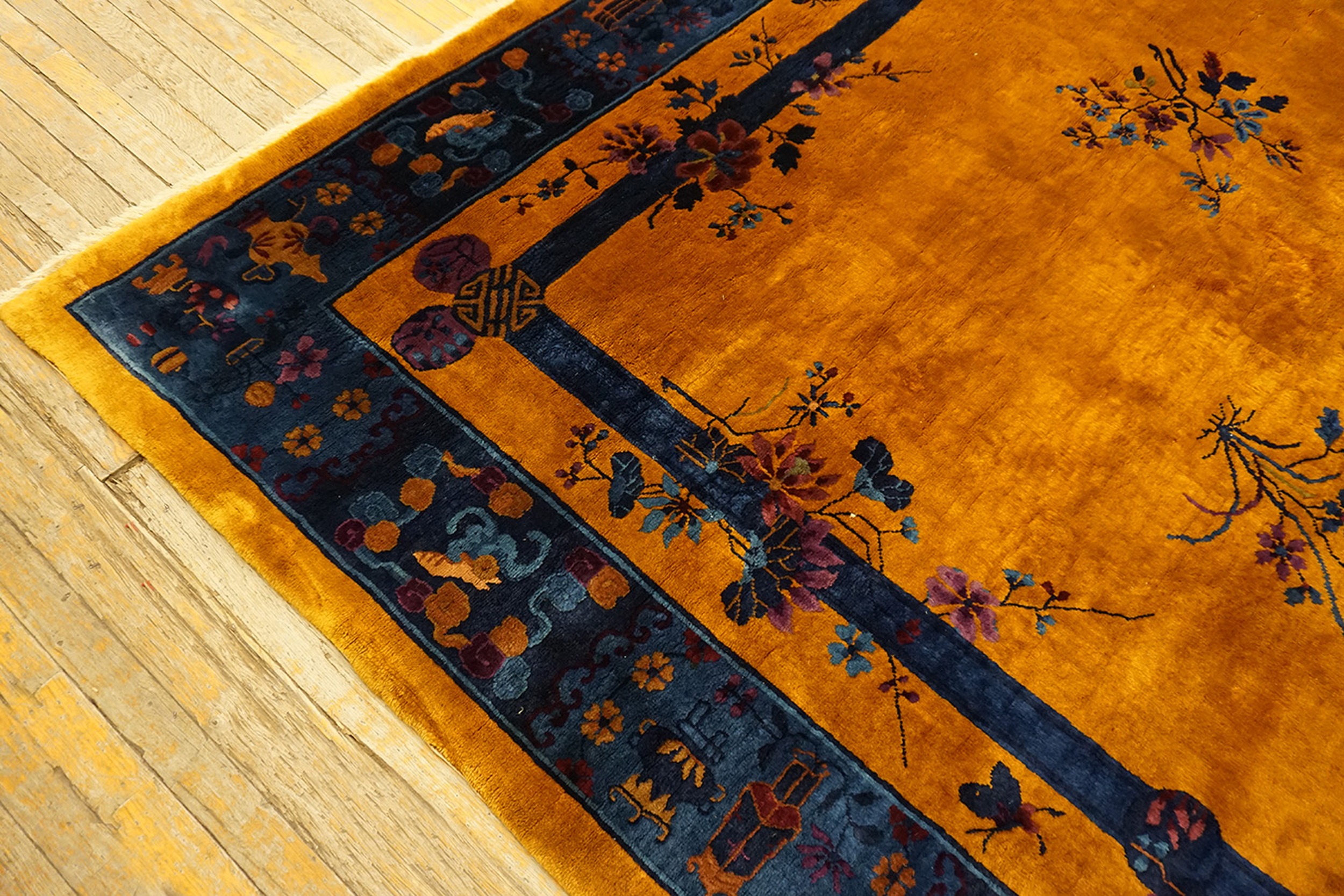 Antique Chinese – Art Deco Room Size Wool Manchester Yellow Rug, Circa Date: 1920s. This exceptional example of early 20th-century Chinese weaving captures the bold aesthetic of the Art Deco movement. The expansive field is dominated by the rich, luminous hue known as manchester Yellow, a color prized for its depth and velvety texture, providing a dramatic contrast to the deep indigo and royal blue accents.