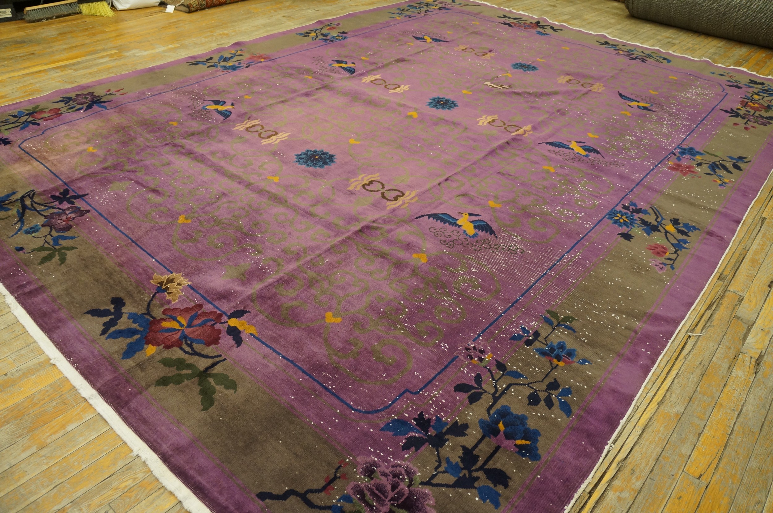 Antique Chinese – Art Deco Room Size Wool Purple Rug, Circa Date: 1920s. This exceptional piece of textile history is a prime example of the transitional style that emerged in the early 20th century. The bold design and saturated color palette distinguish it among antique rugs.