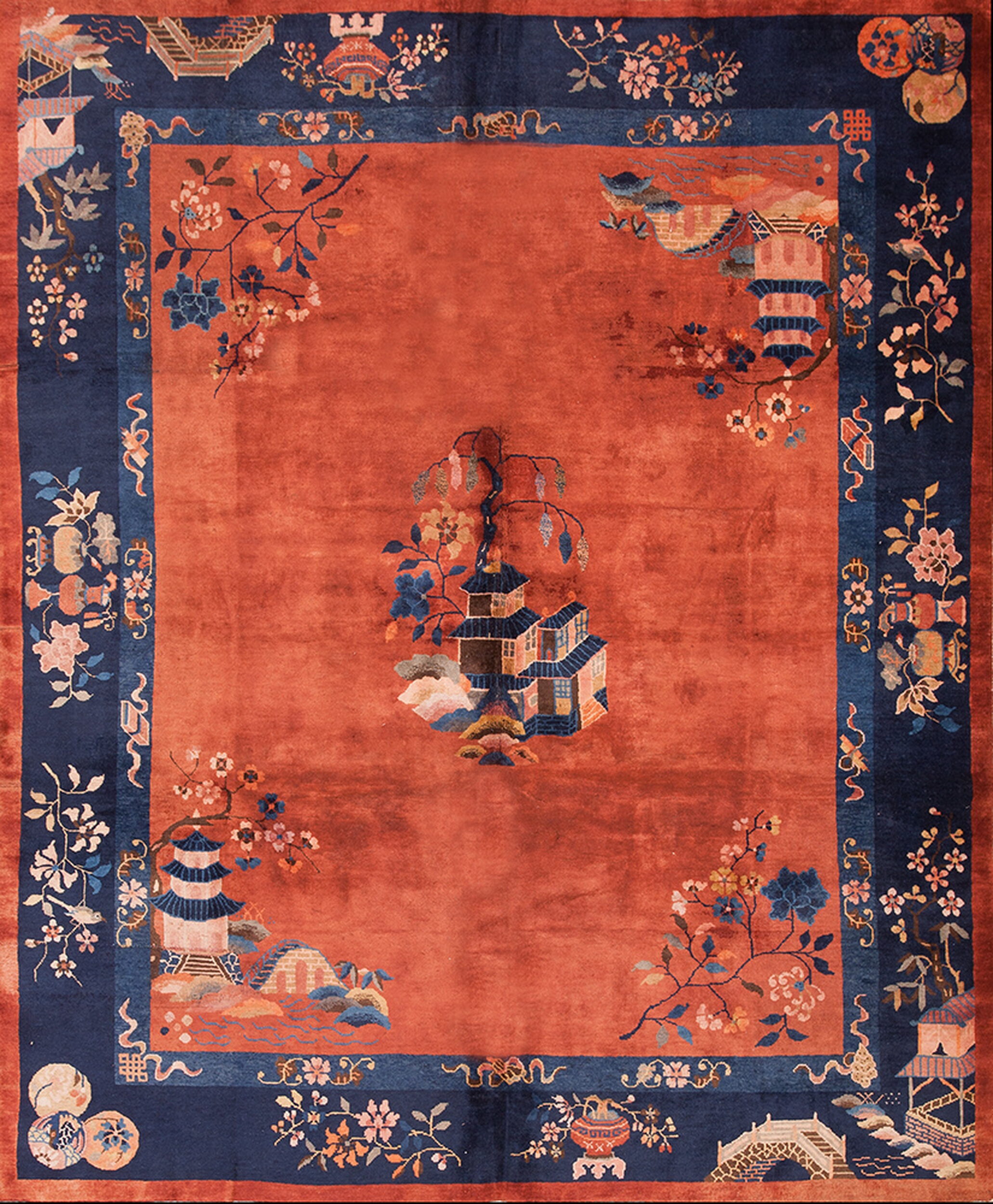 The juxtaposition of vibrant rust and cool navy, accented by soft pinks and pale blues in the details, gives this textile a timeless appeal that transcends its Art Deco roots. It represents a fascinating moment in design history when Eastern weaving traditions embraced global trends. Collectors seeking rare and visually arresting antique rugs will appreciate the condition and historical significance of this masterful Chinese weaving.