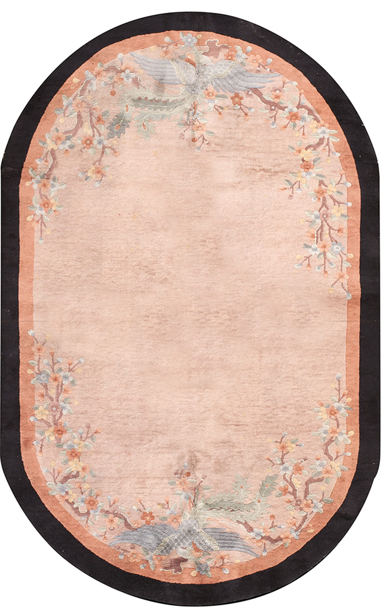 Woven in Chinese rugs workshops during the early 20th century, this design perfectly captures the fusion of traditional Eastern motifs with the streamlined aesthetic of the Art Deco movement. The central ground provides a serene canvas for the delicate, stylized floral branches and the pair of majestic birds depicted in soft pastels and muted blues.