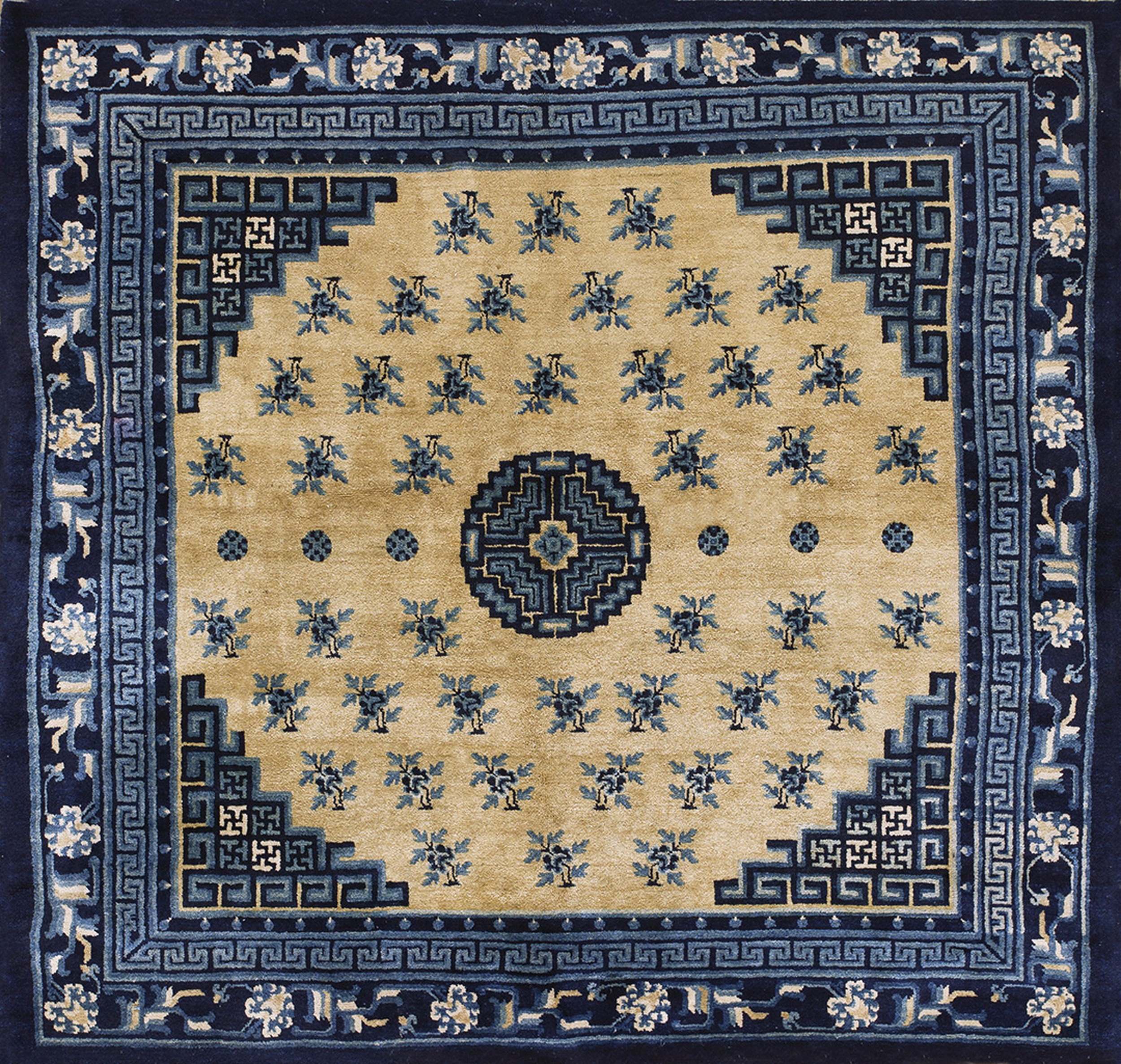 Antique Chinese – Baotou 1920s Rug, Country of Origin: China, Circa Date: 1920s. This exceptional square format Baotou piece exemplifies the sophisticated color palette and stylized design characteristic of early 20th-century Chinese rugs. The deep indigo field and borders are brilliantly contrasted by the luminous golden-tan ground, creating a visually striking composition typical of Northern Chinese weaving traditions.