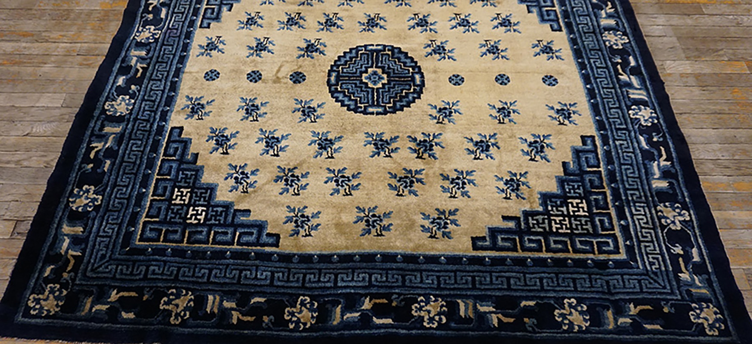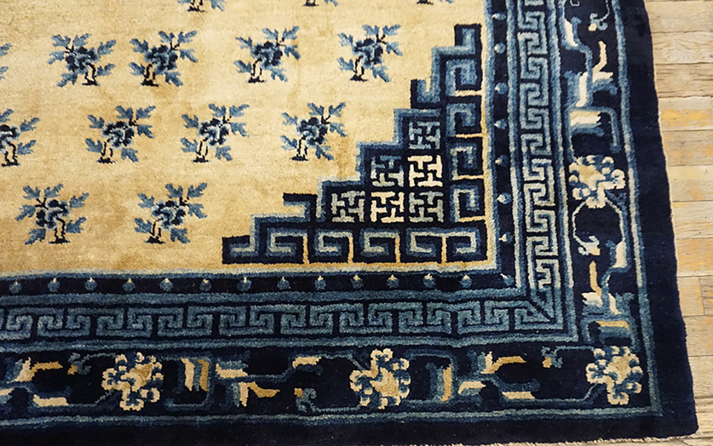A series of meticulously rendered borders frames the central design, incorporating classical Chinese elements such as the Greek key meander and stylized cloud bands. The precision of the geometric work in the corners, transitioning from the field’s stepped spandrels into the dark border, showcases the high technical skill of the weavers. This piece is a superb example within our collection of fine antique rugs.