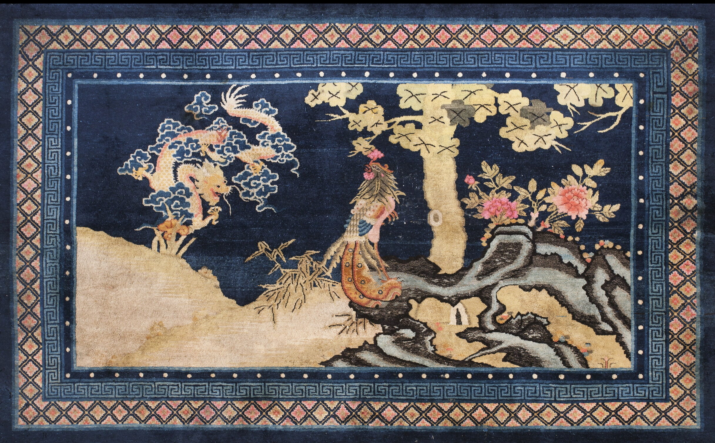 The masterful use of color is evident in the rich, almost midnight blue color rugs of the background, which enhances the vibrancy of the accent hues. Delicate pink peonies bloom from the rocky terrain, adding soft, feminine energy to the powerful mythological composition. The wool pile retains a beautiful luster, characteristic of Baotou weaving techniques.
