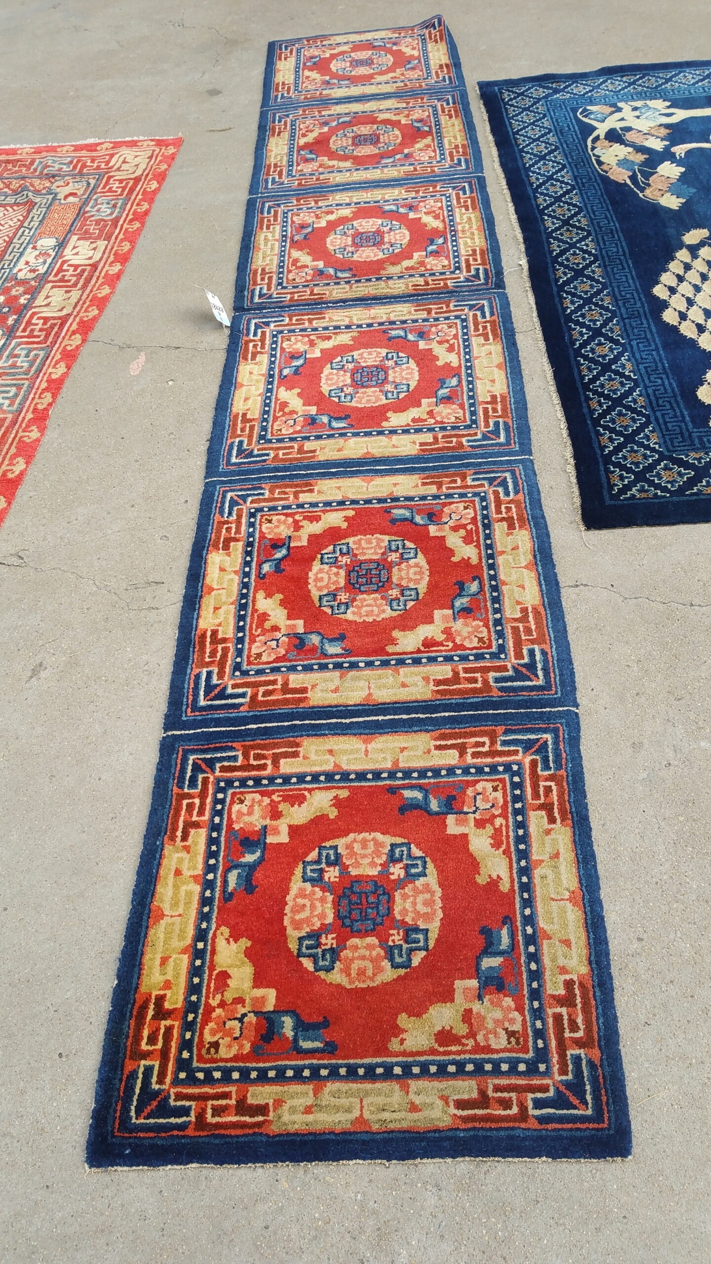 The design features a series of repeating, framed medallions, each containing stylized floral and Buddhist symbols, rendered with remarkable clarity. While the medallions are distinct, their continuous repetition along the length creates a unified visual rhythm, classifying the overall composition as an allover pattern well-suited to the runner format.