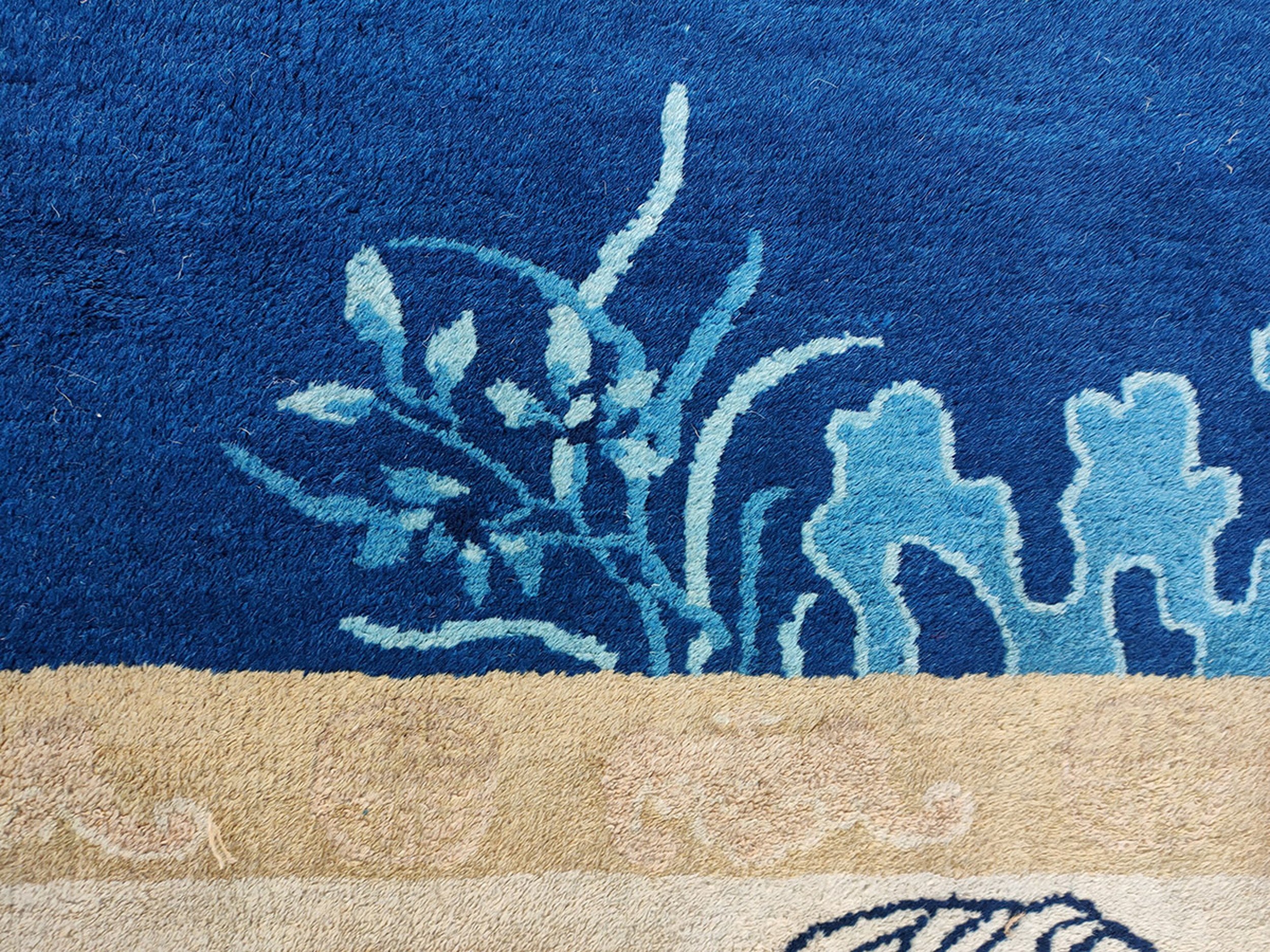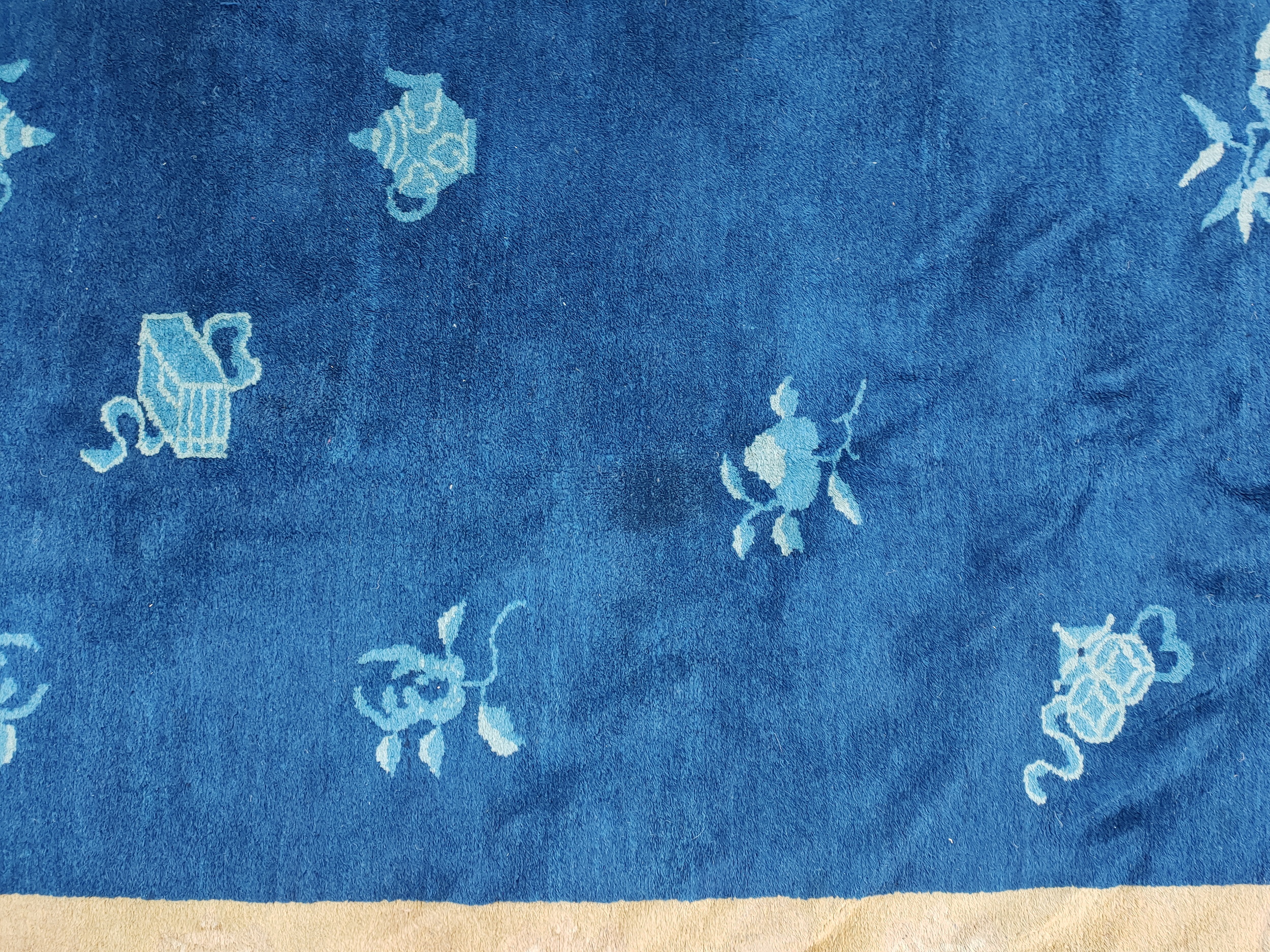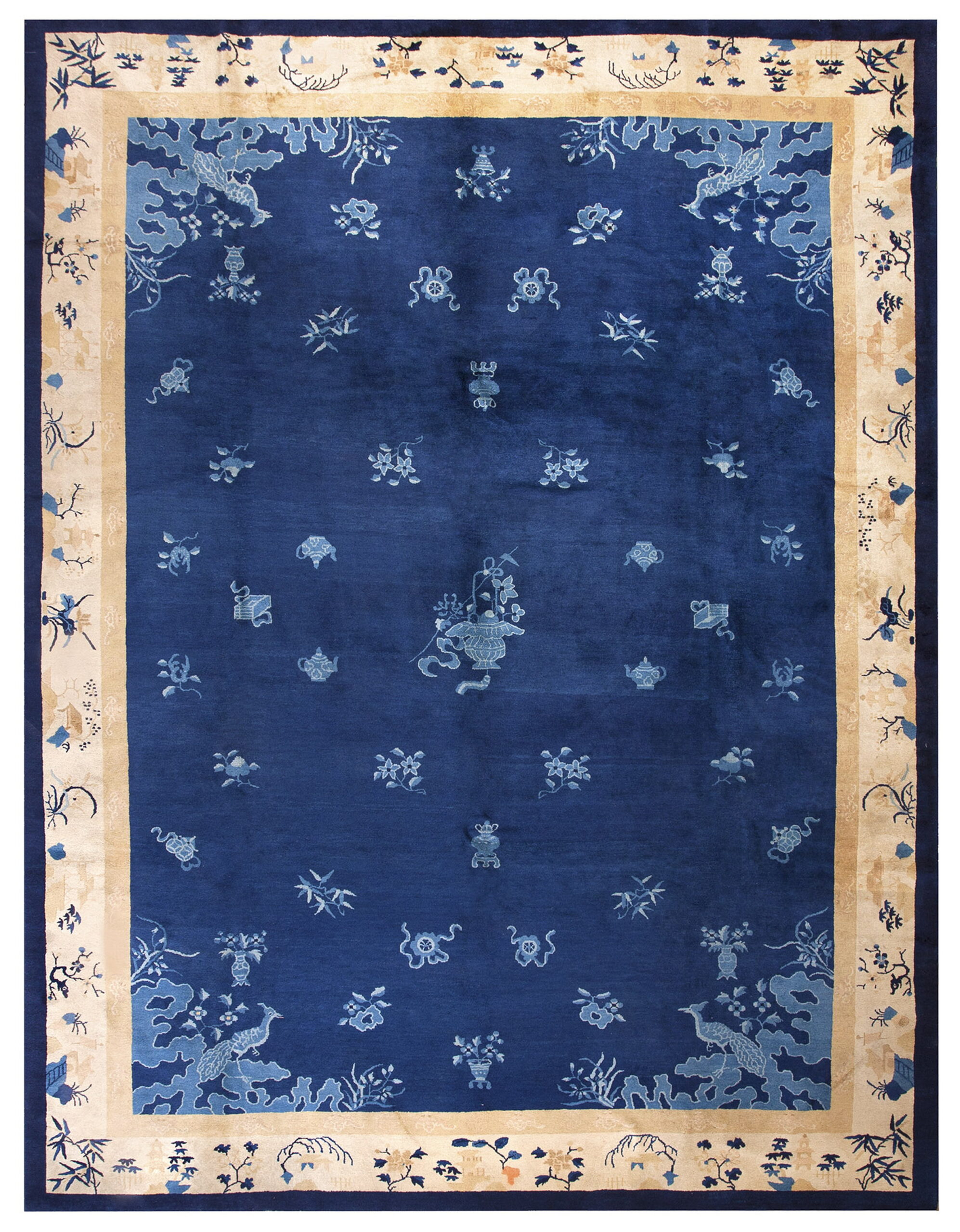 Antique Chinese Chinese – Peking Blue 1900s Rug, Circa Date: 1900s. This exquisite example of early 20th-century Chinese weaving showcases the classic Peking style, defined by its open composition and striking color contrast. The field is saturated with a rich, deep indigo, offering a magnificent foundation typical of the finest blue color rugs produced during this era.