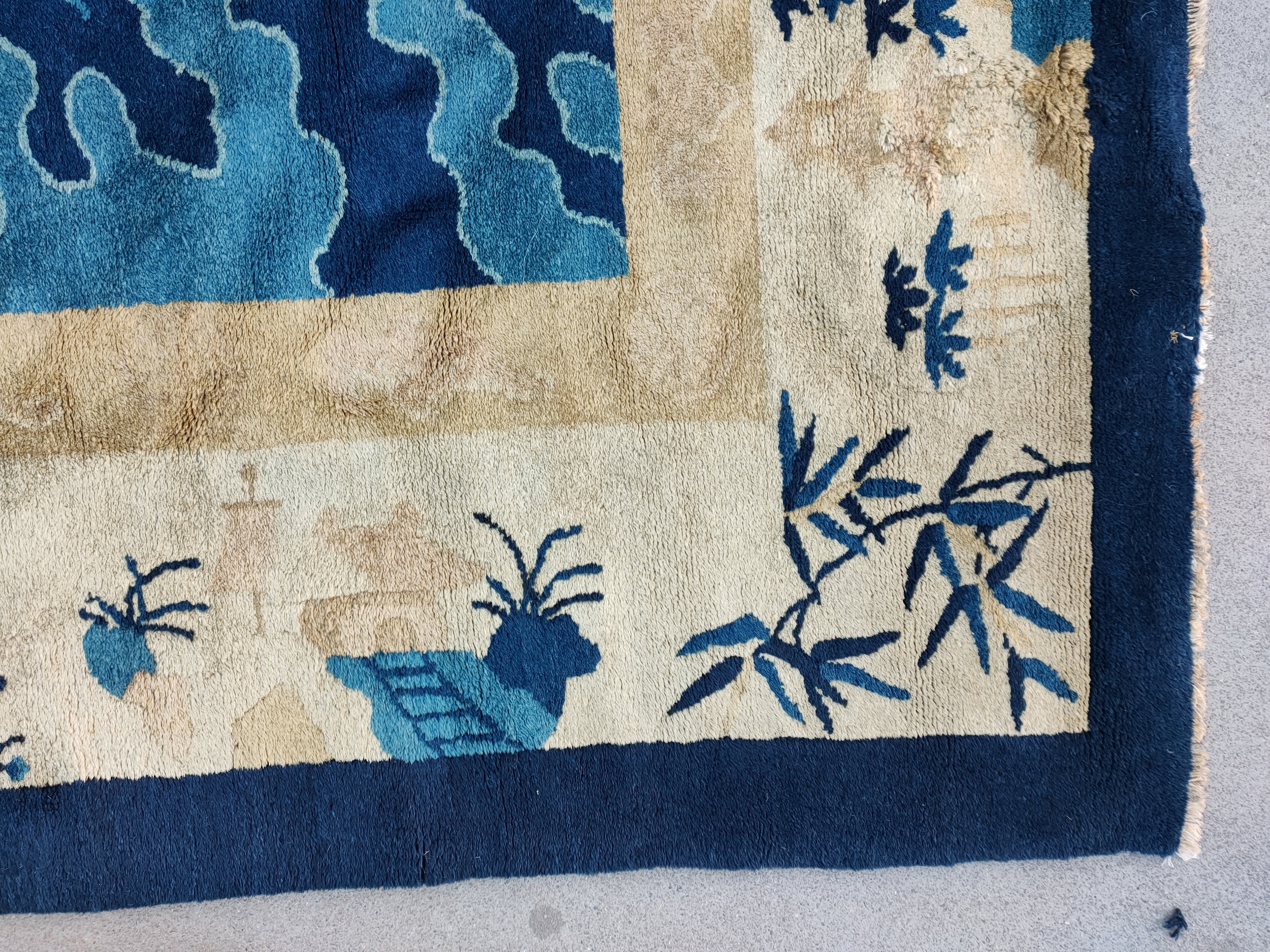 Framing the deep indigo field is a broad, contrasting border rendered in pale beige and tan, adorned with delicate landscape vignettes and floral sprays. The substantial dimensions of this textile make it an ideal choice for large reception areas, positioning it perfectly within the category of room size rugs, offering both historical resonance and enduring elegance.
