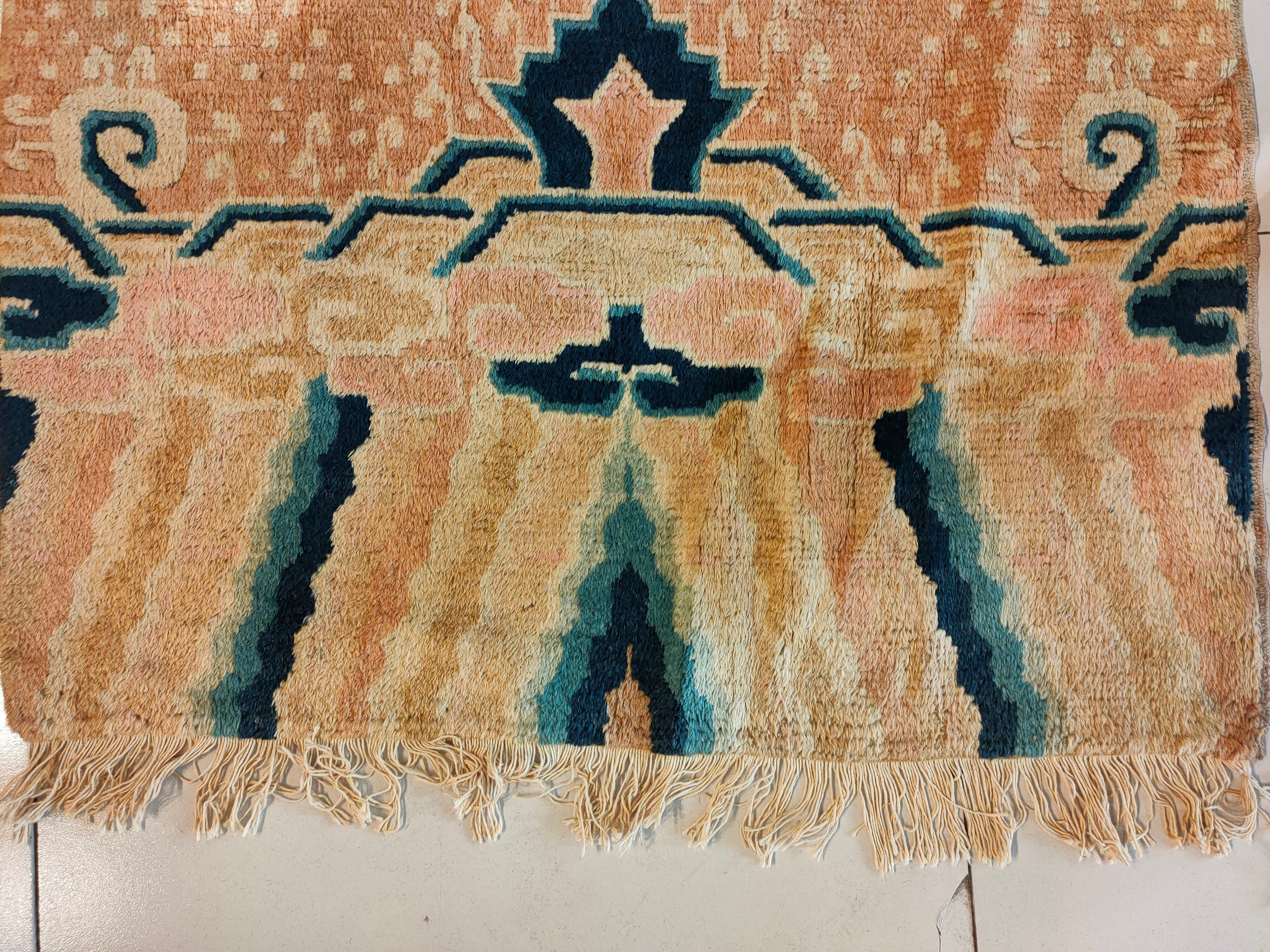 Below the swirling clouds, the base of the carpet features the traditional Lishui stripe, representing the sea and mountains—the foundation of the earth. Unlike typical allover designs found in contemporaneous Chinese carpets, this pictorial format uses the field to tell a specific narrative of power and ascent, concluding the visual journey with a powerful, balanced composition.