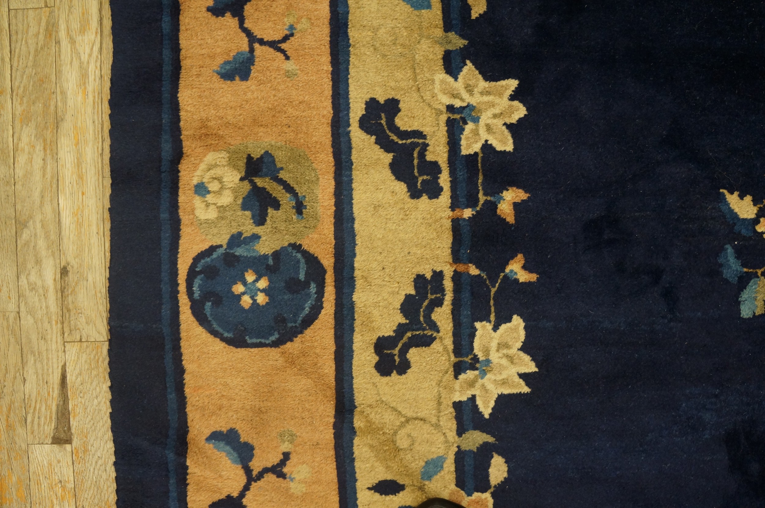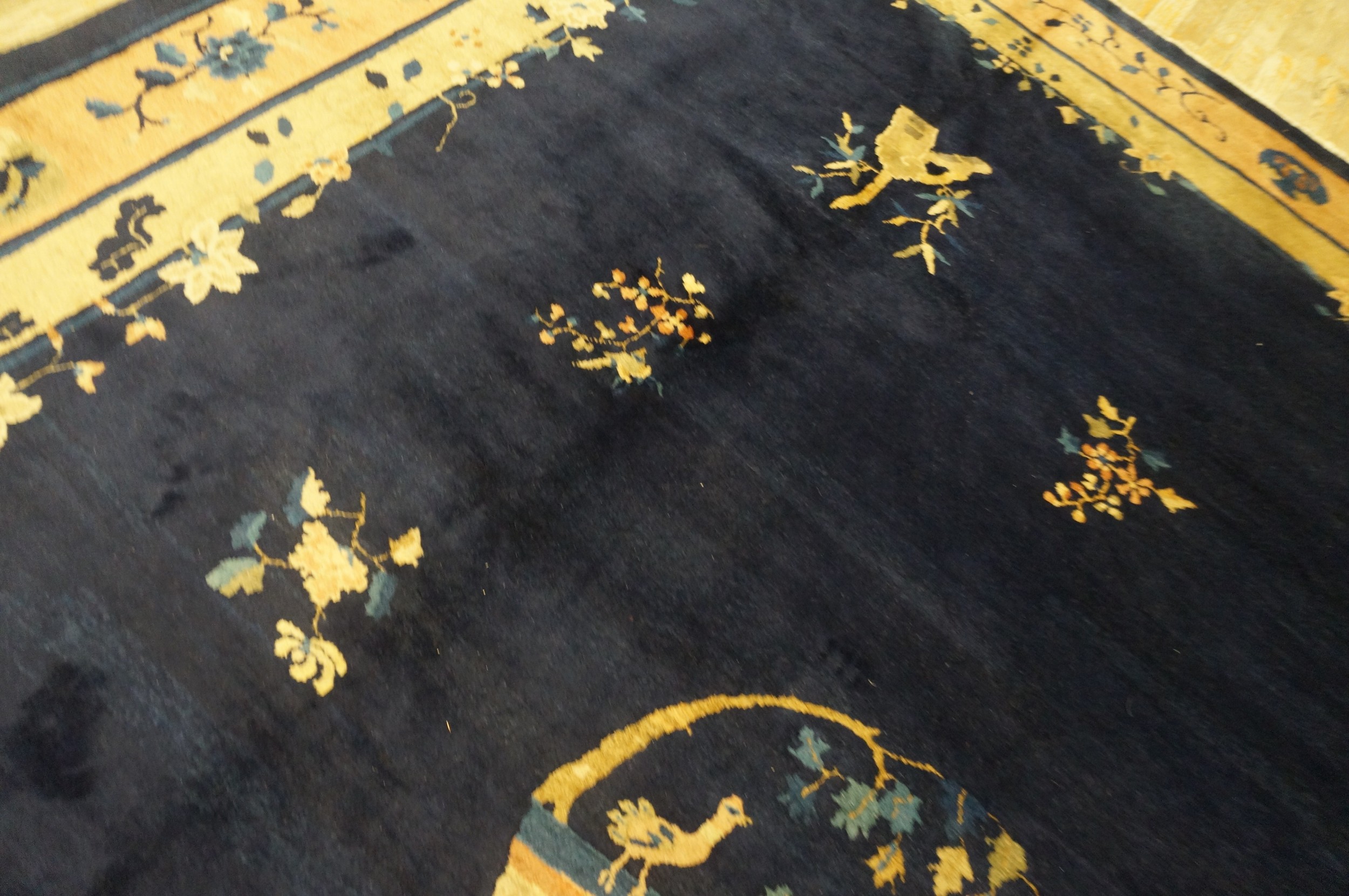 Antique Chinese Floral, Medallion Blue 1920s Rug, Circa Date: 1920s. This exceptional example of early 20th-century weaving showcases the sophisticated design sensibilities of Chinese Art Deco. The composition is defined by its dramatic, saturated field color, typical of high-quality antique rugs from this period.