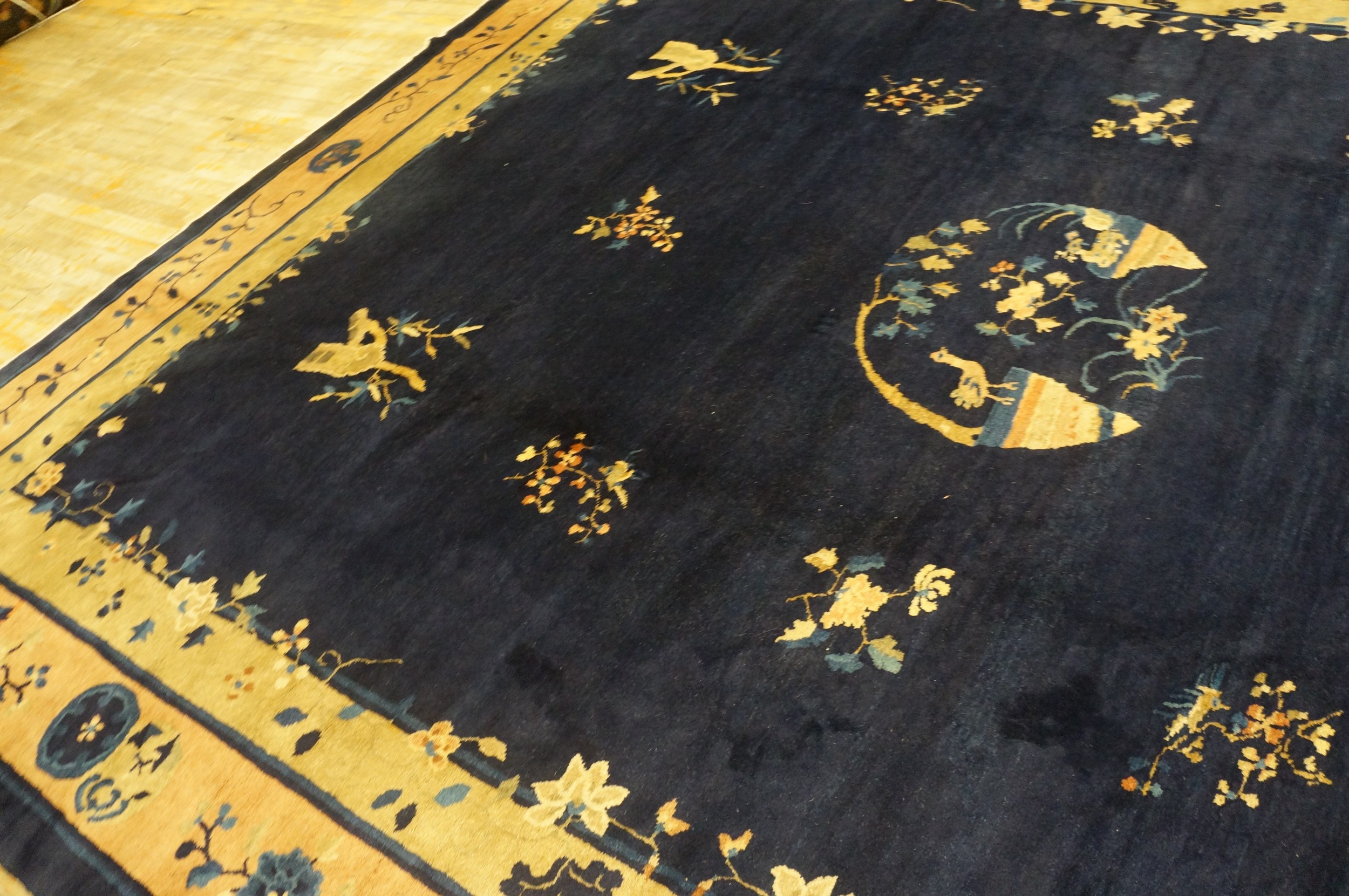 The field presents a striking expanse of deep indigo, providing a powerful contrast to the delicately rendered motifs. These stylized elements—including birds, flowering branches, and bamboo—are sparsely distributed, allowing the rich blue color rugs to dominate the visual space, lending the piece a tranquil yet commanding presence.