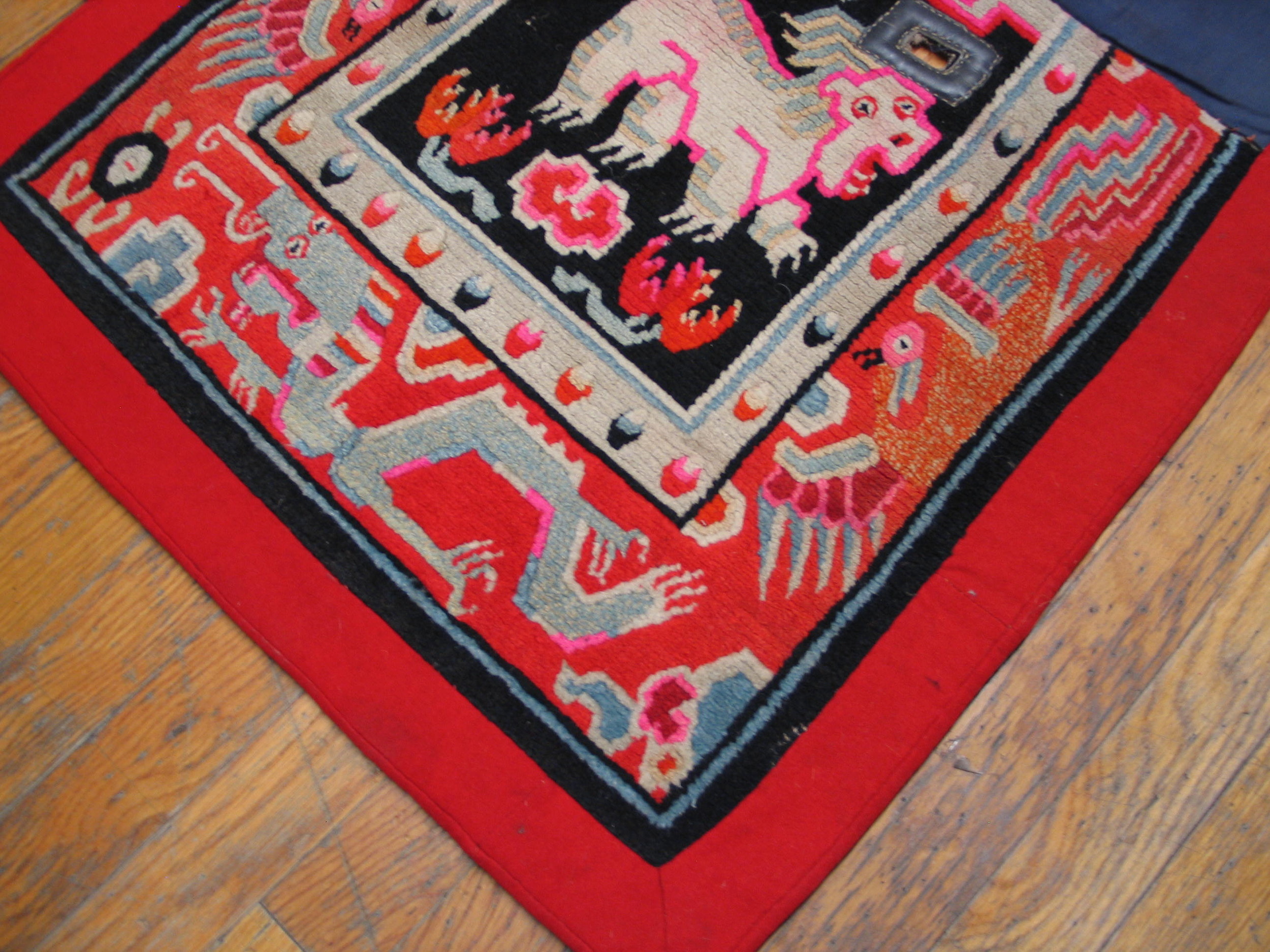 Antique Chinese Chinese Brown 1900s Rug, Circa Date: 1900s. This exceptional textile piece, likely a ceremonial saddle cover or panel, offers a vivid snapshot of early 20th-century Chinese weaving artistry. Its construction and saturated palette place it firmly within the tradition of fine antique rugs.